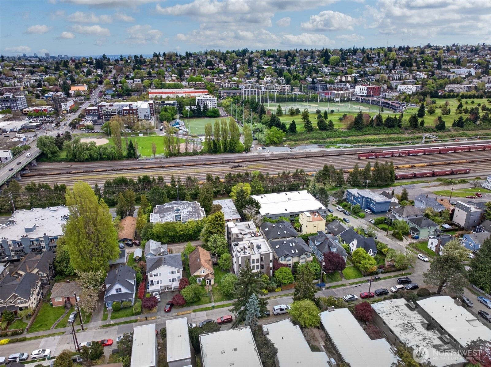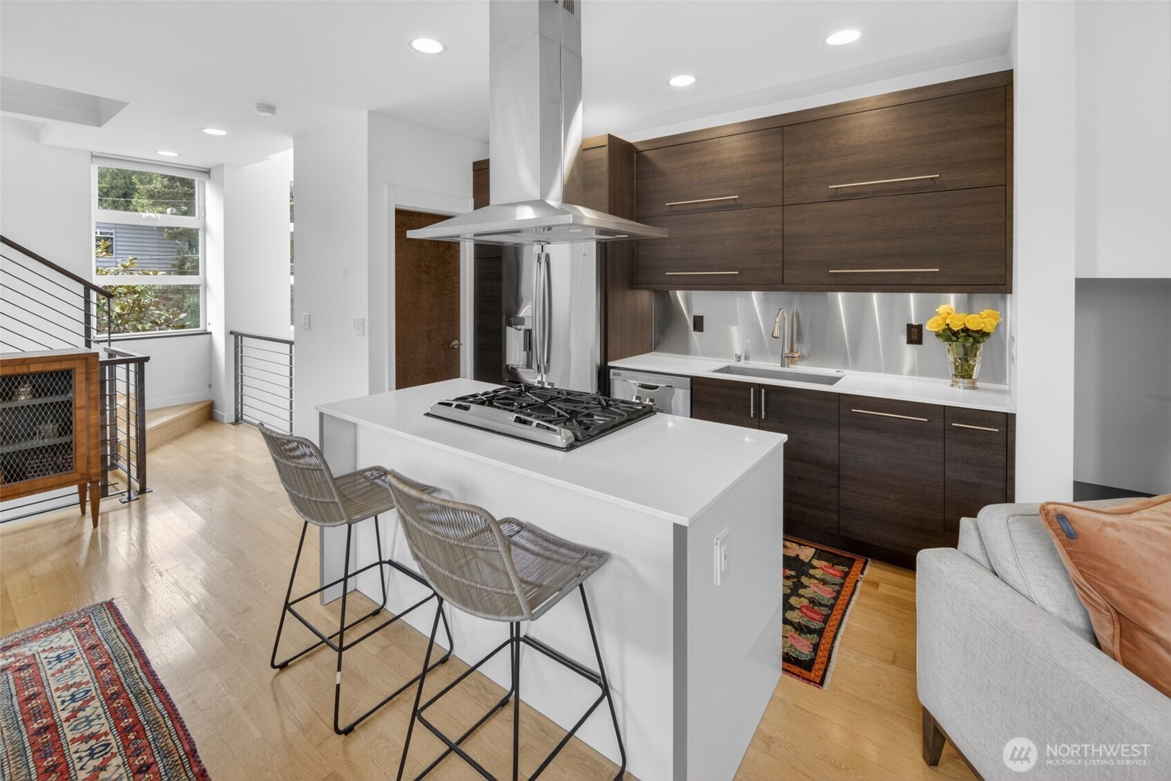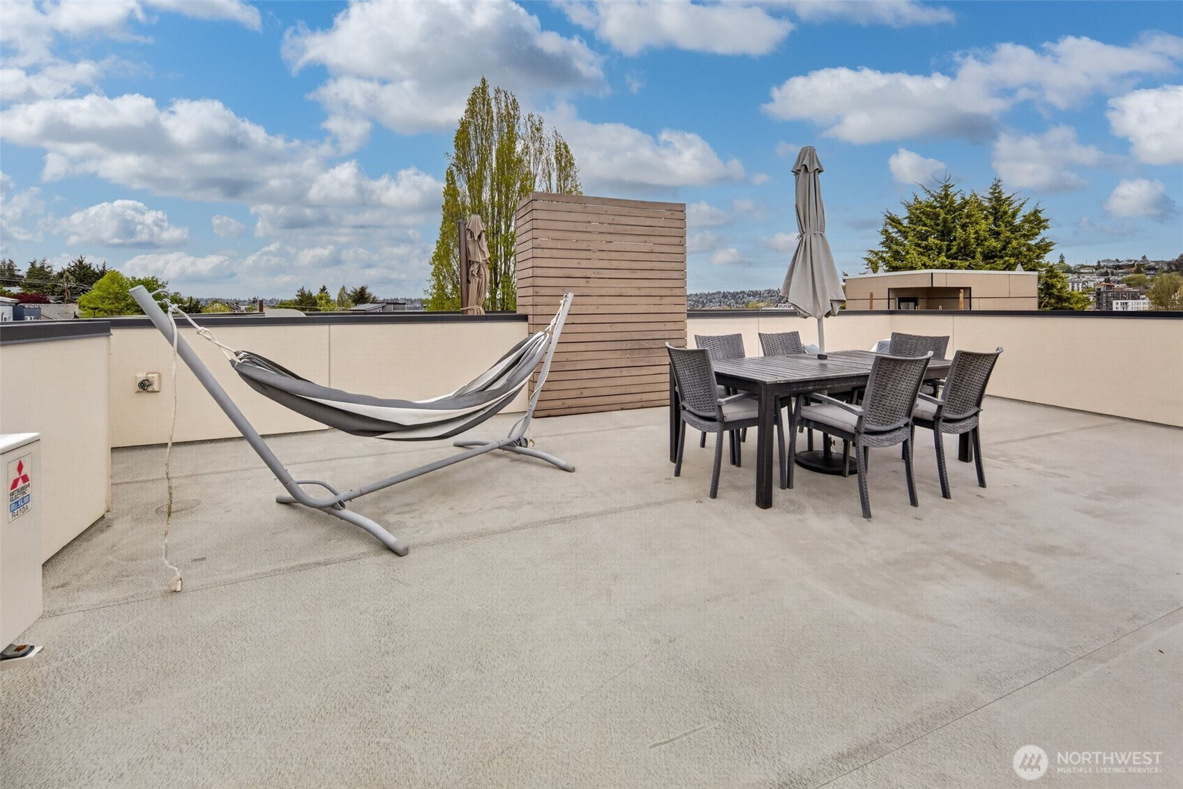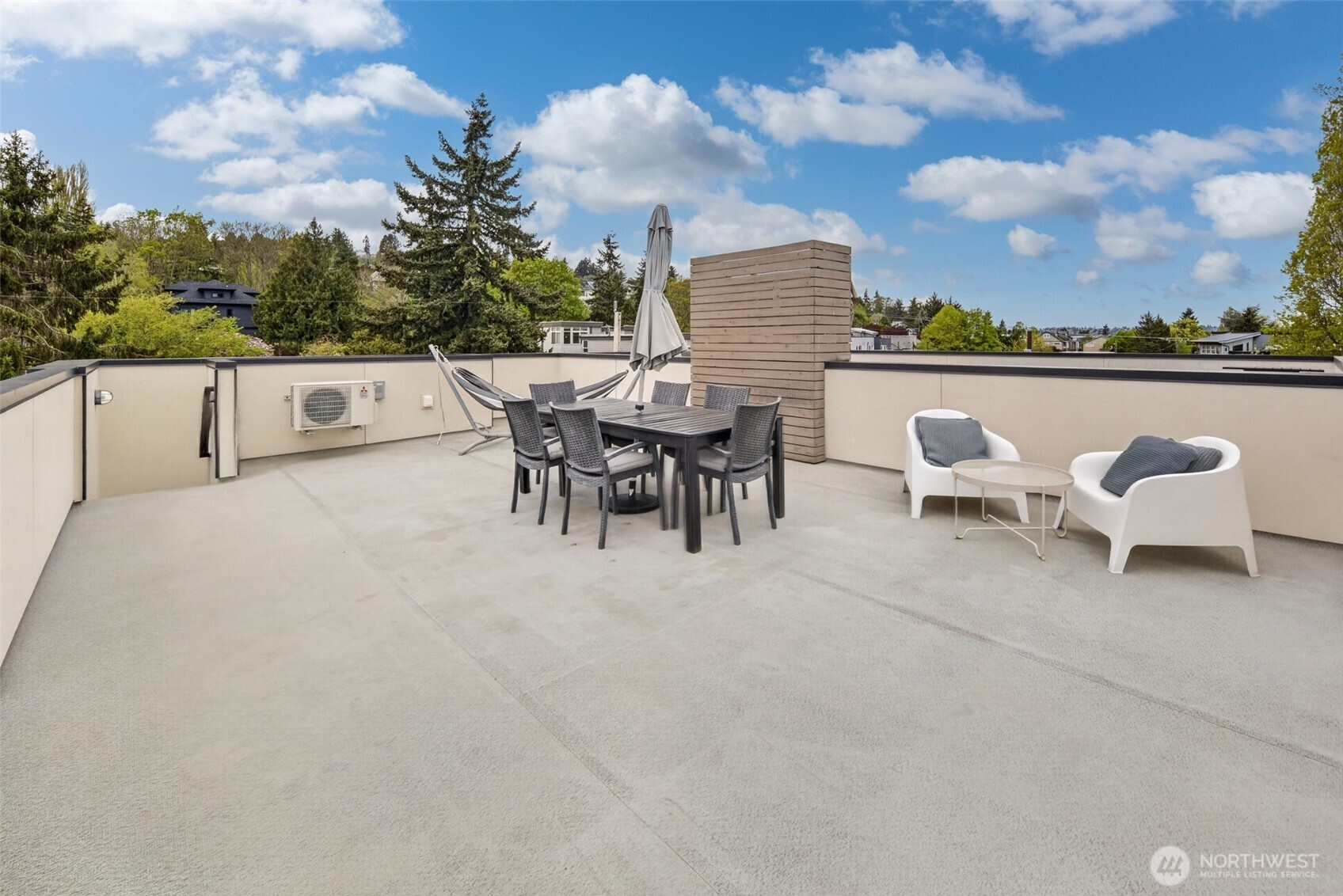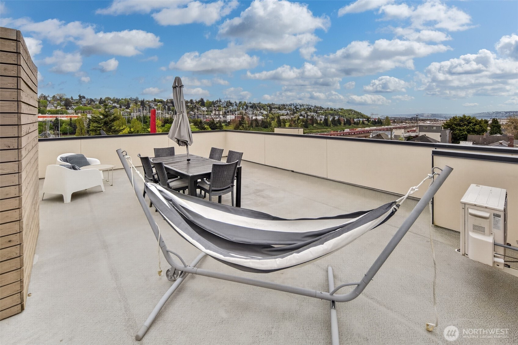 Discover Southeast Magnolia living from this architecturally distinctive 2015 townhome, where a soaring atrium rises the full height of the building, connecting all three levels through open steel-cable railings and tall windows that pull natural light deep into every floor. The entry level holds two bedrooms alongside a laundry room, keeping the main living level open for what it does best. Up one floor, the open plan is anything but generic. Corner windows facing east pour morning light across a main level designed with intention, a proper dining space alongside a distinct living area, anchored by a gas fireplace. Dark flat-panel cabinetry runs against white quartz counters and a clean island with bar seating. GE appliances and a Zephyr range hood complete a kitchen that is suited for weeknight dinners and weekend hosting. This is not your everyday townhome floor plan. The primary suite occupies the top floor with its own private balcony. The en-suite bath has a dual vanity, dark cabinetry, and a glass-enclosed shower and soaking tub. Above that, the rooftop deck delivers territorial and water views with real privacy from neighboring units. Step outside and you are choosing between a morning at Discovery Park, an afternoon at Chittenden Locks watching boats work through to Lake Union, or dinner at Chinook's with a view across the marina. Dedicated off-alley parking. This is the Magnolia lifestyle at its best. Come experience it.