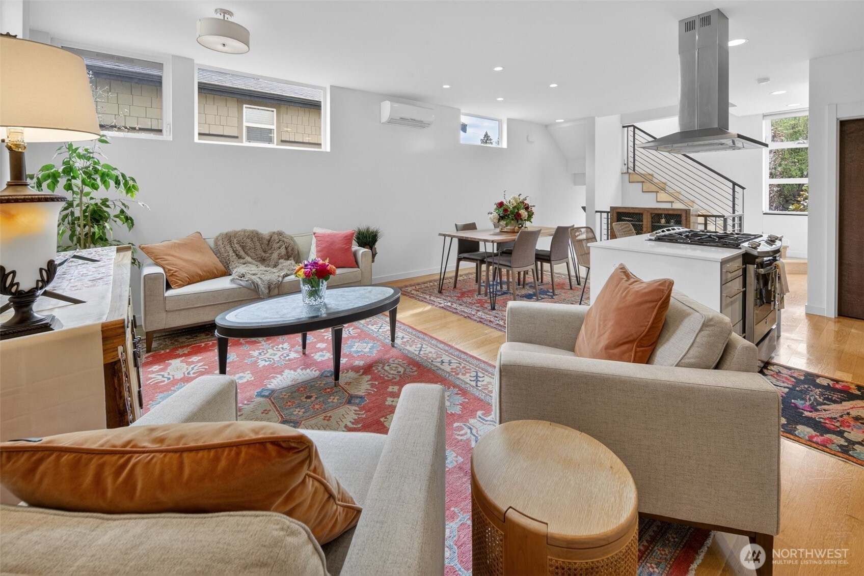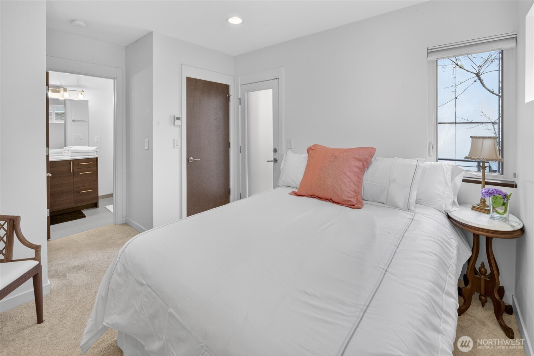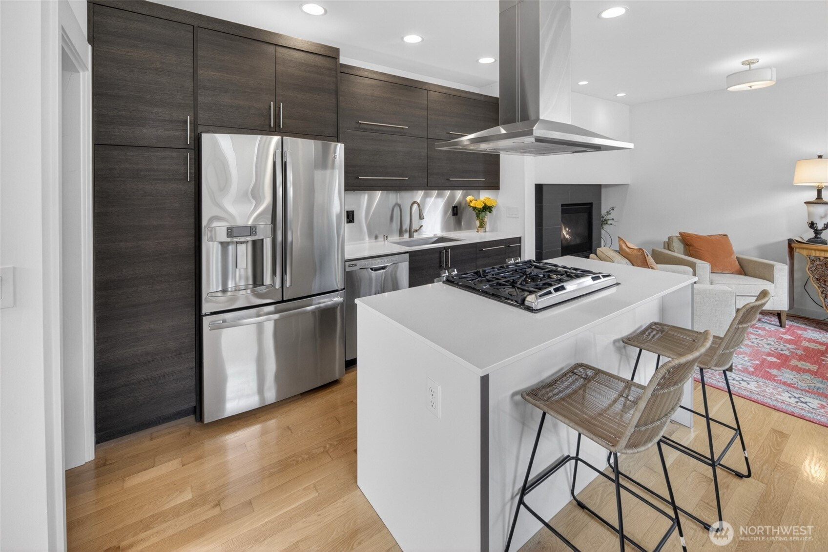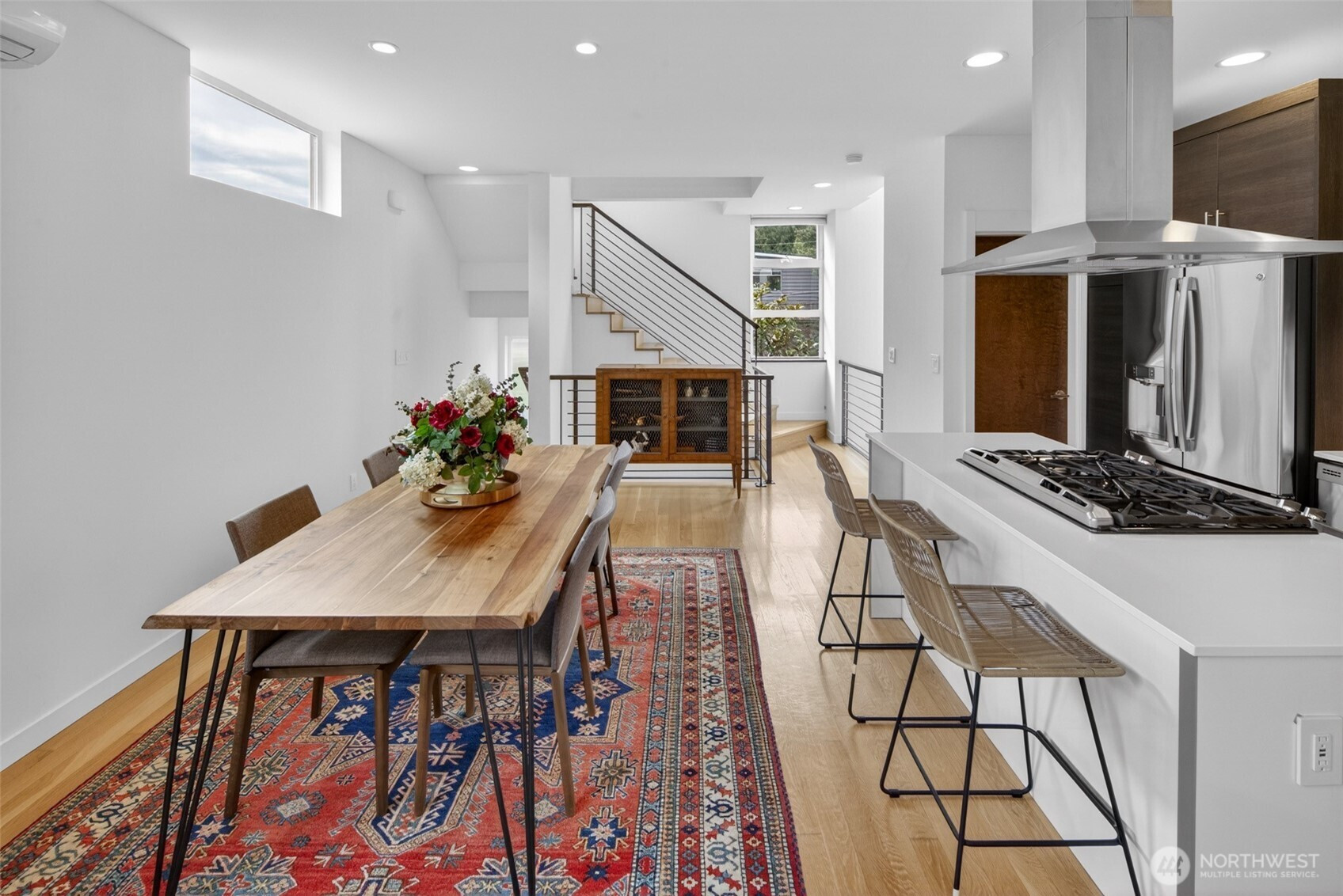 Discover Southeast Magnolia living from this architecturally distinctive 2015 townhome, where a soaring atrium rises the full height of the building, connecting all three levels through open steel-cable railings and tall windows that pull natural light deep into every floor. The entry level holds two bedrooms alongside a laundry room, keeping the main living level open for what it does best. Up one floor, the open plan is anything but generic. Corner windows facing east pour morning light across a main level designed with intention, a proper dining space alongside a distinct living area, anchored by a gas fireplace. Dark flat-panel cabinetry runs against white quartz counters and a clean island with bar seating. GE appliances and a Zephyr range hood complete a kitchen that is suited for weeknight dinners and weekend hosting. This is not your everyday townhome floor plan. The primary suite occupies the top floor with its own private balcony. The en-suite bath has a dual vanity, dark cabinetry, and a glass-enclosed shower and soaking tub. Above that, the rooftop deck delivers territorial and water views with real privacy from neighboring units. Step outside and you are choosing between a morning at Discovery Park, an afternoon at Chittenden Locks watching boats work through to Lake Union, or dinner at Chinook's with a view across the marina. Dedicated off-alley parking. This is the Magnolia lifestyle at its best. Come experience it.