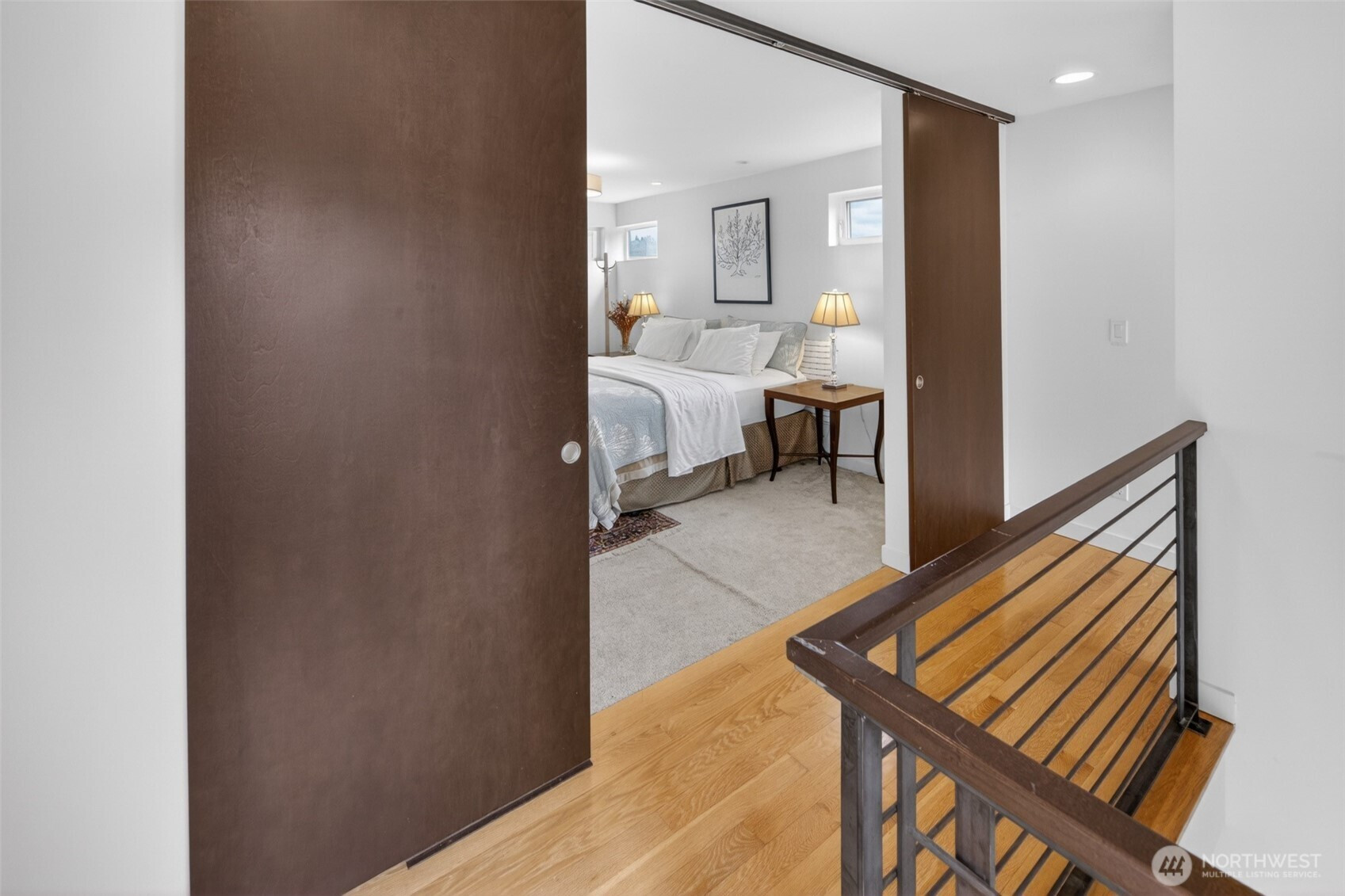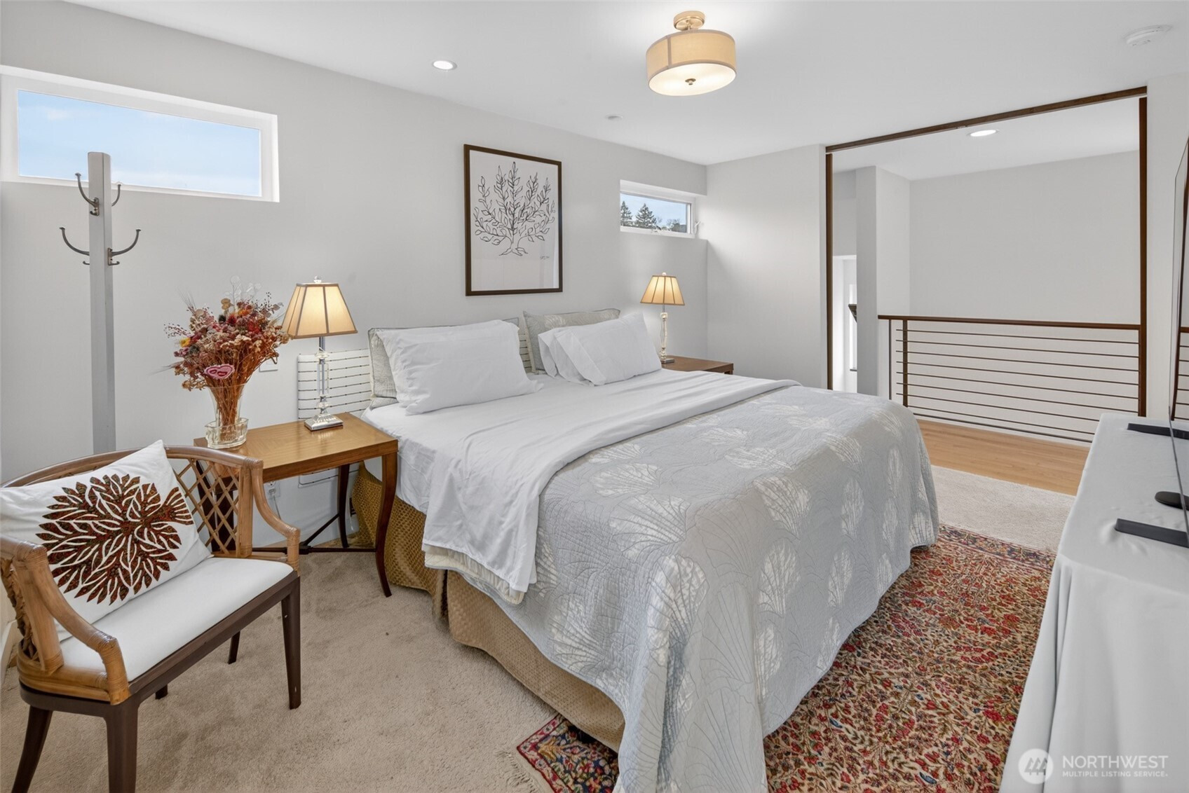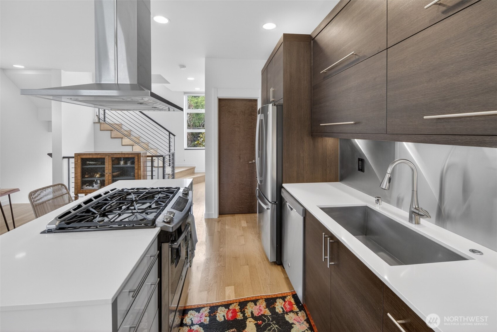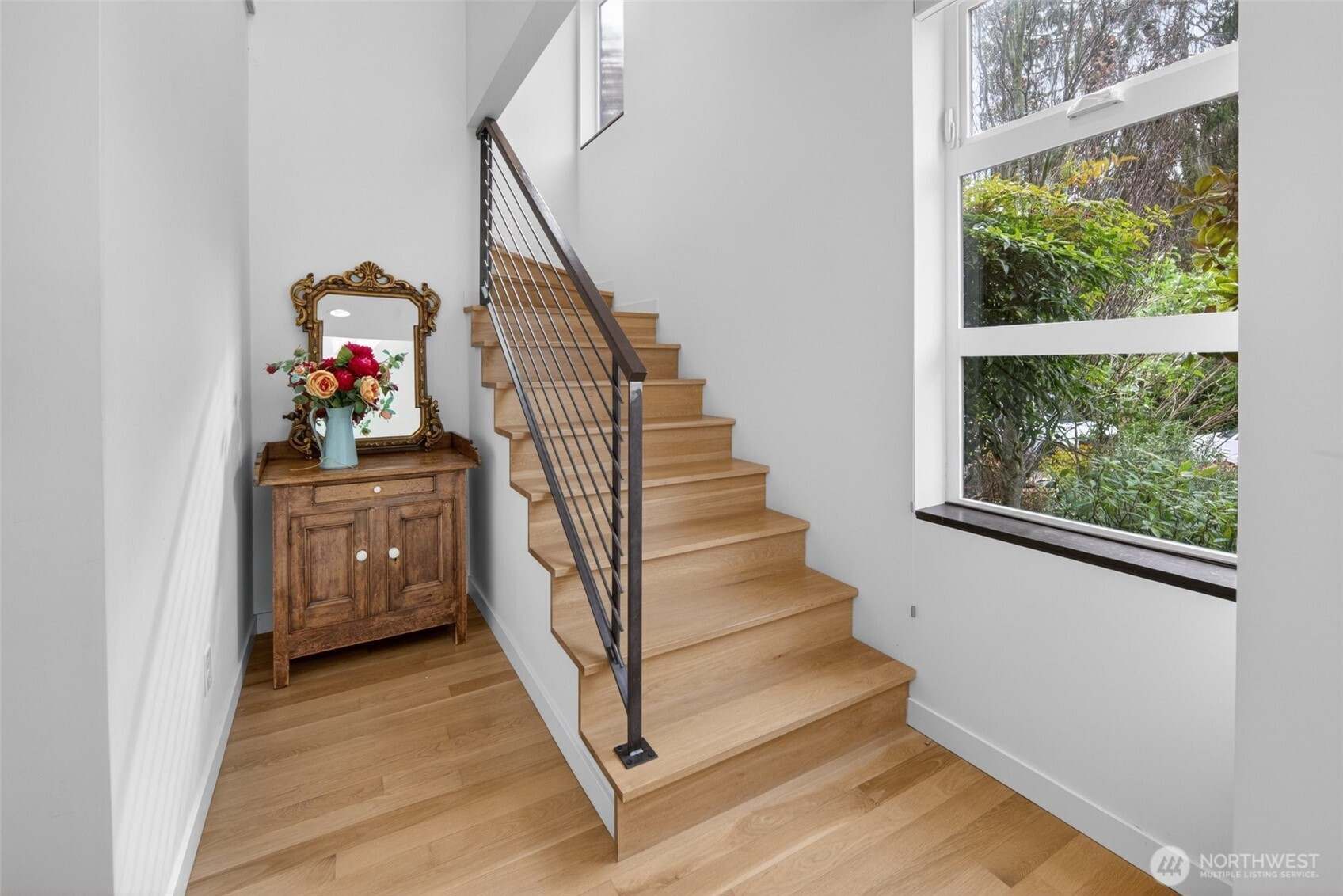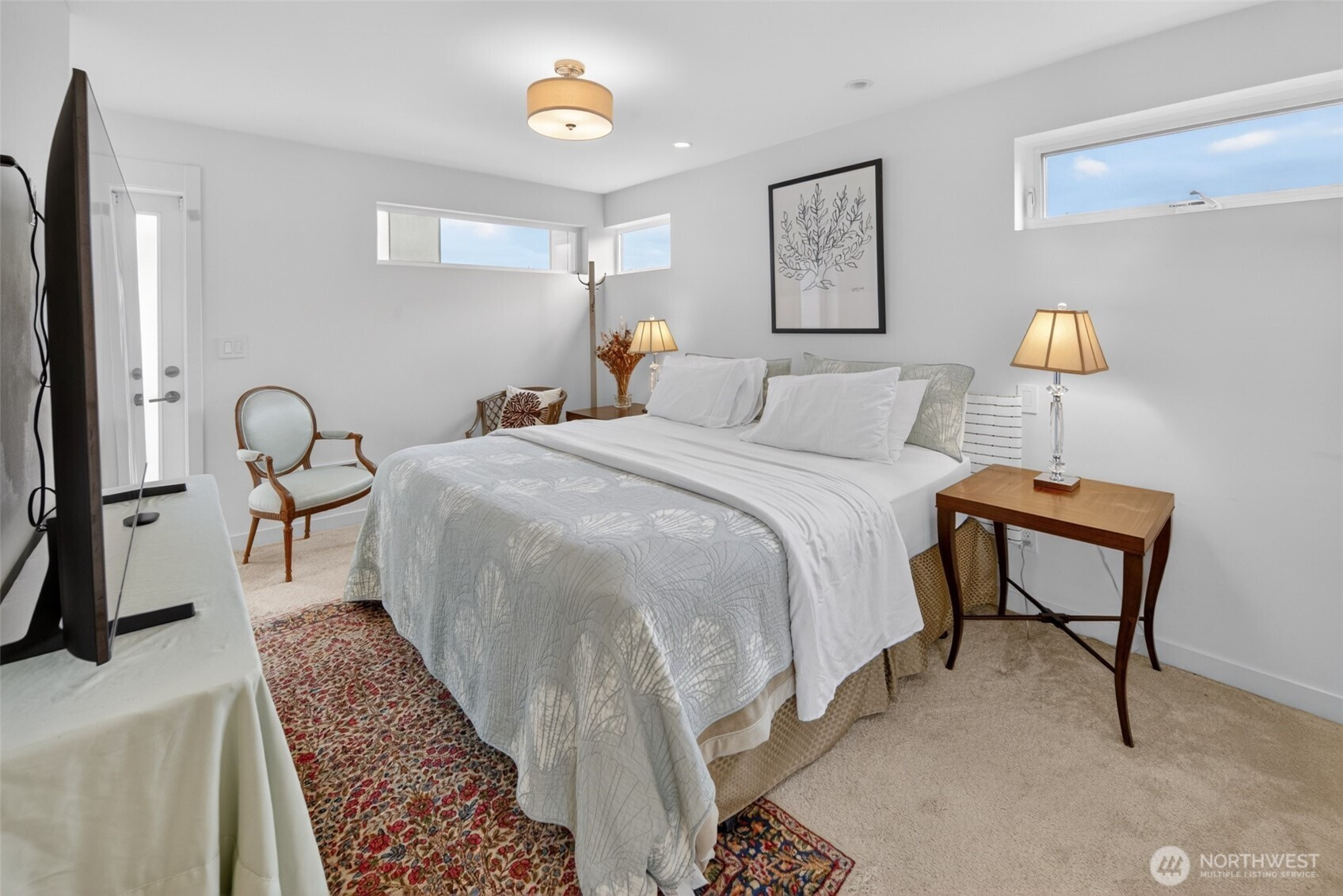 Discover Southeast Magnolia living from this architecturally distinctive 2015 townhome, where a soaring atrium rises the full height of the building, connecting all three levels through open steel-cable railings and tall windows that pull natural light deep into every floor. The entry level holds two bedrooms alongside a laundry room, keeping the main living level open for what it does best. Up one floor, the open plan is anything but generic. Corner windows facing east pour morning light across a main level designed with intention, a proper dining space alongside a distinct living area, anchored by a gas fireplace. Dark flat-panel cabinetry runs against white quartz counters and a clean island with bar seating. GE appliances and a Zephyr range hood complete a kitchen that is suited for weeknight dinners and weekend hosting. This is not your everyday townhome floor plan. The primary suite occupies the top floor with its own private balcony. The en-suite bath has a dual vanity, dark cabinetry, and a glass-enclosed shower and soaking tub. Above that, the rooftop deck delivers territorial and water views with real privacy from neighboring units. Step outside and you are choosing between a morning at Discovery Park, an afternoon at Chittenden Locks watching boats work through to Lake Union, or dinner at Chinook's with a view across the marina. Dedicated off-alley parking. This is the Magnolia lifestyle at its best. Come experience it.