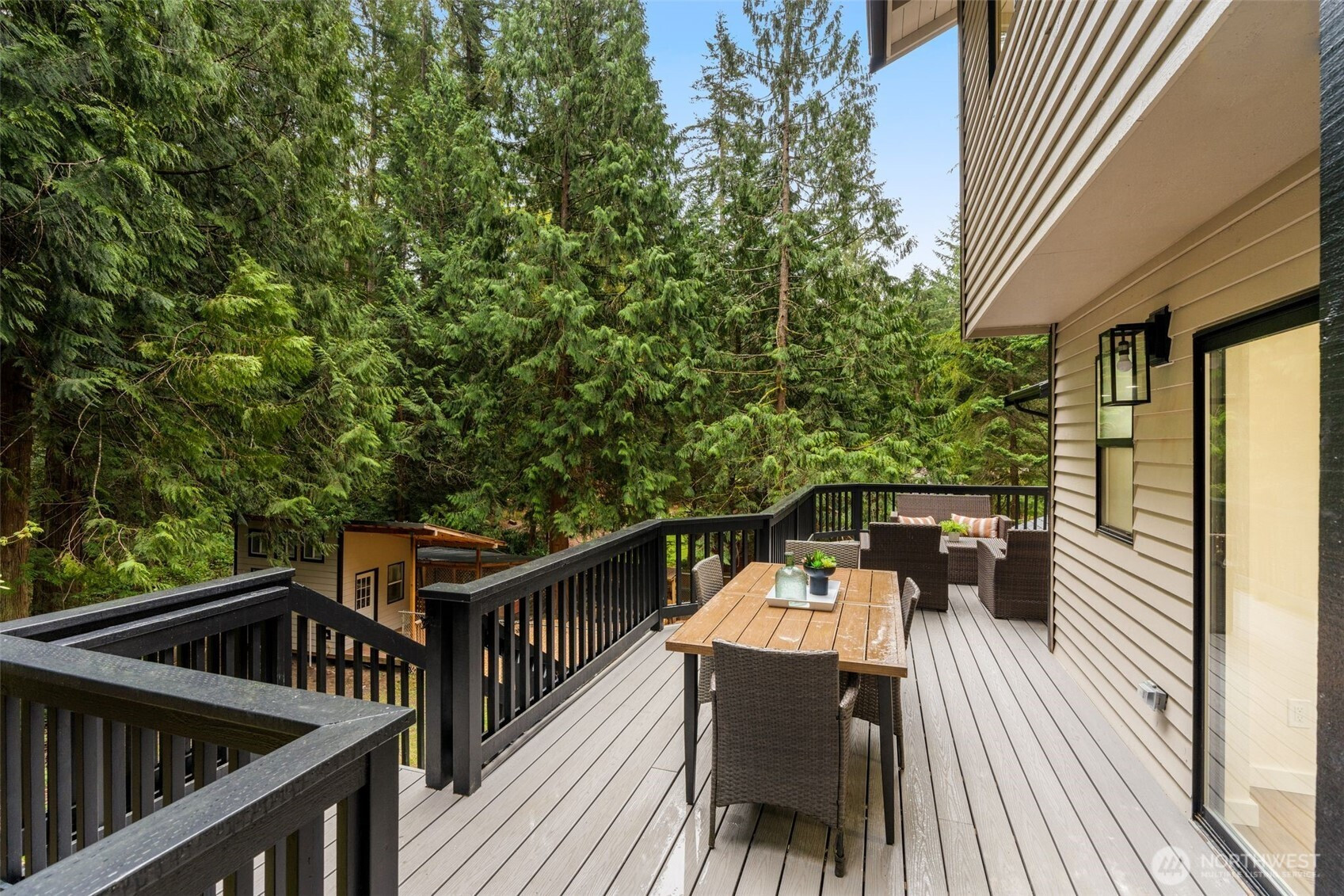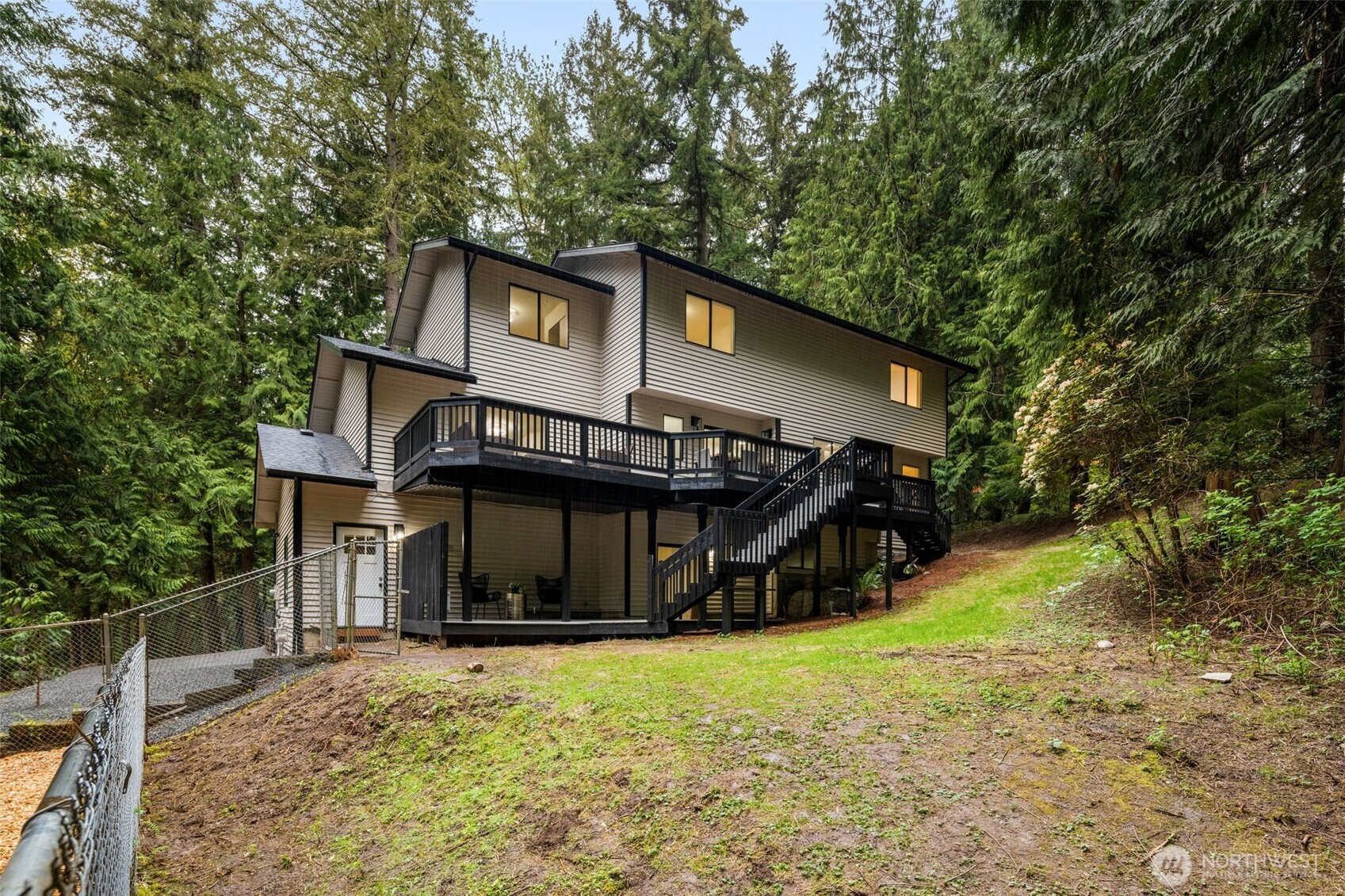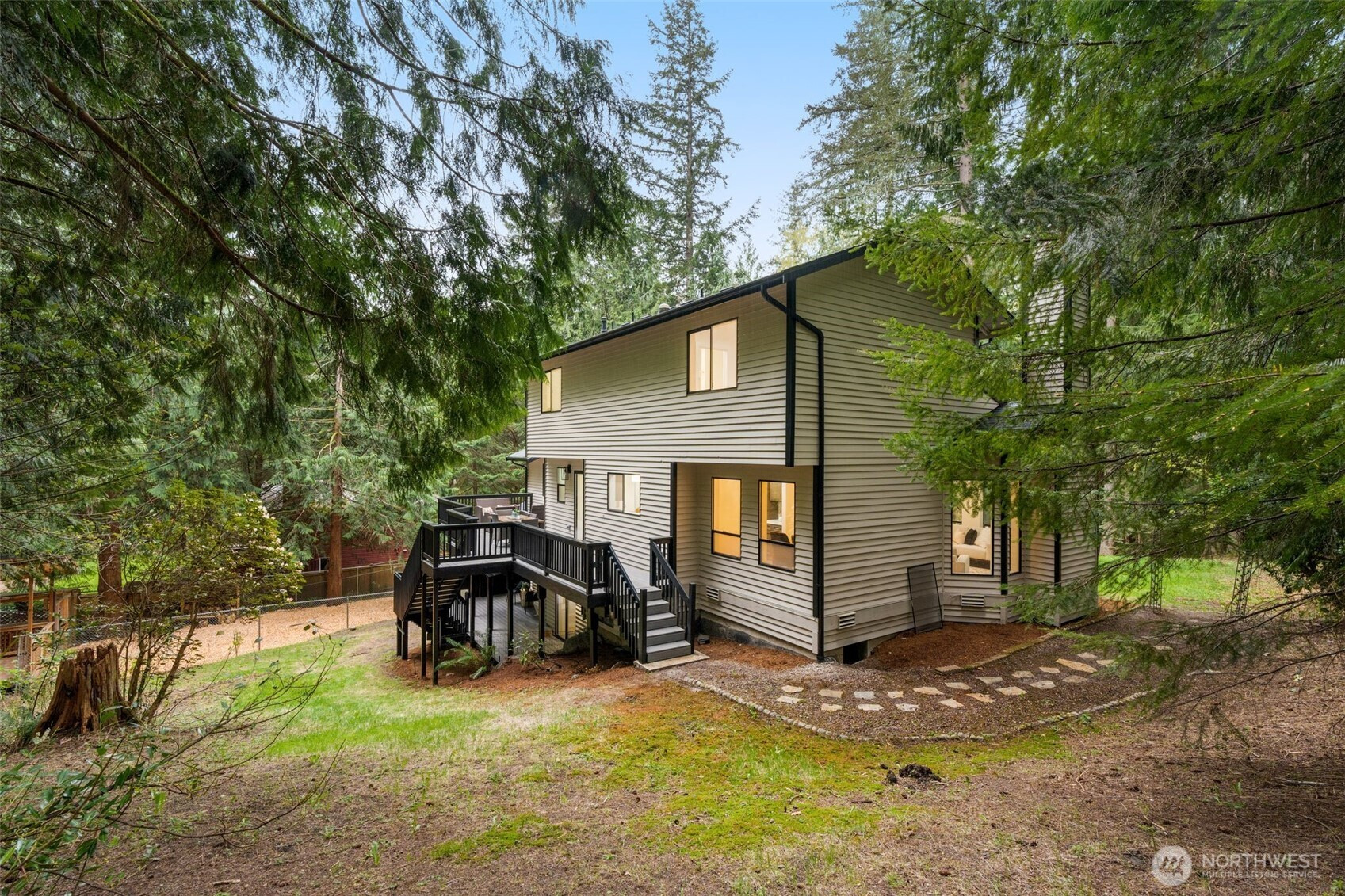 Tucked down a private drive and surrounded by towering evergreens on a 1.1 acre double lot, this reimagined retreat offers rare seclusion just across from Ames Lake—one of Washington’s last private, non-motorized lakes. A full cosmetic renovation elevates the house throughout with all new: roof, furnace, interior & exterior paint, bathrooms, rich oak hardwoods cultivating the cozy modern forest sanctuary. Inside, spaces unfold with a natural, welcoming flow. A formal living and dining room transition seamlessly into an open kitchen and family room with counter seating and a slider to the porch—blurring the line between indoor comfort and outdoor living. An expansive bonus room offers endless versatility for a media lounge, home office, or play space. Upstairs, the serene primary suite is a true retreat, featuring a spacious walk-in closet and a dual vanity bath, complemented by two additional well-appointed bedrooms. The lower level adds a fourth bedroom, dedicated laundry, and direct access to the two-car garage and lower deck. Outside, the property lives like a private sanctuary. RV parking, a generous chicken coop, and a detached studio—ideal for a home office, gym, or creative haven—round out an estate-like setting. Optional 55$/Month HOA grants access to private park with dock. Located within the coveted Snoqualmie Valley School District, this is true seclusion without sacrifice—minutes from Redmond's dining, shopping, and commuter routes, yet an oasis entirely yours.