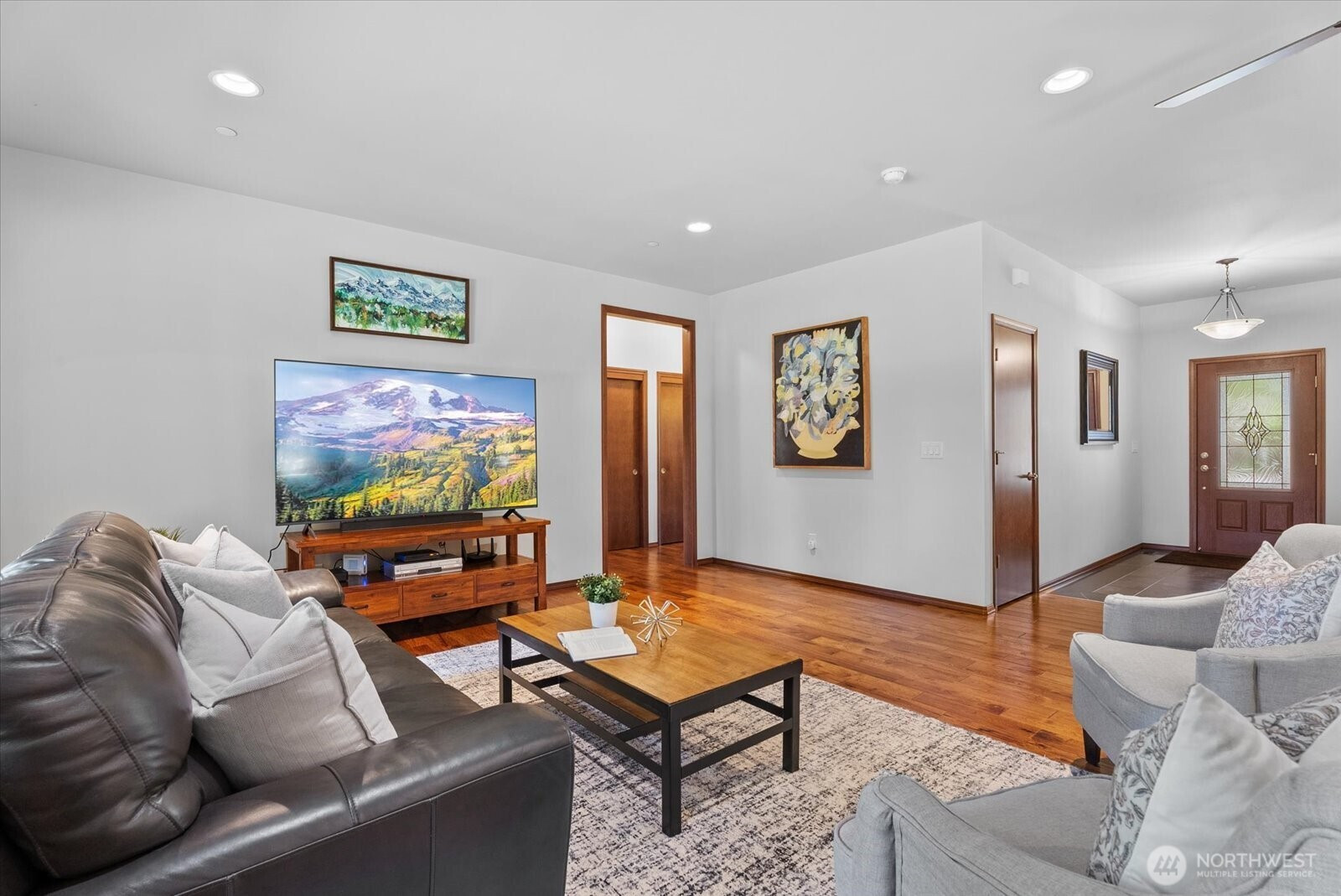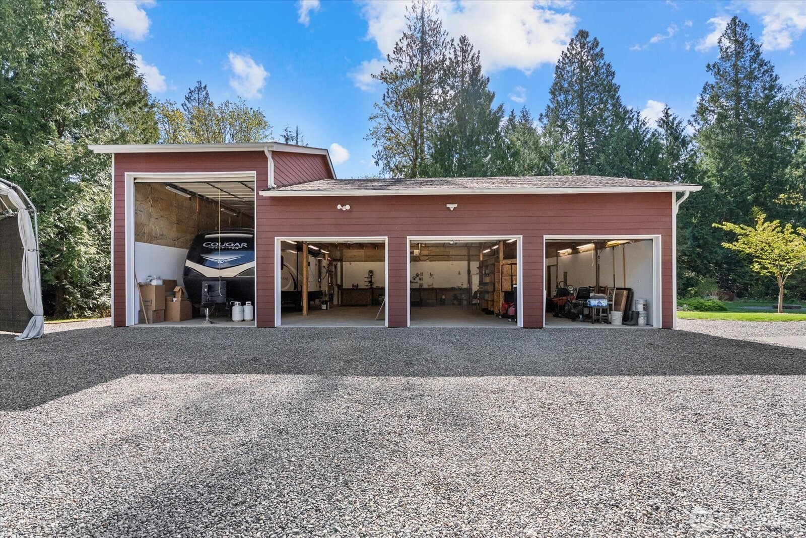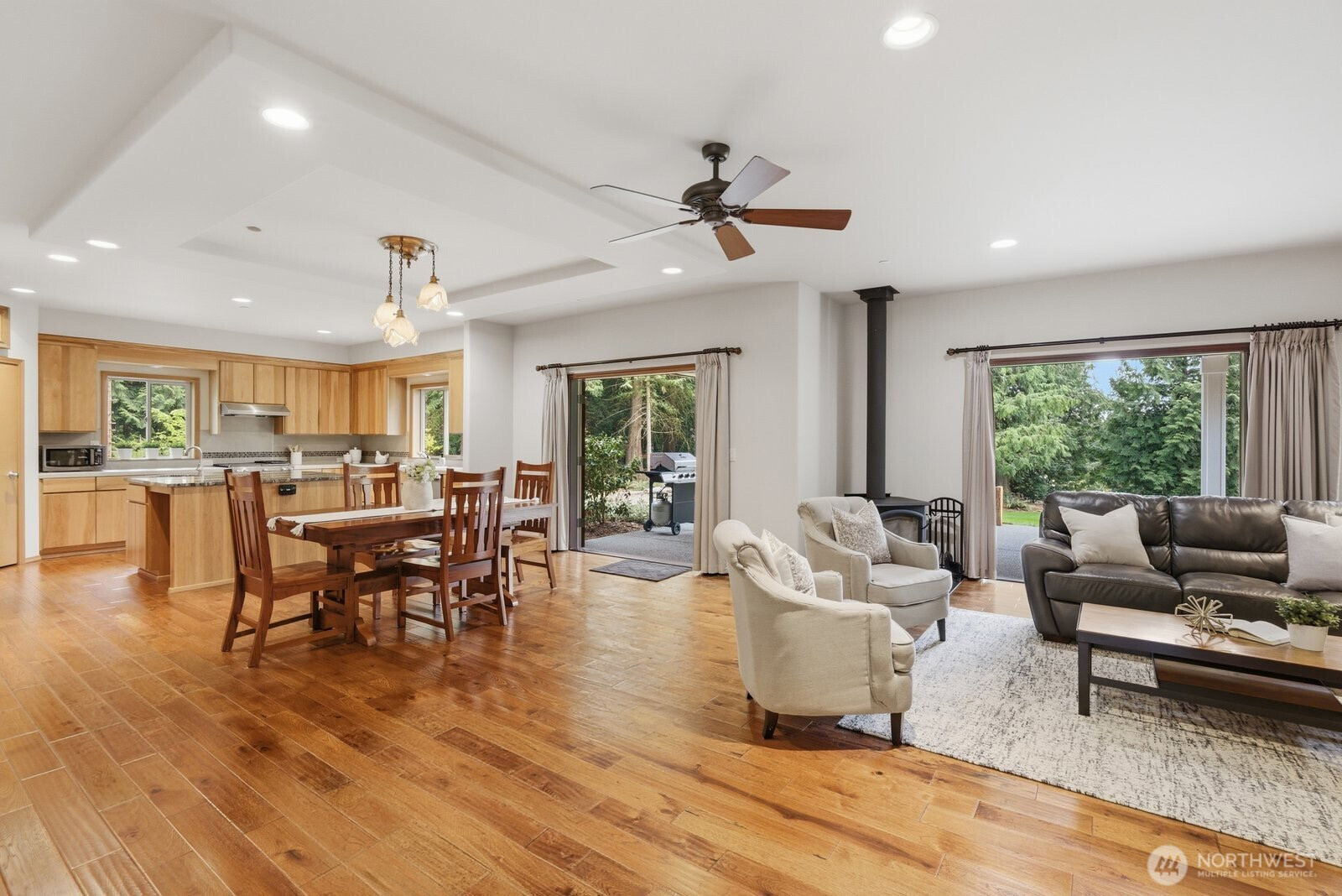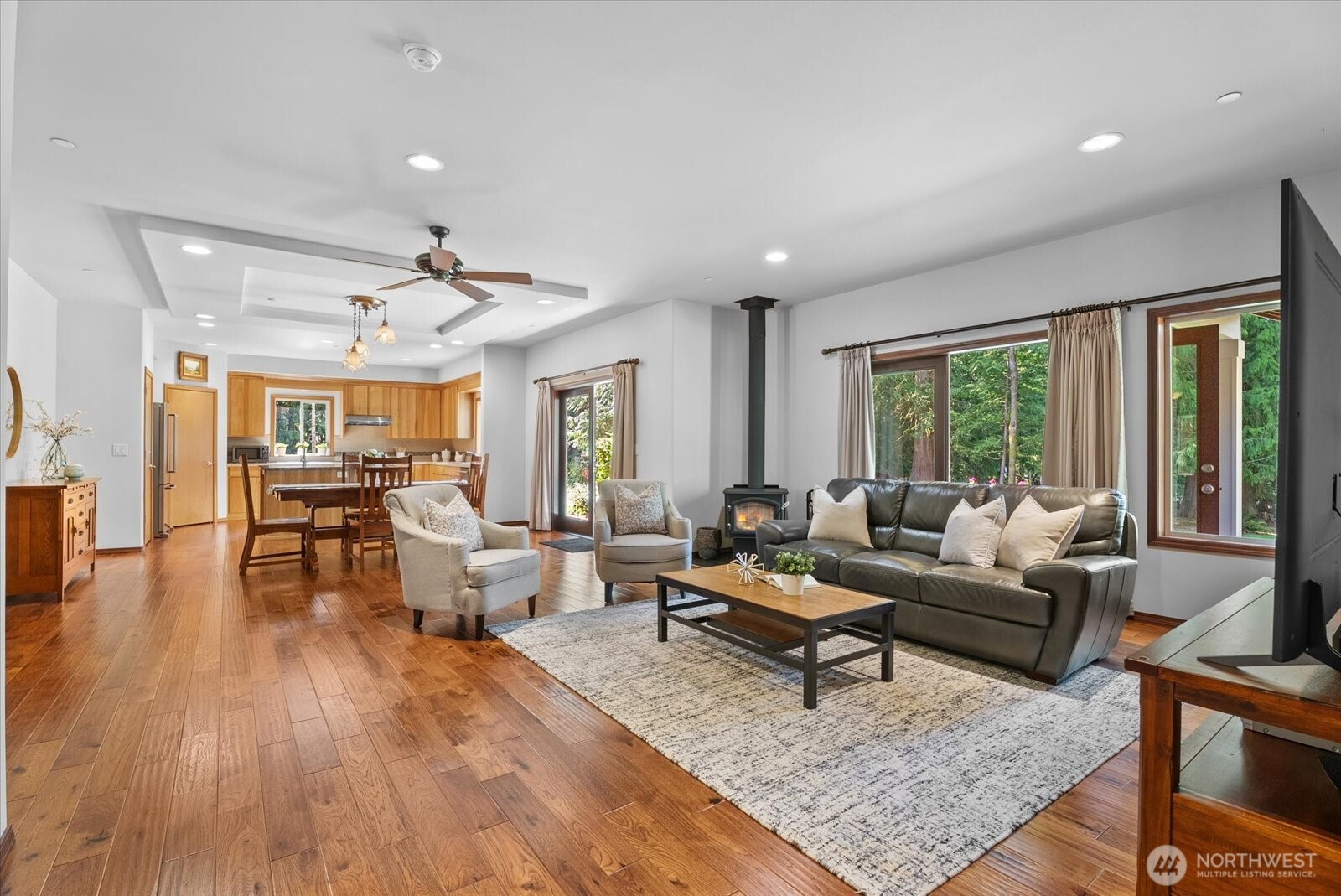 If you’ve been searching for a property that combines comfort, function, and space to live your dream lifestyle, this is it. This thoughtfully designed custom one story home offers easy living with 3 bedrooms, 2 bathrooms, and an open floorplan. The heart of the home features real hand scraped hickory floors, a warm wood burning stove, and 9ft ceilings throughout. The chef’s kitchen includes custom cabinets, granite counters, an island with second sink, and double pantries, perfect for everyday living and hosting. The primary suite offers a quiet retreat with a walk-in shower, double sinks, and walk-in closet. This home has many ADA features. Double French doors open to a large, covered patio with Lake Morton views and overlooking the properties sprawling fruit orchard. Enjoy peaceful walks along private trails or nearby lake access with a boat launch a couple blocks away. The 1,800 sqft heated shop (50x36) features four bays, including an extra wide, extra tall RV stall, plus a ¾ bath, ideal for a future ADU or MIL. Equipped with 125 amp service with 220/110 power. Additional, covered RV parking includes septic, water, and power hookups. A 10x20 greenhouse supports year-round gardening. This custom home was built with intention and practicality in mind.
