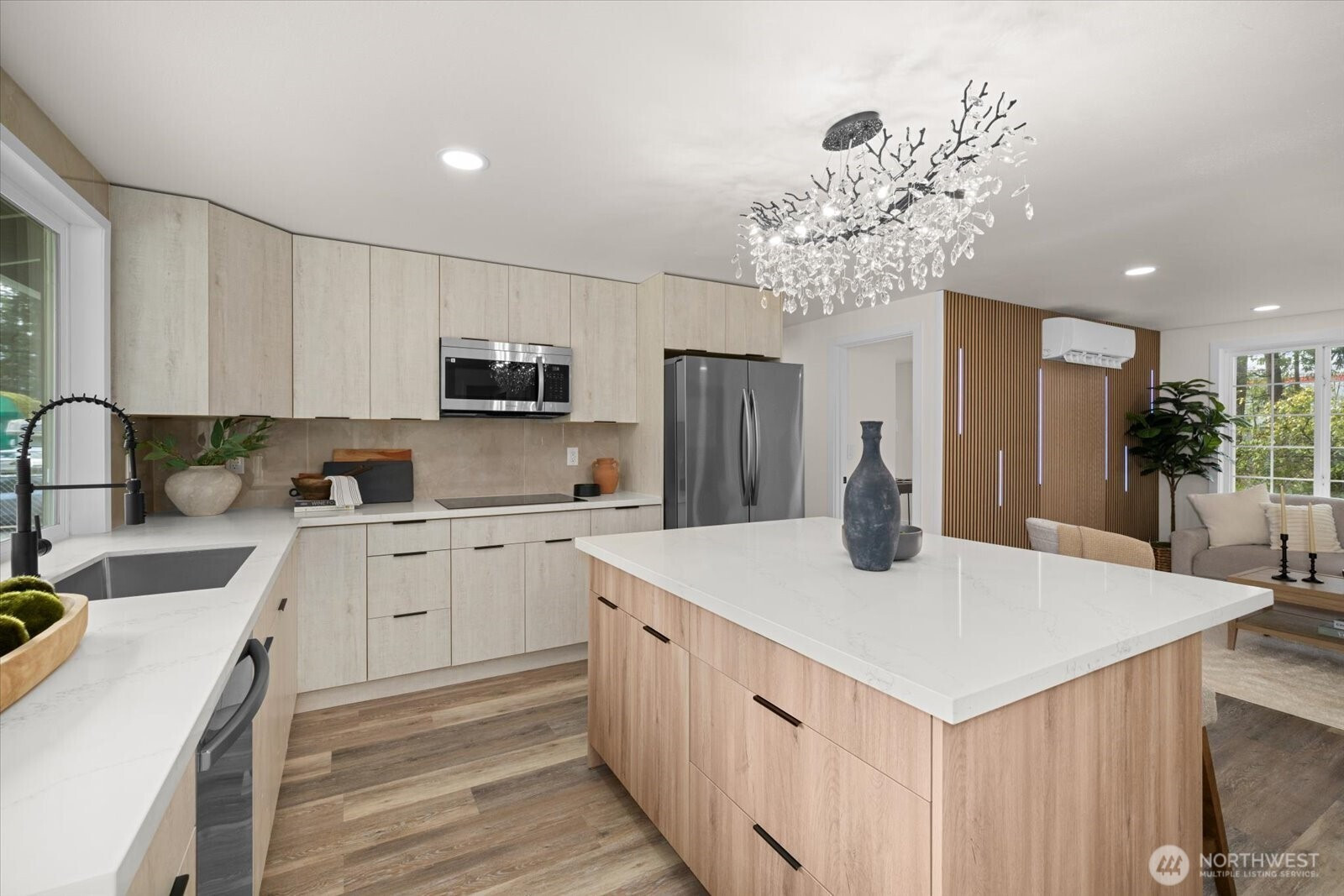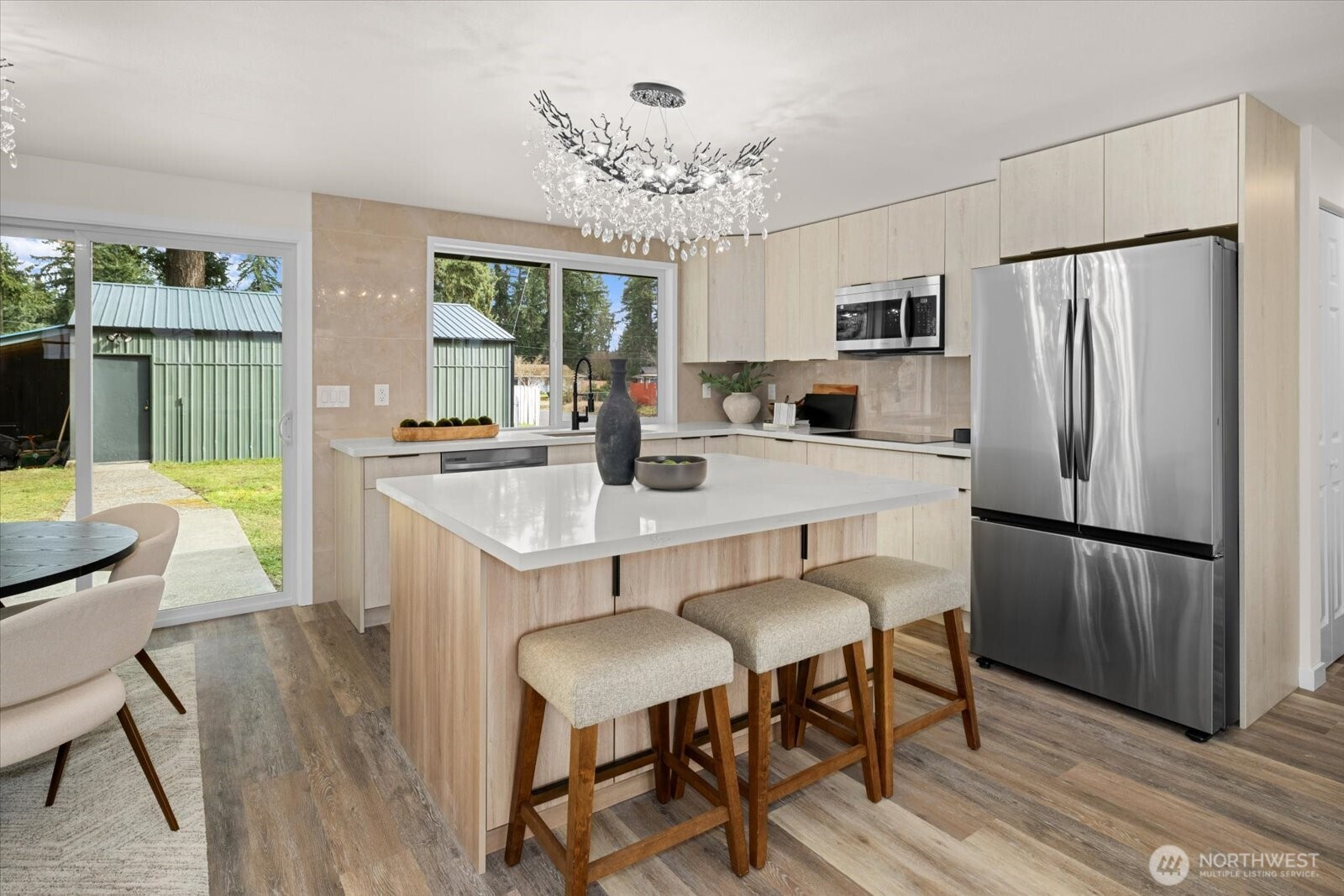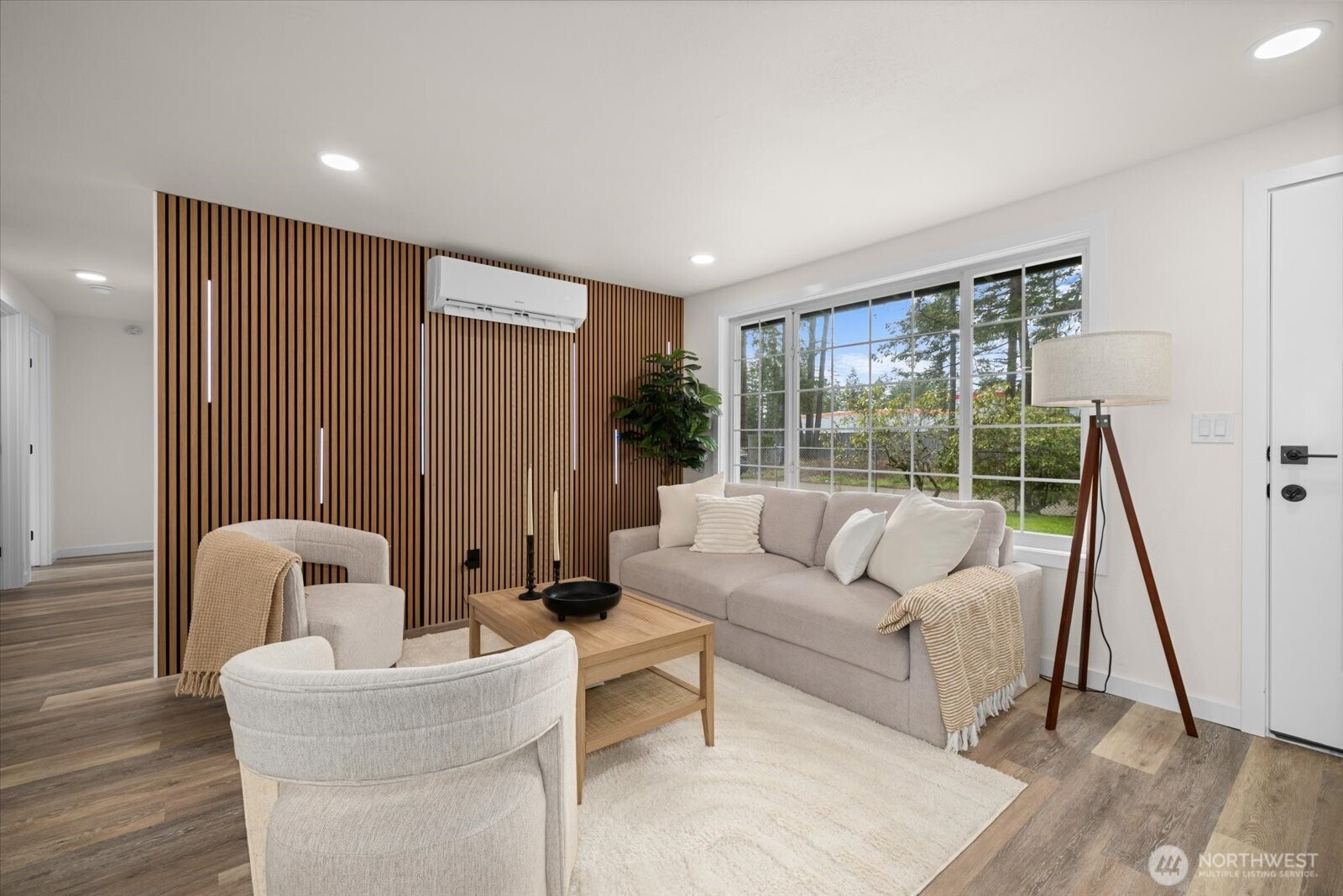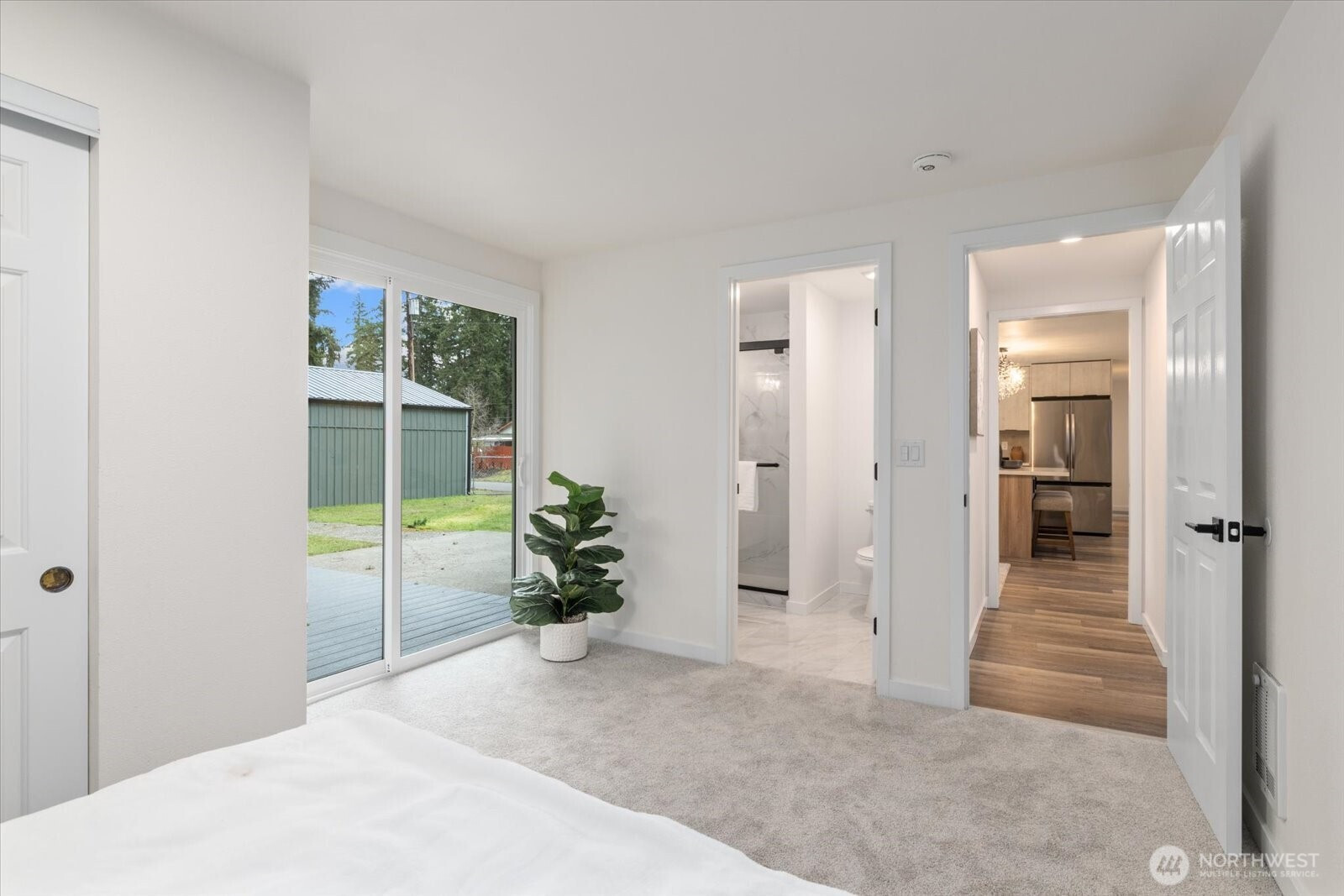 Completely renovated with modern, tasteful finishes, this thoughtfully designed home offers the perfect balance of style, comfort, & functionality. Located on a desirable corner lot, it provides added privacy, space, & flexibility. The home features 5 bedrooms w/ a layout that feels both efficient & intentional. The primary suite is a true retreat, complete w/direct access to the deck—ideal for quiet mornings or unwinding in the evening. Nearby, an oversized room offers exceptional versatility & can easily serve as a playroom, studio, home office, or additional bedroom. Living spaces feel warm and inviting, highlighted by an electric fireplace & a striking modern feature wall with wood panels and sleek bar lighting, creating a clean, cozy, & contemporary atmosphere. The kitchen is bright & welcoming, featuring new appliances, beautifully selected cabinetry & a timeless modern design suited for everyday living and entertaining.Additional bedrooms are well positioned to allow for comfortable separation of space & privacy.One bedroom features a semi-en suite bathroom, offering added convenience.Outside, the spacious backyard provides endless possibilities for recreation, gardening or future projects. A detached 670 sqft garage offers excellent space for a workshop, hobby area, or additional storage. Ample parking is available in the driveway, off street, & in the backyard.This move-in-ready home combines thoughtful design, modern upgrades & a highly desirable corner-lot setting