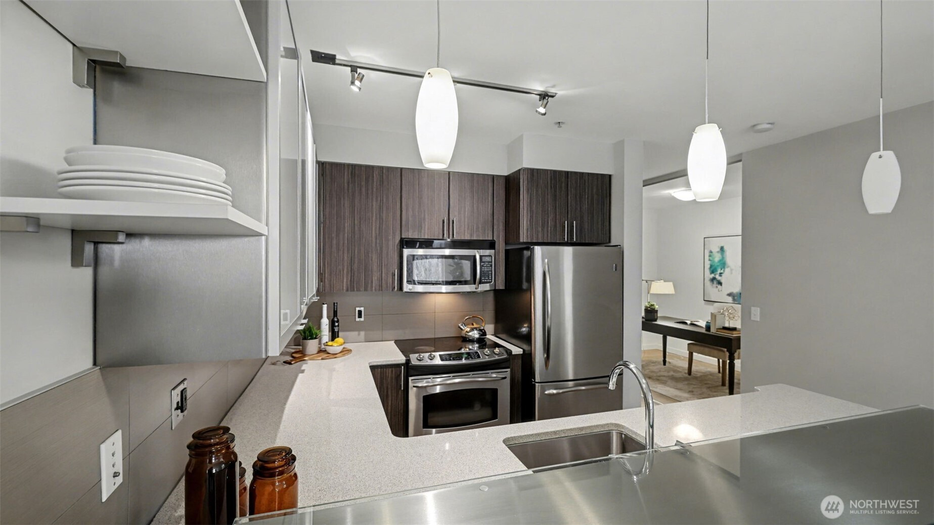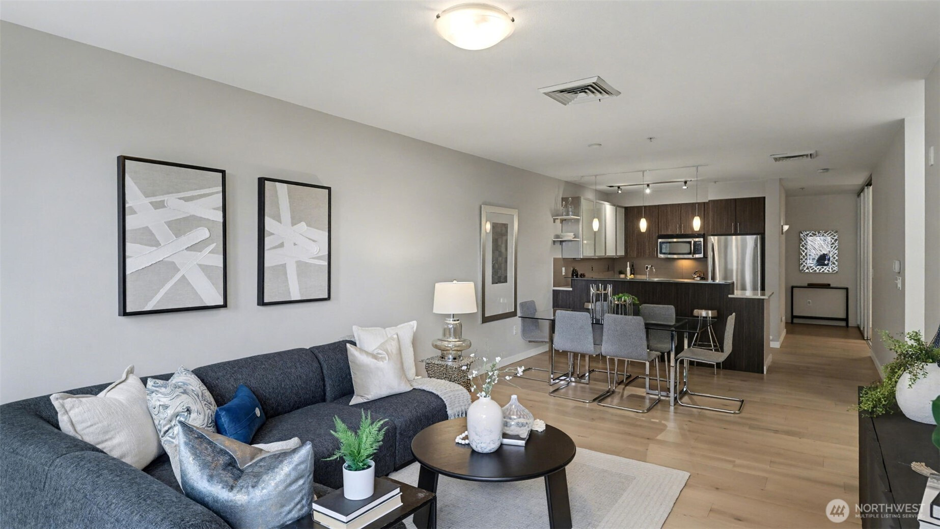 Check every box on your wish list - Westerly views of the Puget Sound from the comfort of your living room and bedroom versus having to trek up to a community rooftop to see the sun, prime urban location with everything right out your doorstep but just far enough removed from the hustle and bustle to still enjoy some peace and quiet, world class waterfront and Olympic Sculpture Park and trails right across the street, spacious primary suite with walk-in closet, office/den with frosted glass doors which perfectly doubles as a guest room, central air conditioning, floor-to-ceiling windows, affordable price, all in a secure building with concierge and garage parking. On trend engineered hardwood floors recently installed and virtually all of the appliances including HVAC system have been replaced within the last 2 years. Trio Condos offers a rooftop deck with views of the Space Needle, Mt Rainier and Elliot Bay; well run community with reasonable HOA dues; lounge and billiards room; pet friendly and no rental cap.