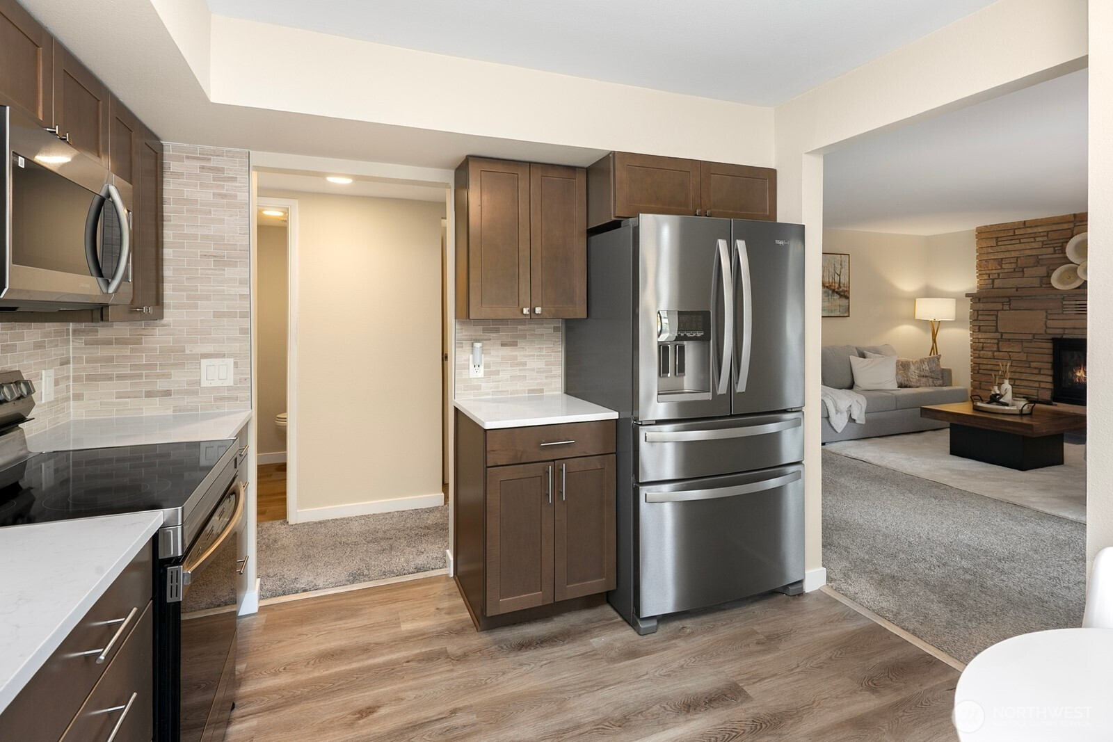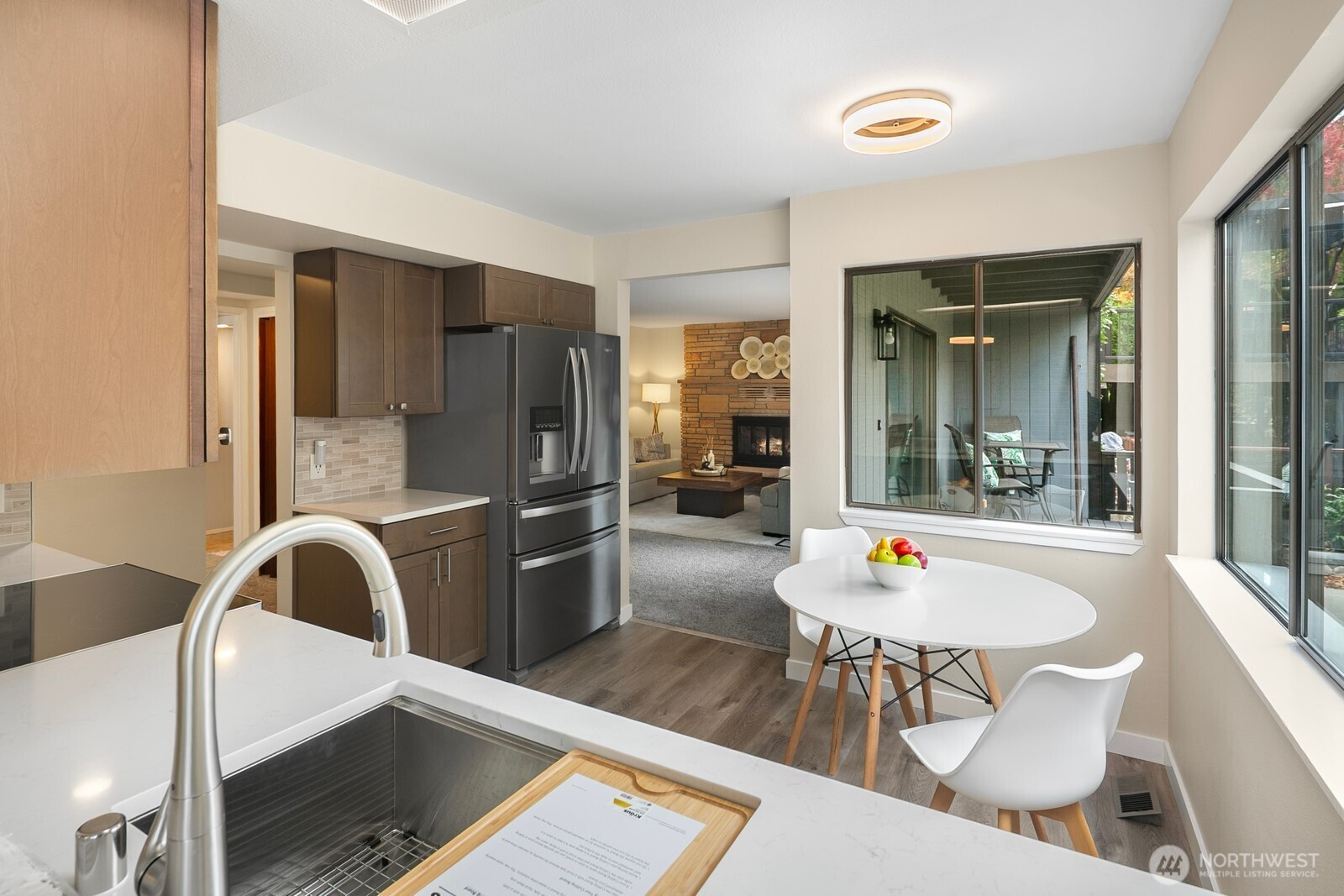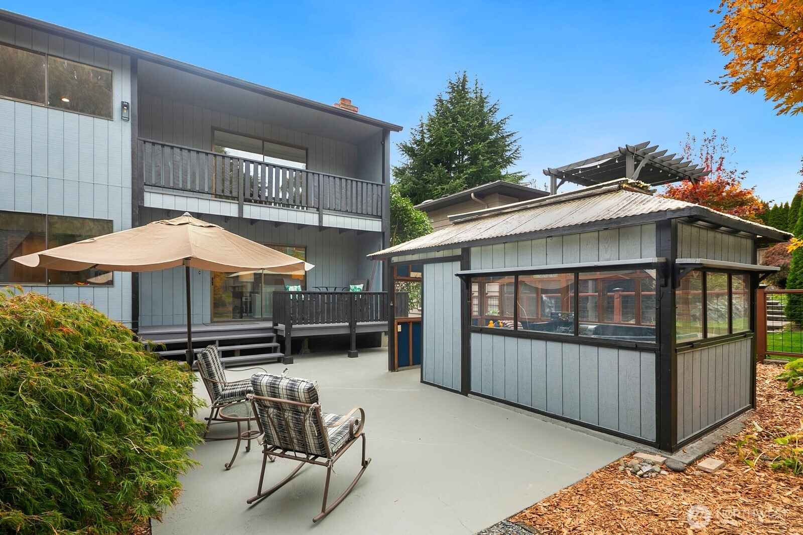 NW Contemporary, original beamed vaulted ceilings, AZ Stone fireplaces, light filled interiors & spacious rooms. Main level: New kitchen floors, cupboards, quartz & SS, walk-in pantry, laundry, & 1/2 bath. Entertain in the large dining w/built-ins + living & bonus rm that leads to 2 decks, patio, yard & gar entry. Upper level; 2 beds 1 bath + primary w/walk-in closet, private deck, bath w/shower. Lower level; kitchen, 1bd, 1bath, painted cement floors w/separate entrance. Outside; 80ft shed, 120sf spa house (many possibilities) easy alley access detached 675sf garage w/RV/boat bay, ideal for shop, storage, studio or future 3rd living (buyer to verify). Close to parks, shop, restaurants, school, transit. This home is turnkey w/room to grow.