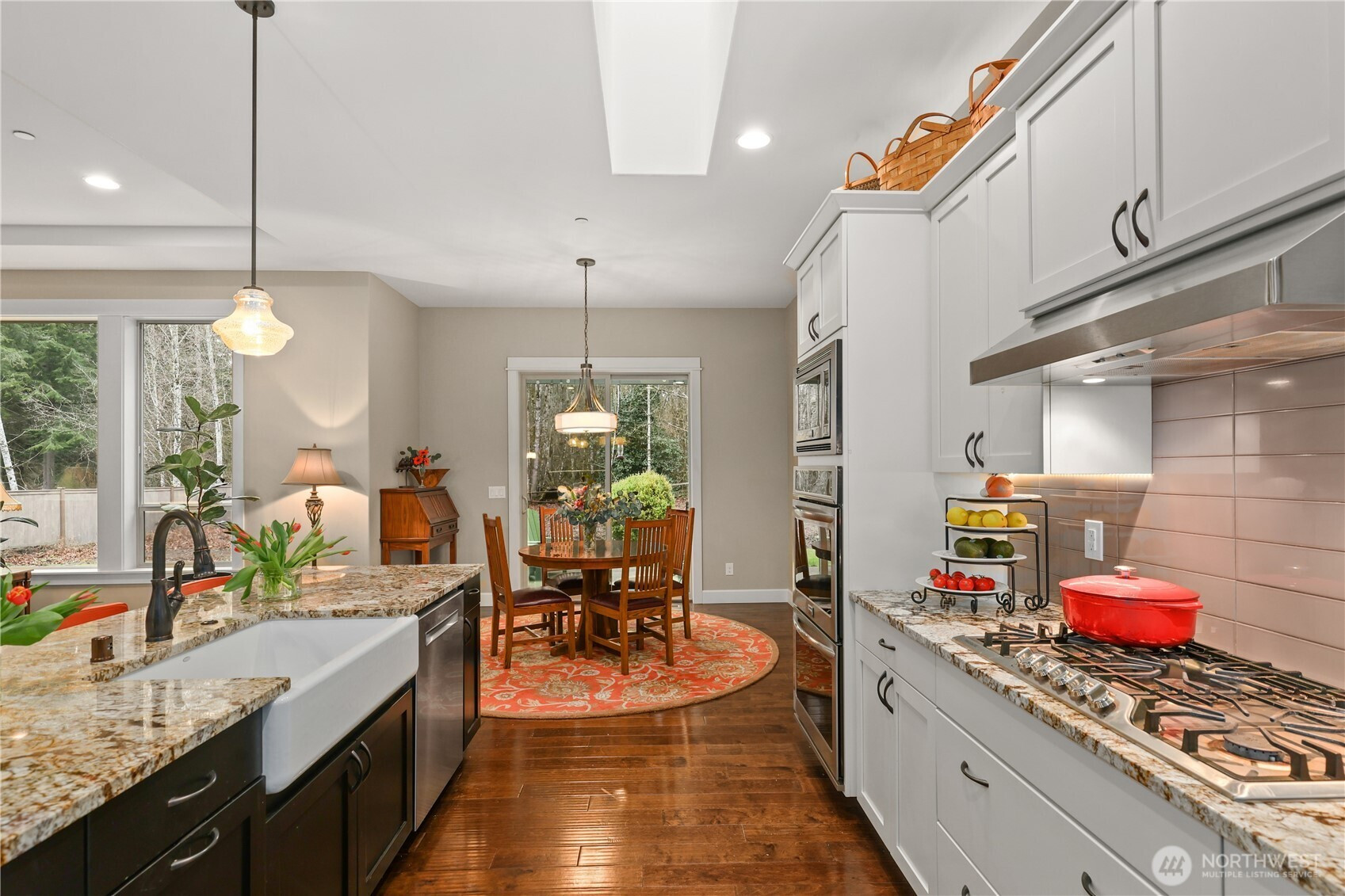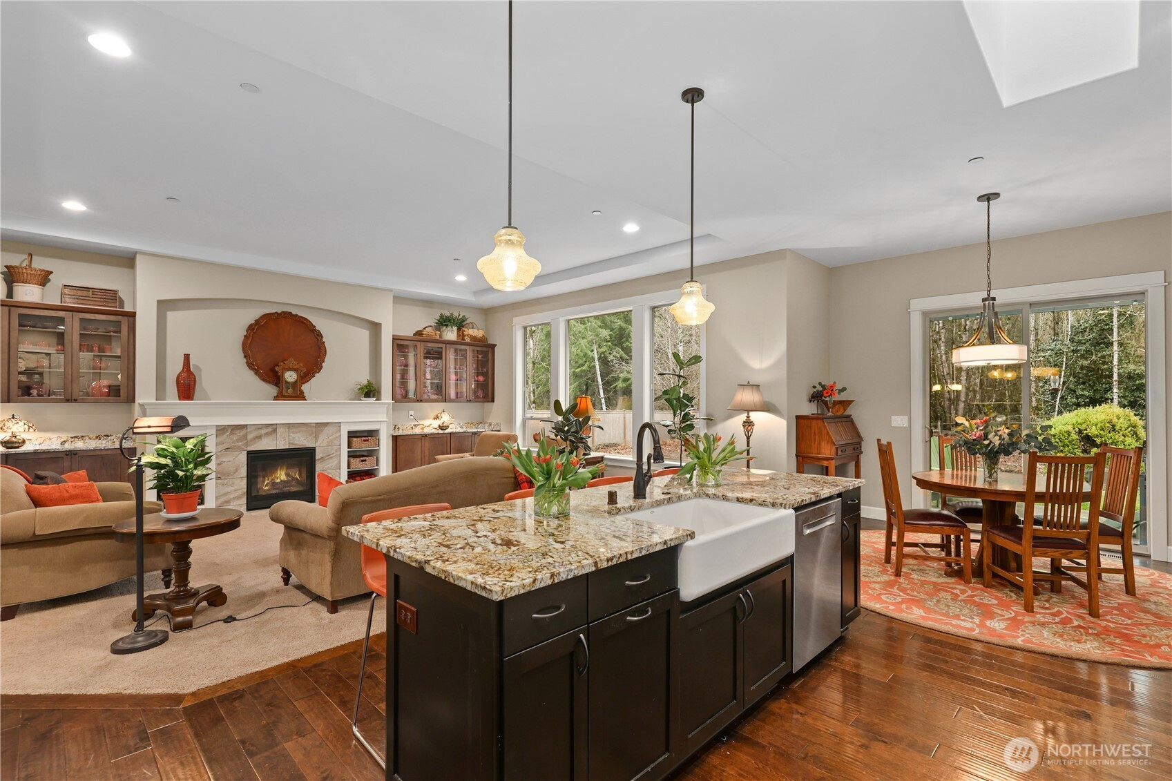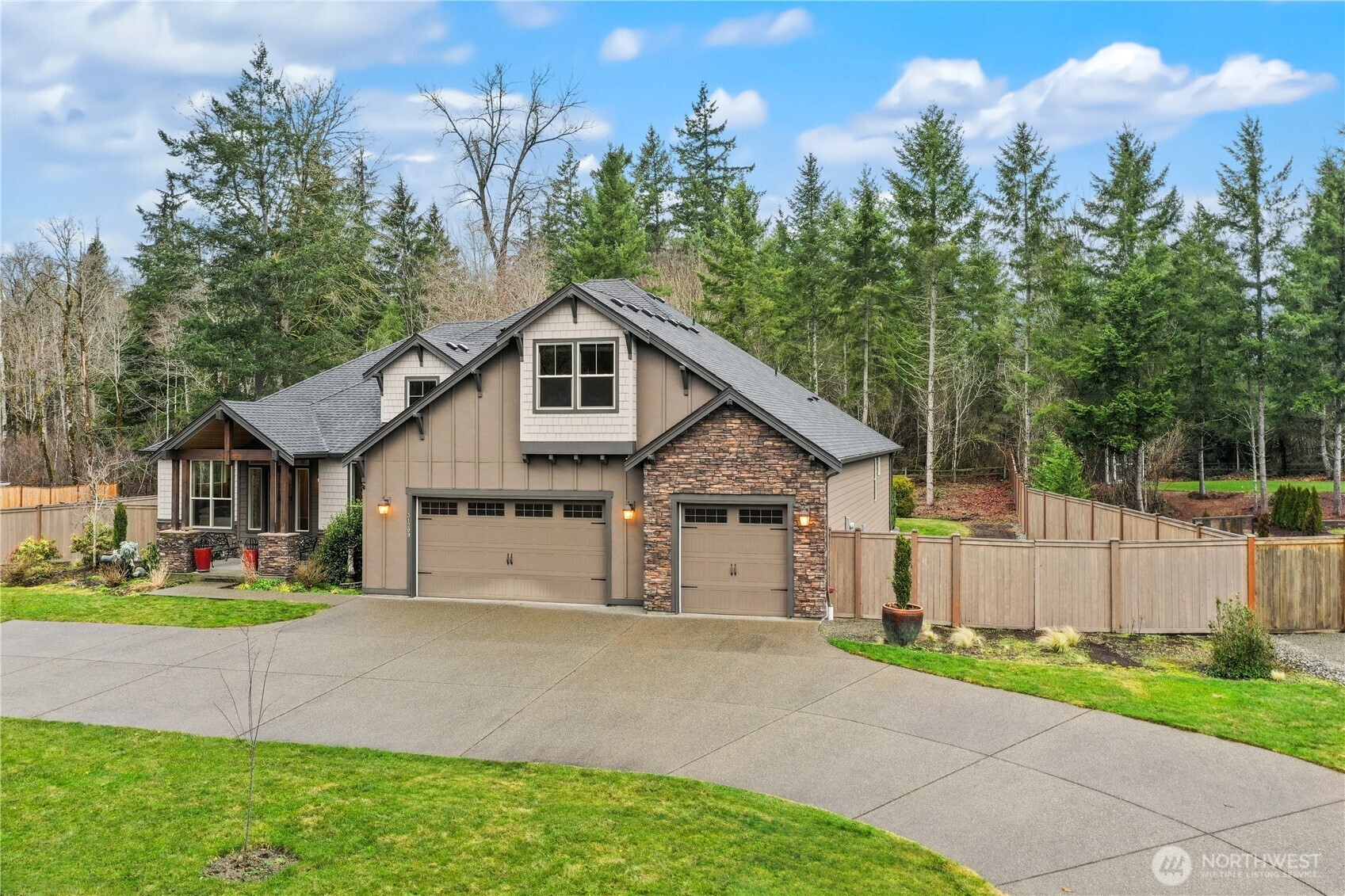Refined Craftsman rambler in the sought-after gated community of the Ridge at Sawyer Lake, perfectly sited on a half acre backing to 175 acres of protected HOA greenbelt for exceptional privacy. The great room is the heart of the home, showcasing 9'+ ceilings, a natural gas fireplace, and an effortless flow designed for both elevated entertaining and comfortable daily living. The adjacent chef’s kitchen is equally impressive, featuring an expansive island, farmhouse sink, double wall ovens, stainless steel appliances, and a generous eat-in area. The main level also offers a formal dining room, private office, well-appointed secondary bedrooms and baths, and a spacious utility room. The serene primary suite serves as a luxurious retreat with a lux five-piece bath, expansive walk-in closet, and French doors opening to a private covered patio. A versatile bonus suite above the garage with a 3/4 bath is ideal for guests, media, or a secondary office. The oversized three-car garage with dedicated work and storage areas, expansive driveway with ample parking, and RV parking pad provide exceptional functionality. Covered rear outdoor living spaces extend into the fully fenced grounds, enhanced by mature landscaping. Fresh interior and exterior paint complete this polished, move-in ready residence.