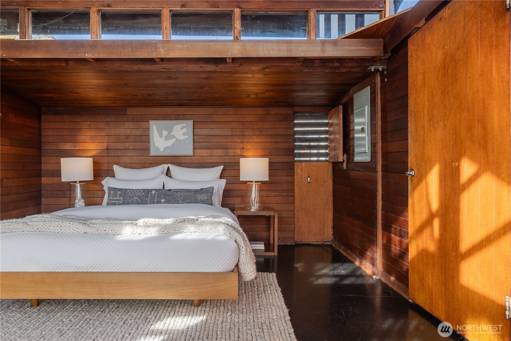 Designed by architect Gerald Van Slyck in the late 1950s to early 1960s, this distinctive floating home captures the essence of midcentury design with a NW sensibility. Vaulted ceilings, clerestory windows, and generous skylights welcome shifting sunlight that dances through the rooms & reflects off the water, giving the space a luminous, ever-changing quality. Outdoor areas frame tranquil Portage Bay views, while the intimate four-home co-op dock offers a genuine sense of community. Includes one dedicated parking space & a 43-foot moorage slip - a timeless blend of architecture, light, & waterfront serenity. Second from the end, this is your perfect retreat from the daily city life putting you absolutely in touch w/ nature at it's best.