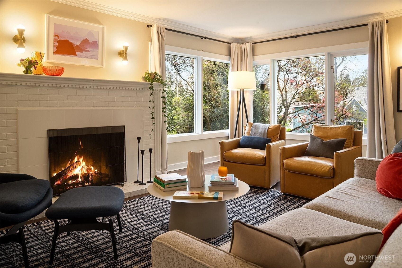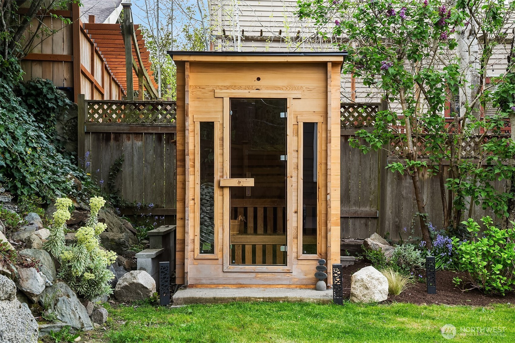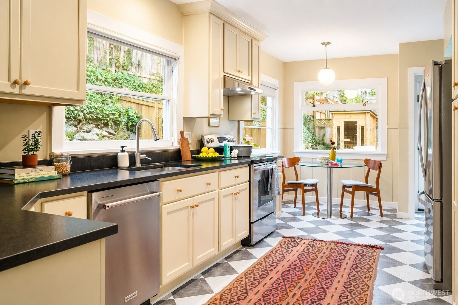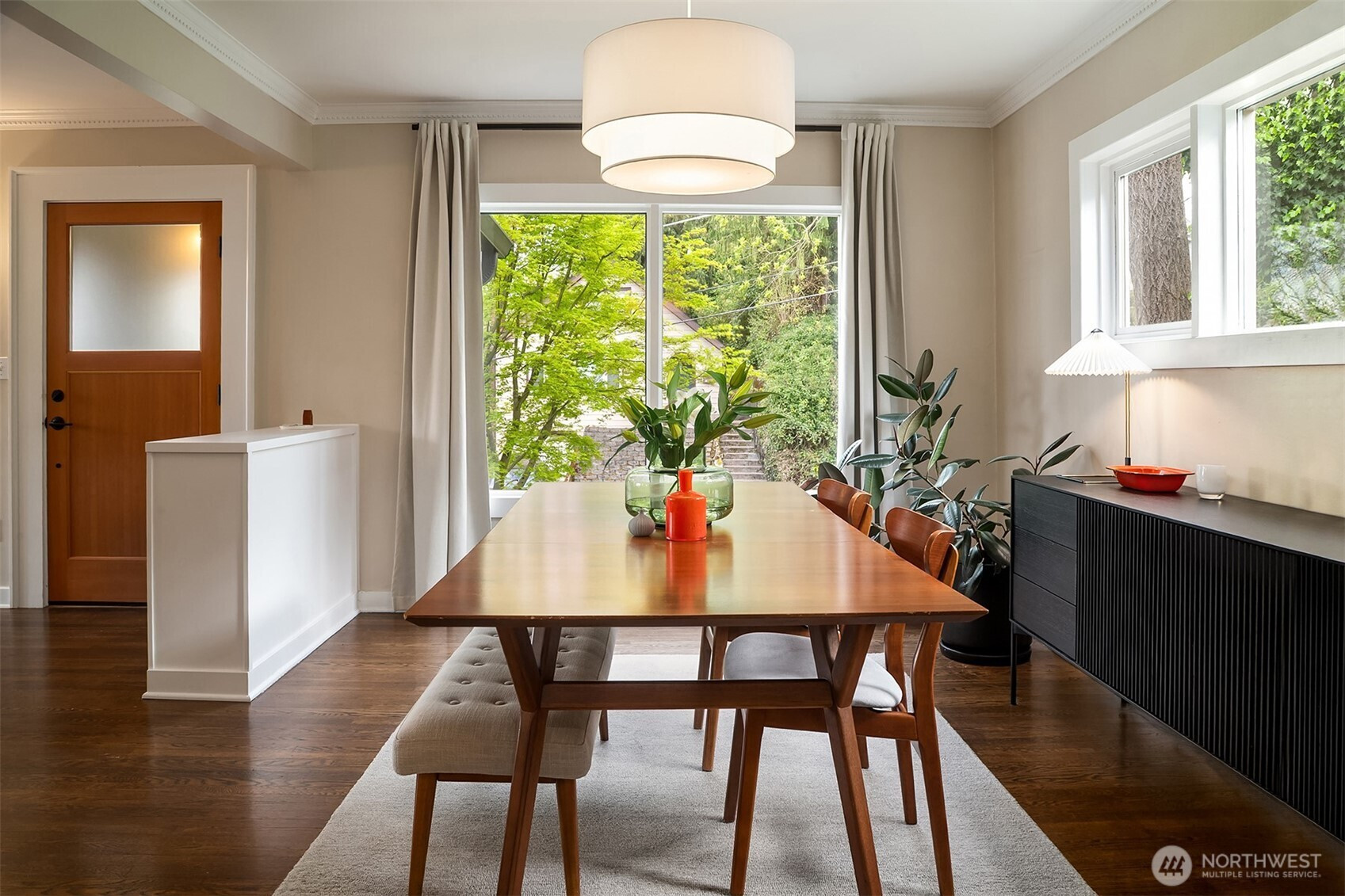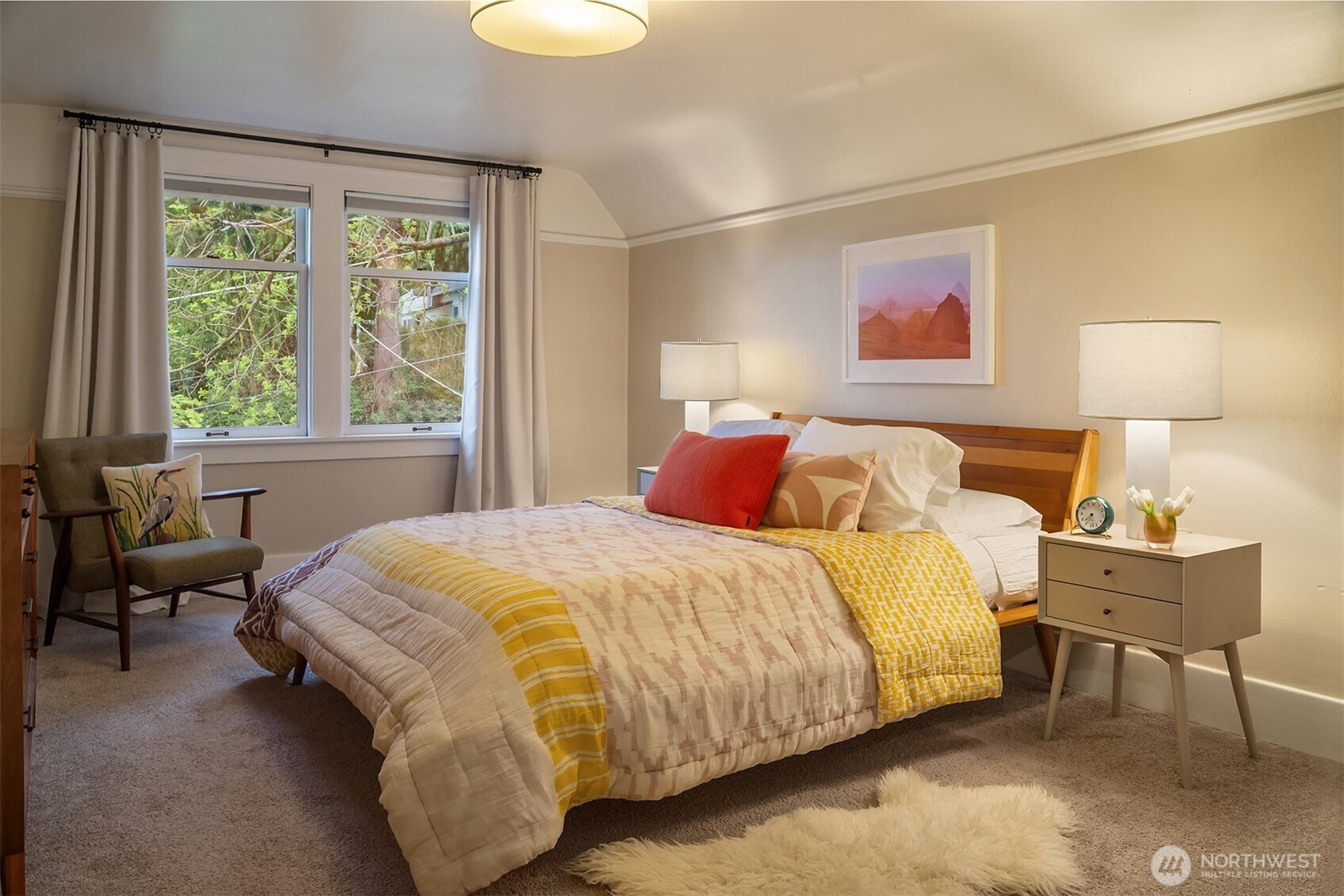 Sitting pretty, a quick jaunt from Greenlake and walking distance to the heart of Tangletown, this stylish Tudor exudes quiet luxury. Perched for privacy with an oasis-like backyard complete with sauna, lawn and garden beds and a party size deck. The "relax you’re home vibes" start as soon as you walk in. The light moves softly through the space, offering warmth regardless of season. The living room is anchored by peek-a-boo views and a beautiful fireplace with custom surround. The dining room opens to a dreamy kitchen and jewel-box breakfast nook with garden views. The main floor bedroom with Ralph Lauren vibes and a walk-in closet is right next to a stylish full bath. Upstairs delights with warm fir floors, tree-top views and 3 well-appointed bedrooms. The beautifully remodeled upstairs bathroom is as functional as it is pretty. And all this goodness is connected by a spacious upstairs landing charmingly lit by a stunning stained glass window. Soaring ceilings in the lower-level living room set the tone. And whether you want additional living space, a deluxe Airbnb, or guest quarters, the possibilities in the lower-level abound. In McDonald International attendance area. Dreamy.