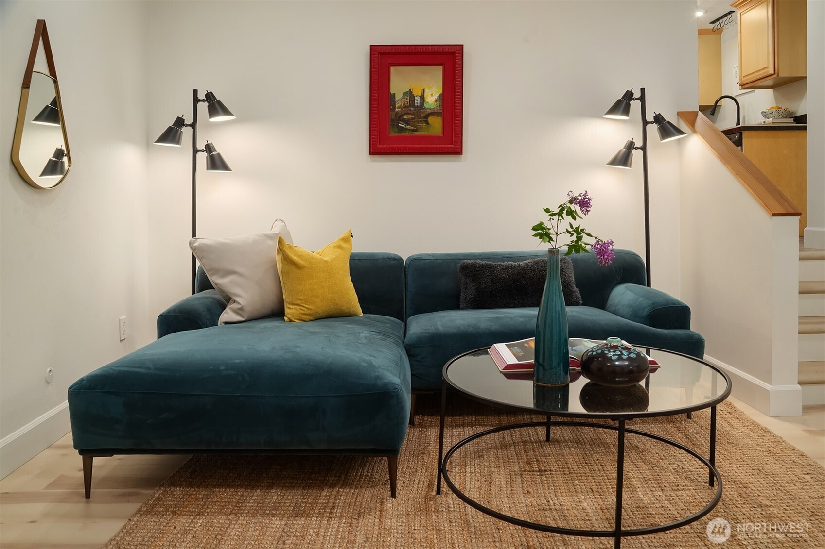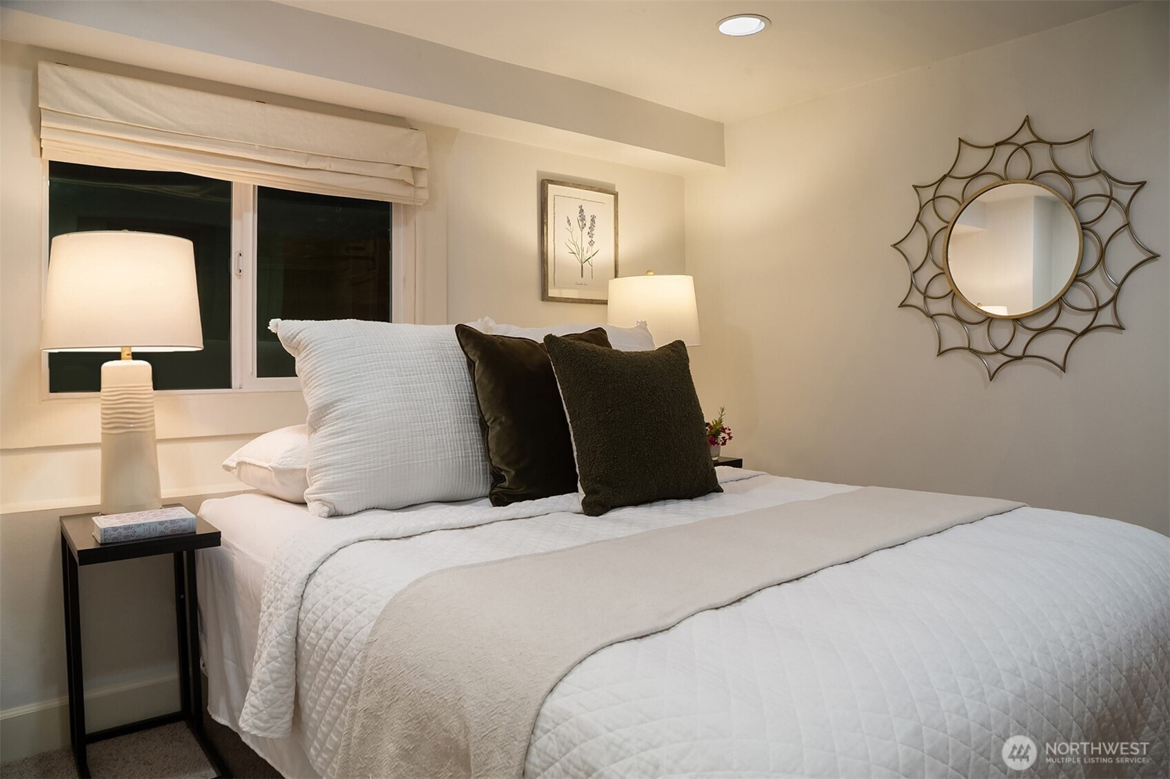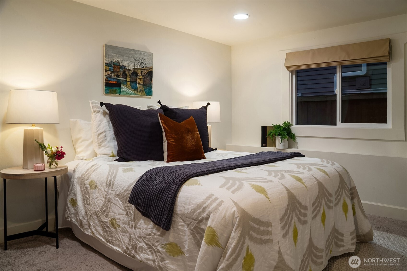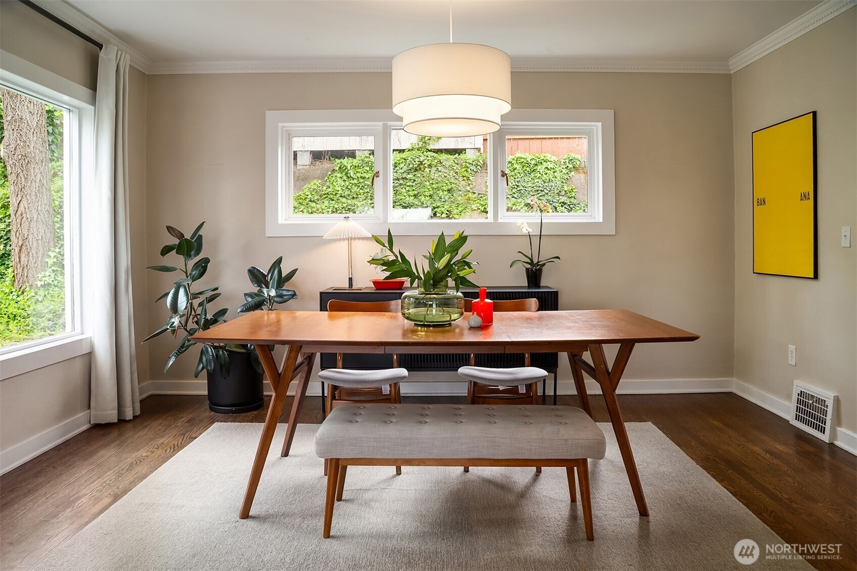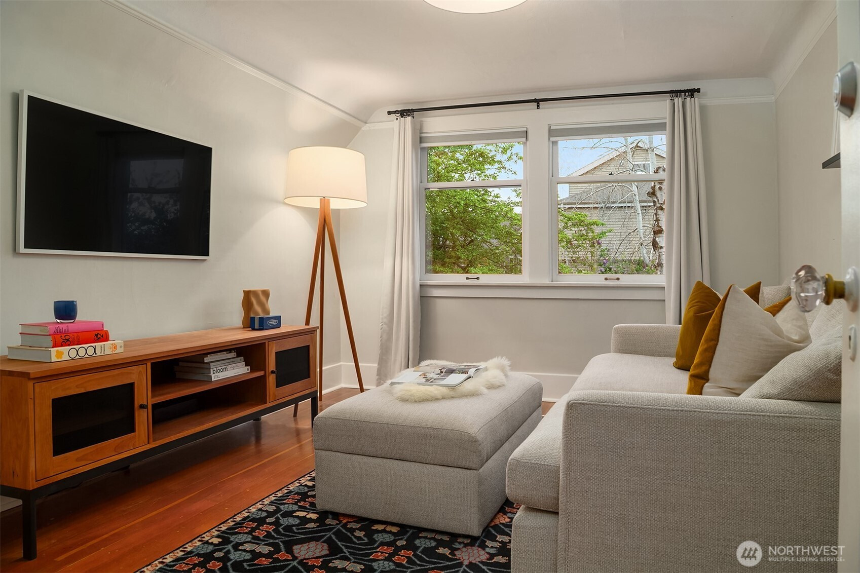 Sitting pretty, a quick jaunt from Greenlake and walking distance to the heart of Tangletown, this stylish Tudor exudes quiet luxury. Perched for privacy with an oasis-like backyard complete with sauna, lawn and garden beds and a party size deck. The "relax you’re home vibes" start as soon as you walk in. The light moves softly through the space, offering warmth regardless of season. The living room is anchored by peek-a-boo views and a beautiful fireplace with custom surround. The dining room opens to a dreamy kitchen and jewel-box breakfast nook with garden views. The main floor bedroom with Ralph Lauren vibes and a walk-in closet is right next to a stylish full bath. Upstairs delights with warm fir floors, tree-top views and 3 well-appointed bedrooms. The beautifully remodeled upstairs bathroom is as functional as it is pretty. And all this goodness is connected by a spacious upstairs landing charmingly lit by a stunning stained glass window. Soaring ceilings in the lower-level living room set the tone. And whether you want additional living space, a deluxe Airbnb, or guest quarters, the possibilities in the lower-level abound. In McDonald International attendance area. Dreamy.