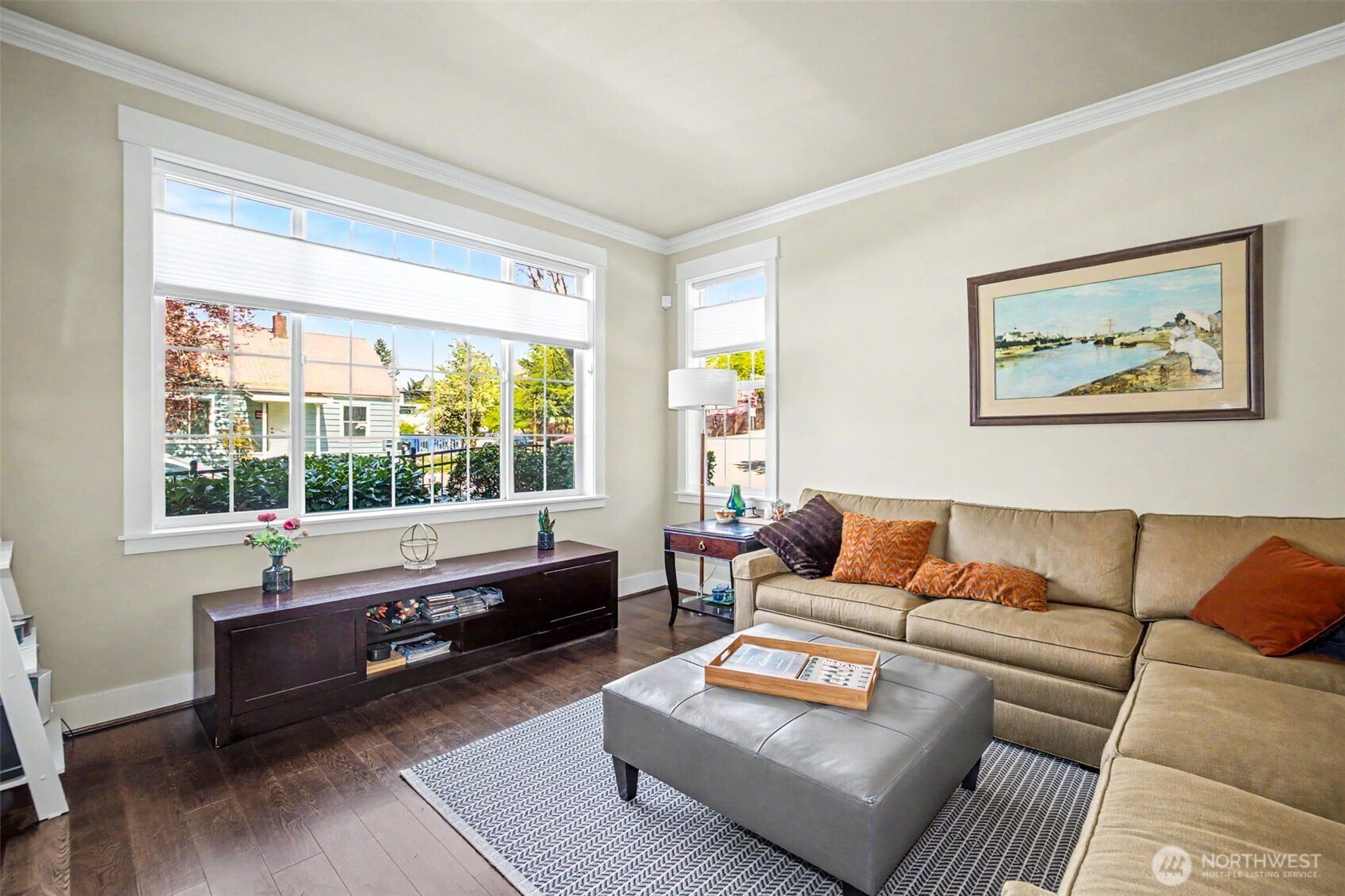 This extensively remodeled home is located in the quiet Nettleton Commons neighborhood on a corner lot. The newly updated residence features an open main level with hardwood floors and plenty of natural light throughout. Kitchen includes quartz countertops and matching high-end Café appliances with two ovens. A major highlight is the large main suite, which includes an additional lounging area and a tranquil bathroom with a spa-like tub and walk-in shower. The property also includes an oversized two-car garage. The home offers good walkability, situated near Lake Washington and a short distance from downtown shopping and dining. This residence provides a balance of new updates and a convenient location in a peaceful setting.
