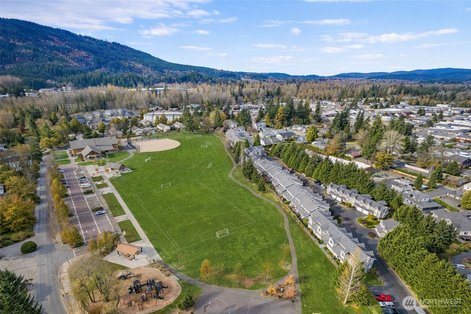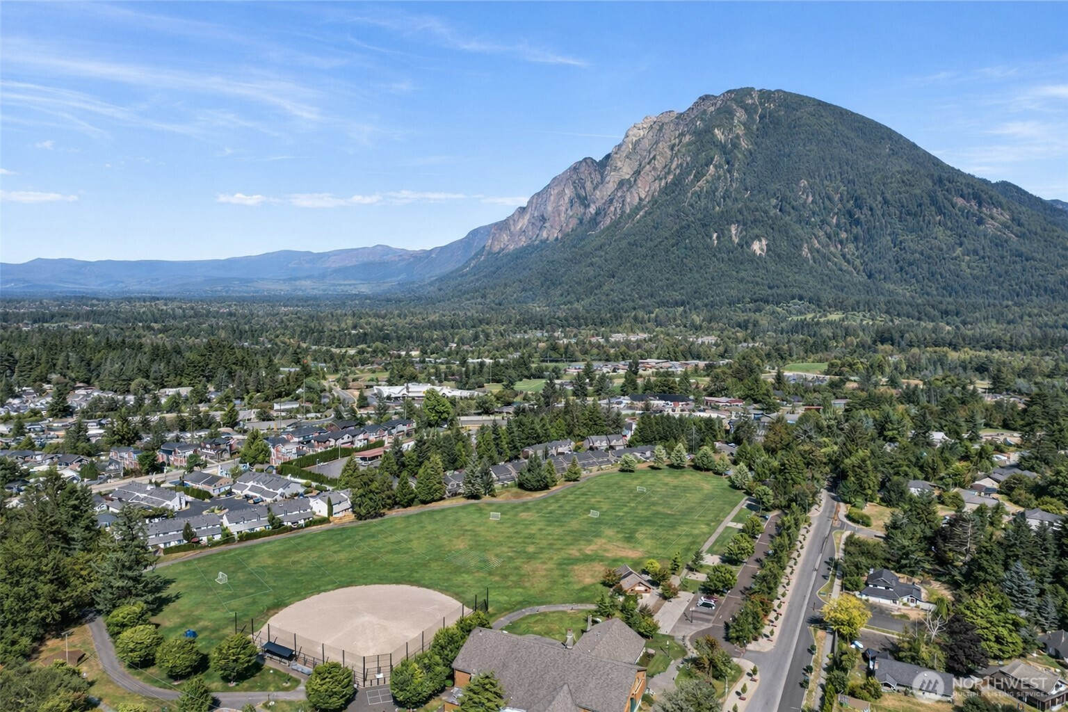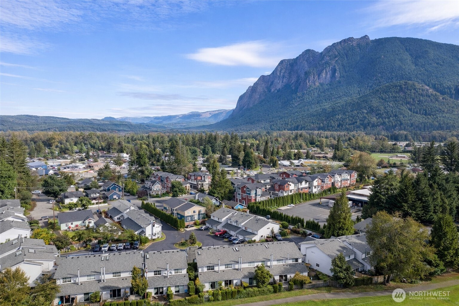 Welcome to Park Place Townhomes in the heart of downtown North Bend, where magnificent mountain views greet you right from your own home. This light-filled 2-story end-unit offers privacy, abundant natural light, and stunning views of Mount Si. The spacious Living room features a cozy gas fireplace and seamless access to a private patio—perfect for morning coffee or summer BBQs. The Kitchen is equipped with stainless steel appliances and generous cabinet storage, creating both functionality and style. A convenient half bath and full-size laundry are located on the main level. Upstairs there are 2 spacious bedrooms, including Primary with breathtaking Mount Si views, a large closet, and direct access to the full bath with dual sinks. Updated luxury vinyl plank flooring throughout adds a clean, modern touch. Enjoy the ease of a 1-car garage plus driveway parking. Ideally located just minutes from shopping, restaurants, local bars, trails, and with Si View Park right next door. Quick access to I-90 makes commuting simple. Welcome home!