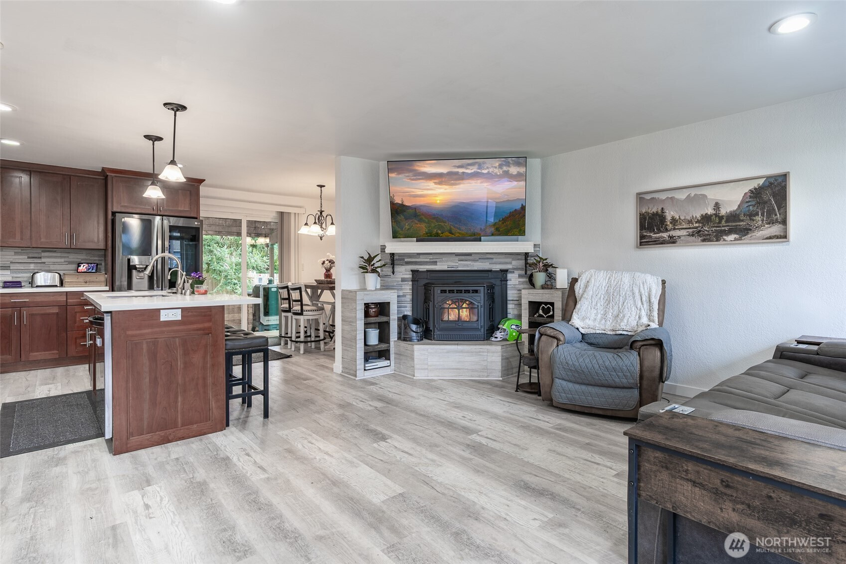 Home owner is in the trades and the home boasts top-tier amenities designed for comfort and style. Major upgrades include a newly installed roof w/ a transferable warranty and new modern plumbing. New exterior paint. Enjoy the convenience of a tankless water heater and on-demand hot water. The open concept elegant kitchen has been fully remodeled with a large bar, filtered water w/ insta hot and cold features. The kitchen has timeless rich wood cabinetry and newer appliances making it an entertainer's dream. Cozy up by the pellet fireplace or host your friends on the spacious covered porch, complete with a gas line for your grilling needs and a fully fenced yard for privacy. Pamper yourself in the master bathroom, featuring twin showers, marble tile and penny floor tiles. Don’t forget the mirror defogger for fog-free clarity. The home is also equipped with smart technology, including Alexa integration in four zones for voice control of lights, music, and fans. There is also a Ring doorbell that can be controlled by your phone anywhere. Don't miss this unique opportunity to enjoy modern conveniences in a beautifully upgraded space.