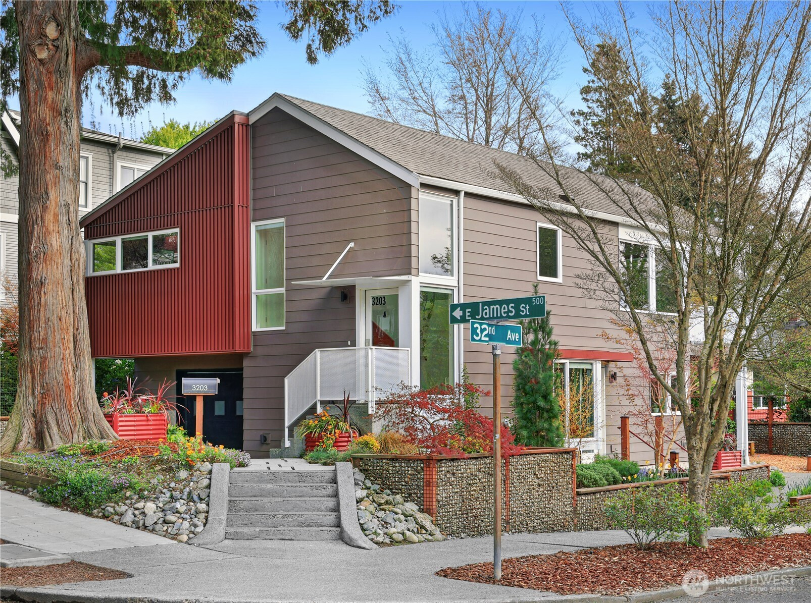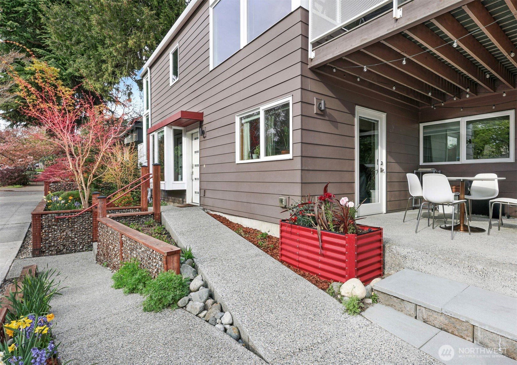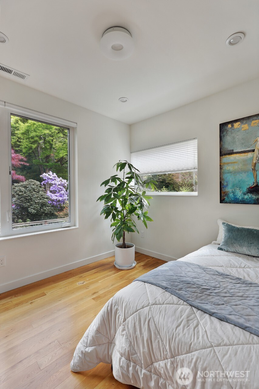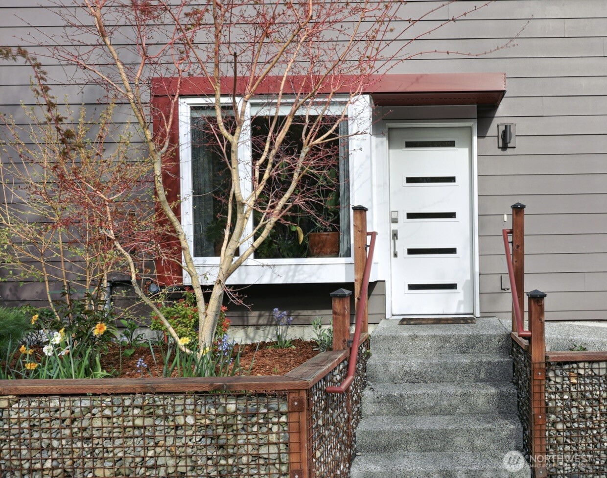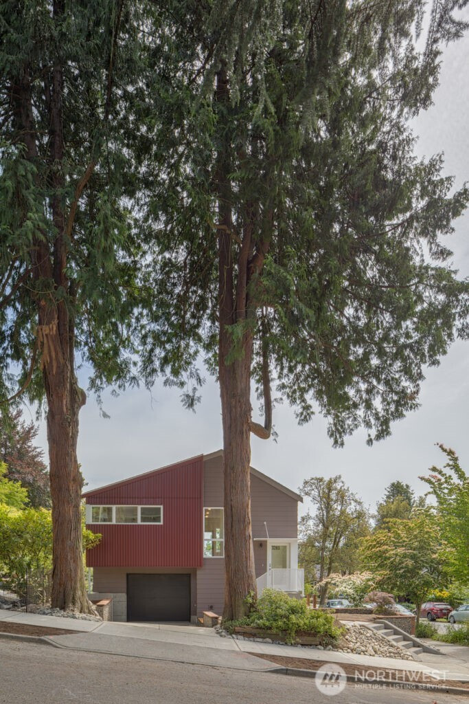 On a quiet Madrona corner lot, this modern home blends thoughtful design with everyday practicality. Built in 2020, it includes a light-filled upper home and a well-appointed lower-level ADU. The main level features soaring ceilings with exposed trusses and a wall of windows framing leafy neighborhood views. A generous island anchors the kitchen, flowing seamlessly to dining and living spaces, with a deck extending outdoors. The primary bedroom offers skylights and open trusses, with a refined ensuite featuring warm tile, a walk-in shower, and a Japanese soaking tub. A flexible second room with glass wall serves as bedroom or office, with an adjacent 3/4 bath in cool blue tile. The lower ADU, with separate entry, offers concrete floors, a galley kitchen in white cabinetry and cheerful tile work that extends to an outdoor patio. A window seat with garden views adds charm to the main living area. Generous bedroom, and 3/4 bath in clean white tile and in unit W/D. Outdoors, a gabion wall of stone and steel mesh creates privacy with an organic, open feel. Low-maintenance grounds with raised garden beds. Heat pump, radiant heated concrete floors and attached garage with ample storage. A modern in-city dwelling ideal for a contemporary lifestyle in one of Seattle's best residential neighborhoods.