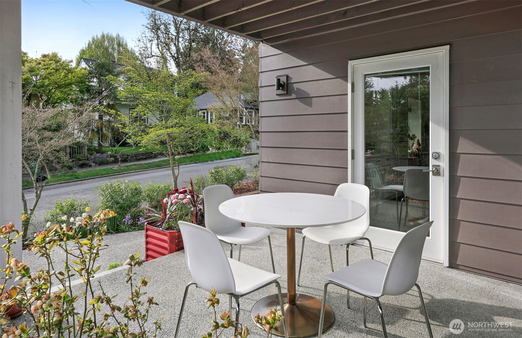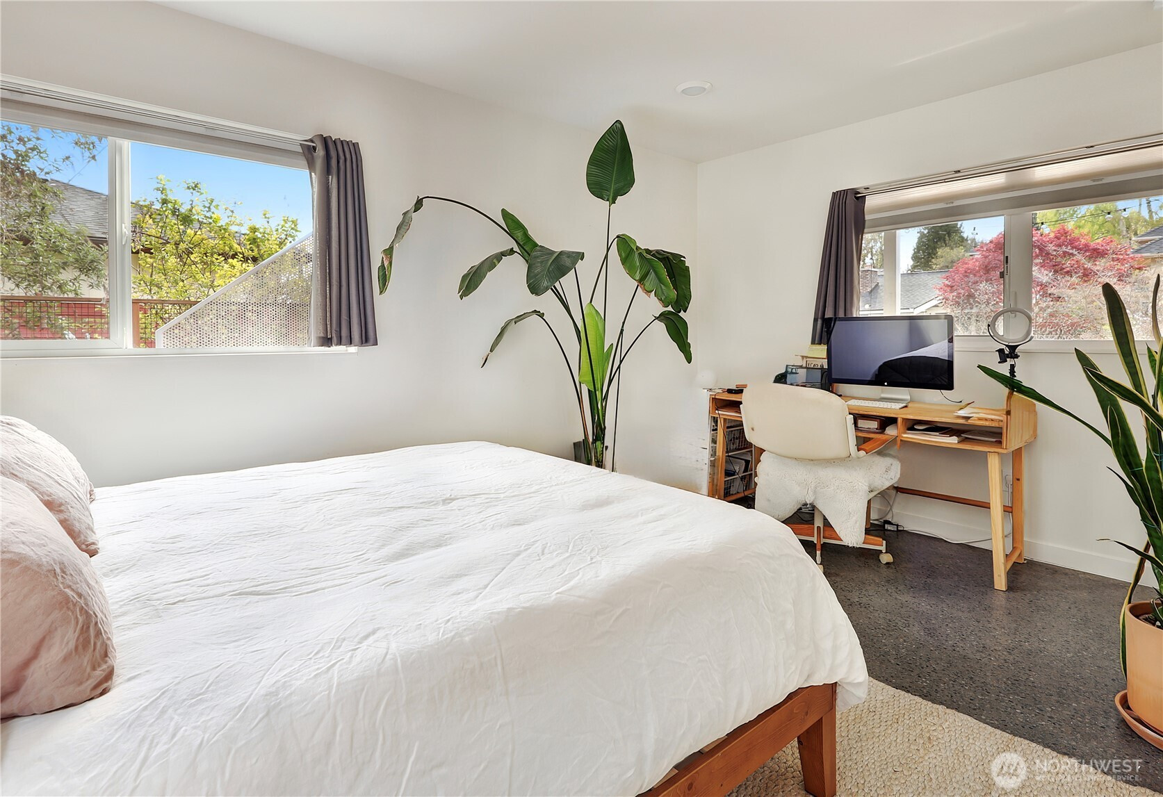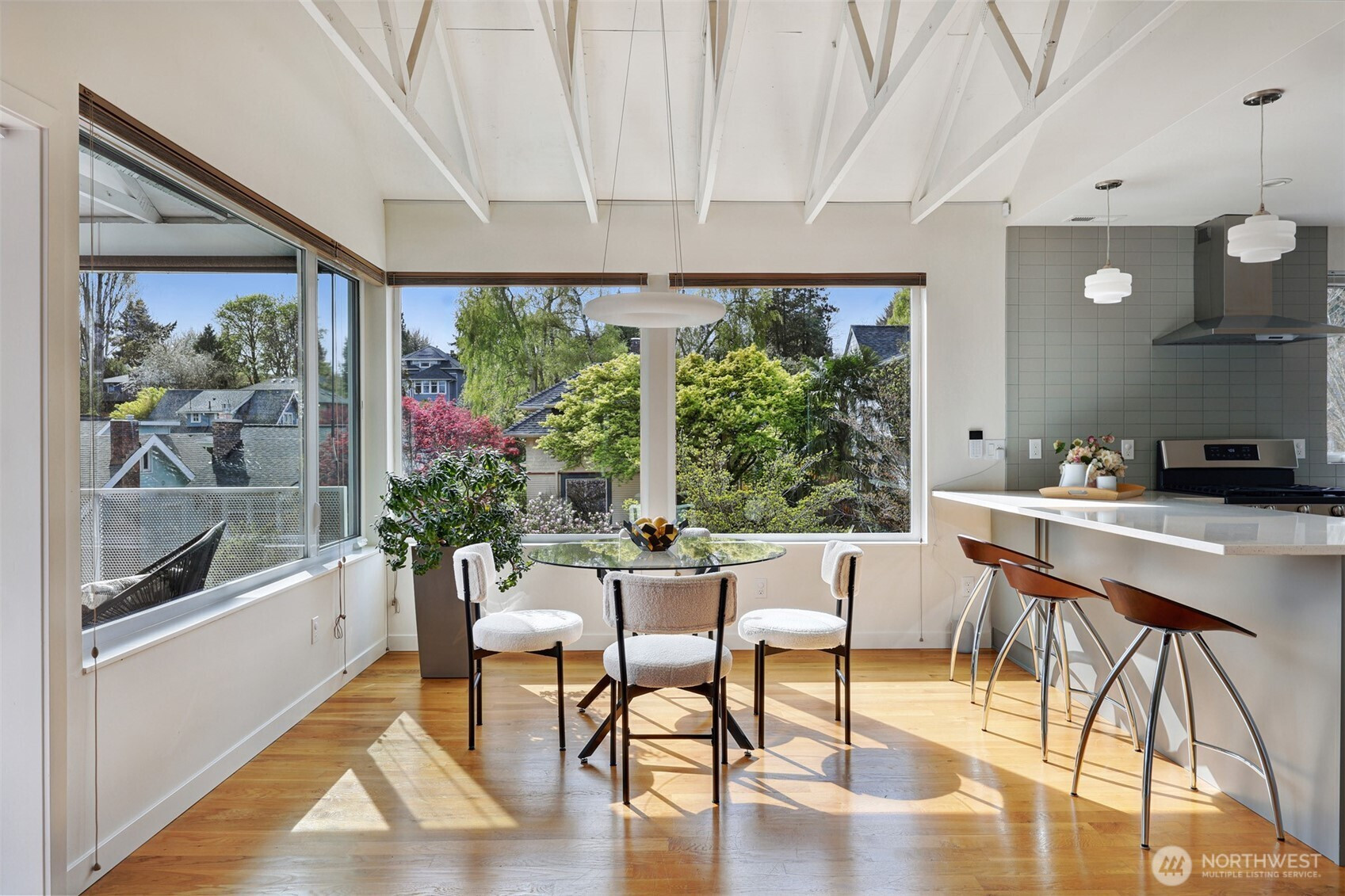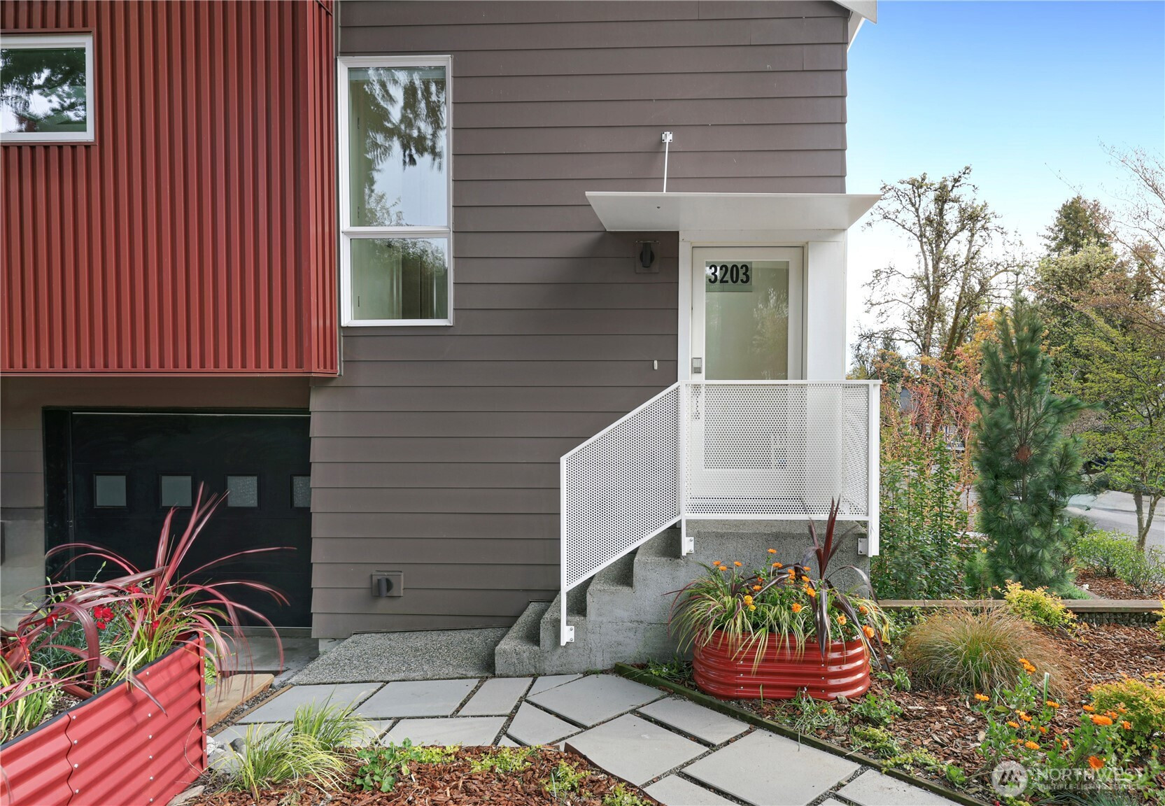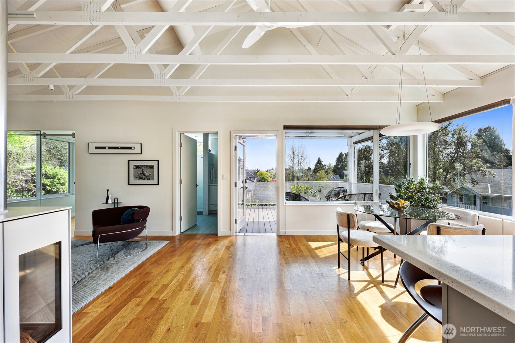 On a quiet Madrona corner lot, this modern home blends thoughtful design with everyday practicality. Built in 2020, it includes a light-filled upper home and a well-appointed lower-level ADU. The main level features soaring ceilings with exposed trusses and a wall of windows framing leafy neighborhood views. A generous island anchors the kitchen, flowing seamlessly to dining and living spaces, with a deck extending outdoors. The primary bedroom offers skylights and open trusses, with a refined ensuite featuring warm tile, a walk-in shower, and a Japanese soaking tub. A flexible second room with glass wall serves as bedroom or office, with an adjacent 3/4 bath in cool blue tile. The lower ADU, with separate entry, offers concrete floors, a galley kitchen in white cabinetry and cheerful tile work that extends to an outdoor patio. A window seat with garden views adds charm to the main living area. Generous bedroom, and 3/4 bath in clean white tile and in unit W/D. Outdoors, a gabion wall of stone and steel mesh creates privacy with an organic, open feel. Low-maintenance grounds with raised garden beds. Heat pump, radiant heated concrete floors and attached garage with ample storage. A modern in-city dwelling ideal for a contemporary lifestyle in one of Seattle's best residential neighborhoods.