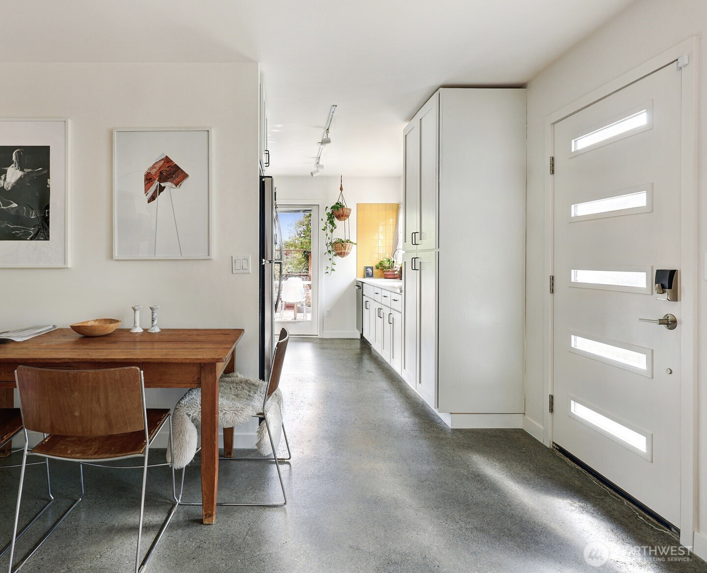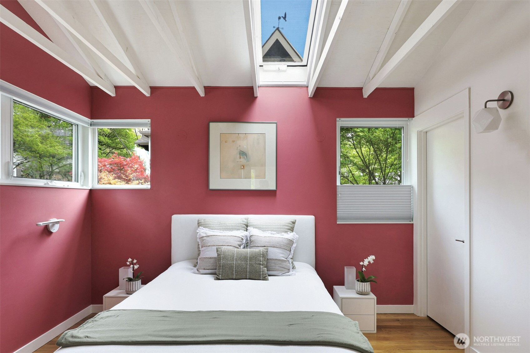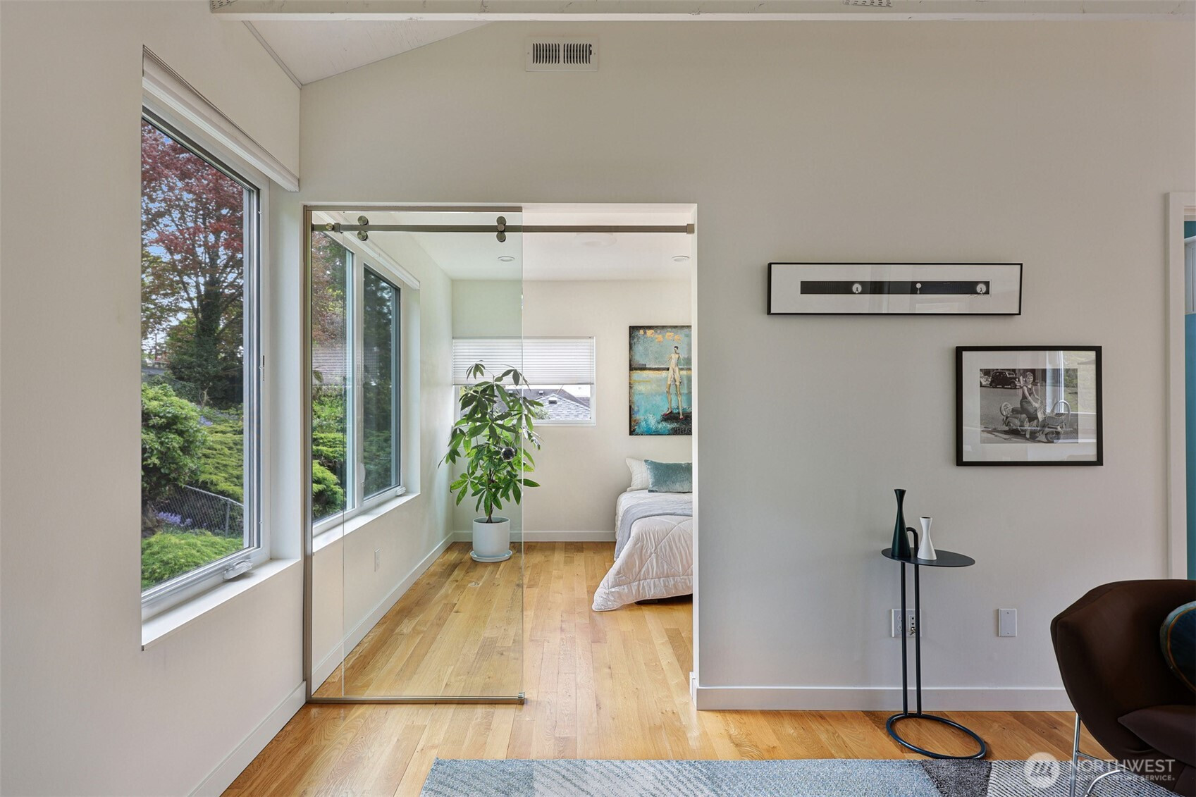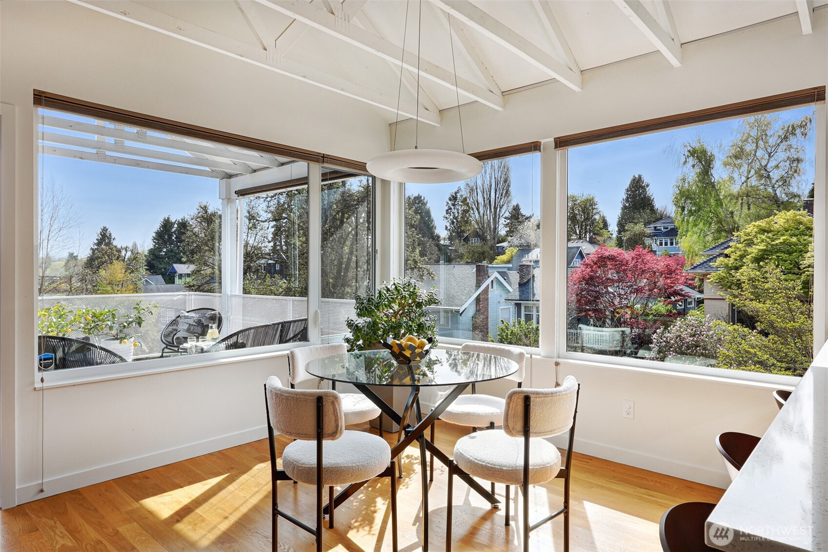 On a quiet Madrona corner lot, this modern home blends thoughtful design with everyday practicality. Built in 2020, it includes a light-filled upper home and a well-appointed lower-level ADU. The main level features soaring ceilings with exposed trusses and a wall of windows framing leafy neighborhood views. A generous island anchors the kitchen, flowing seamlessly to dining and living spaces, with a deck extending outdoors. The primary bedroom offers skylights and open trusses, with a refined ensuite featuring warm tile, a walk-in shower, and a Japanese soaking tub. A flexible second room with glass wall serves as bedroom or office, with an adjacent 3/4 bath in cool blue tile. The lower ADU, with separate entry, offers concrete floors, a galley kitchen in white cabinetry and cheerful tile work that extends to an outdoor patio. A window seat with garden views adds charm to the main living area. Generous bedroom, and 3/4 bath in clean white tile and in unit W/D. Outdoors, a gabion wall of stone and steel mesh creates privacy with an organic, open feel. Low-maintenance grounds with raised garden beds. Heat pump, radiant heated concrete floors and attached garage with ample storage. A modern in-city dwelling ideal for a contemporary lifestyle in one of Seattle's best residential neighborhoods.