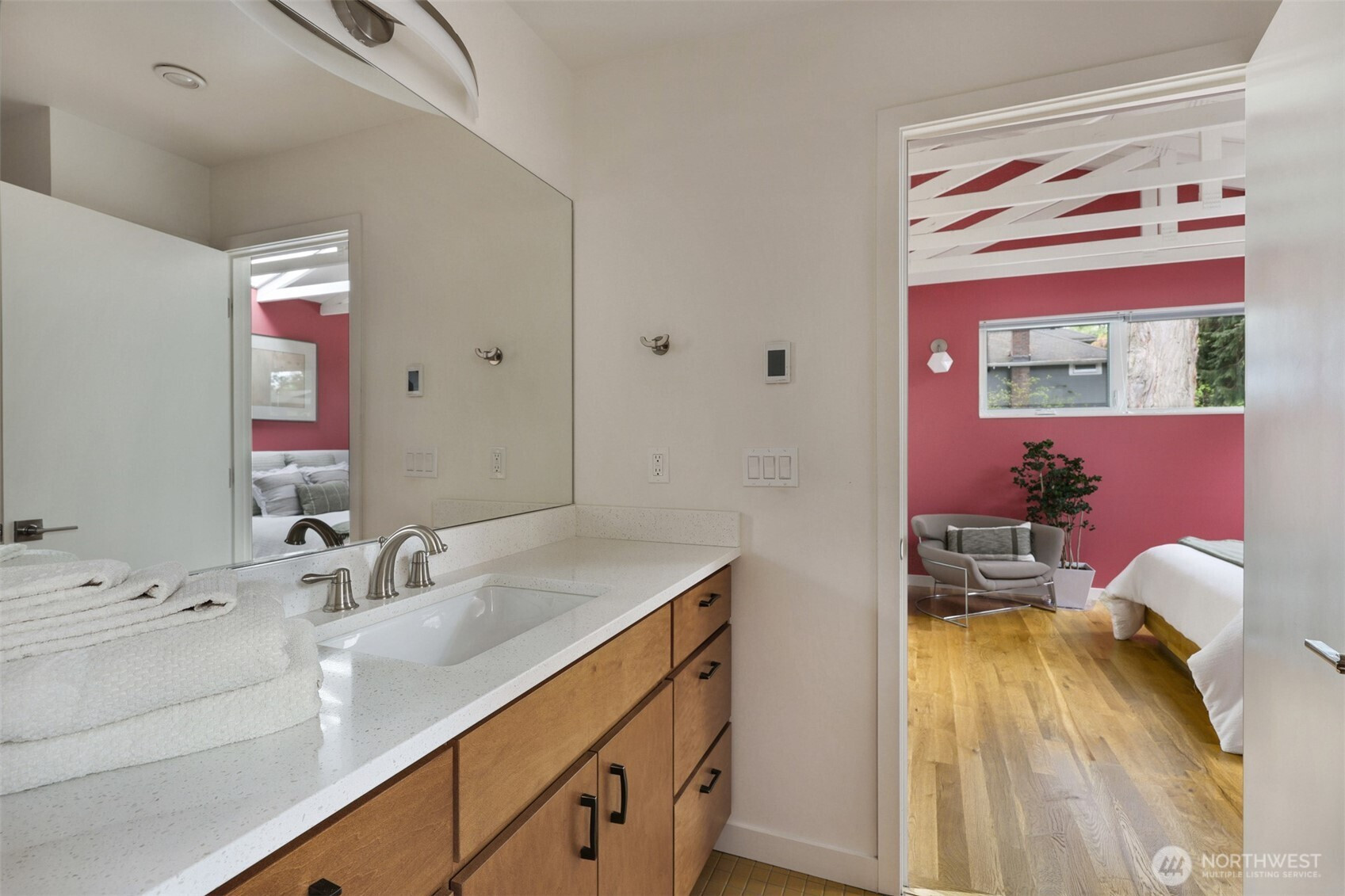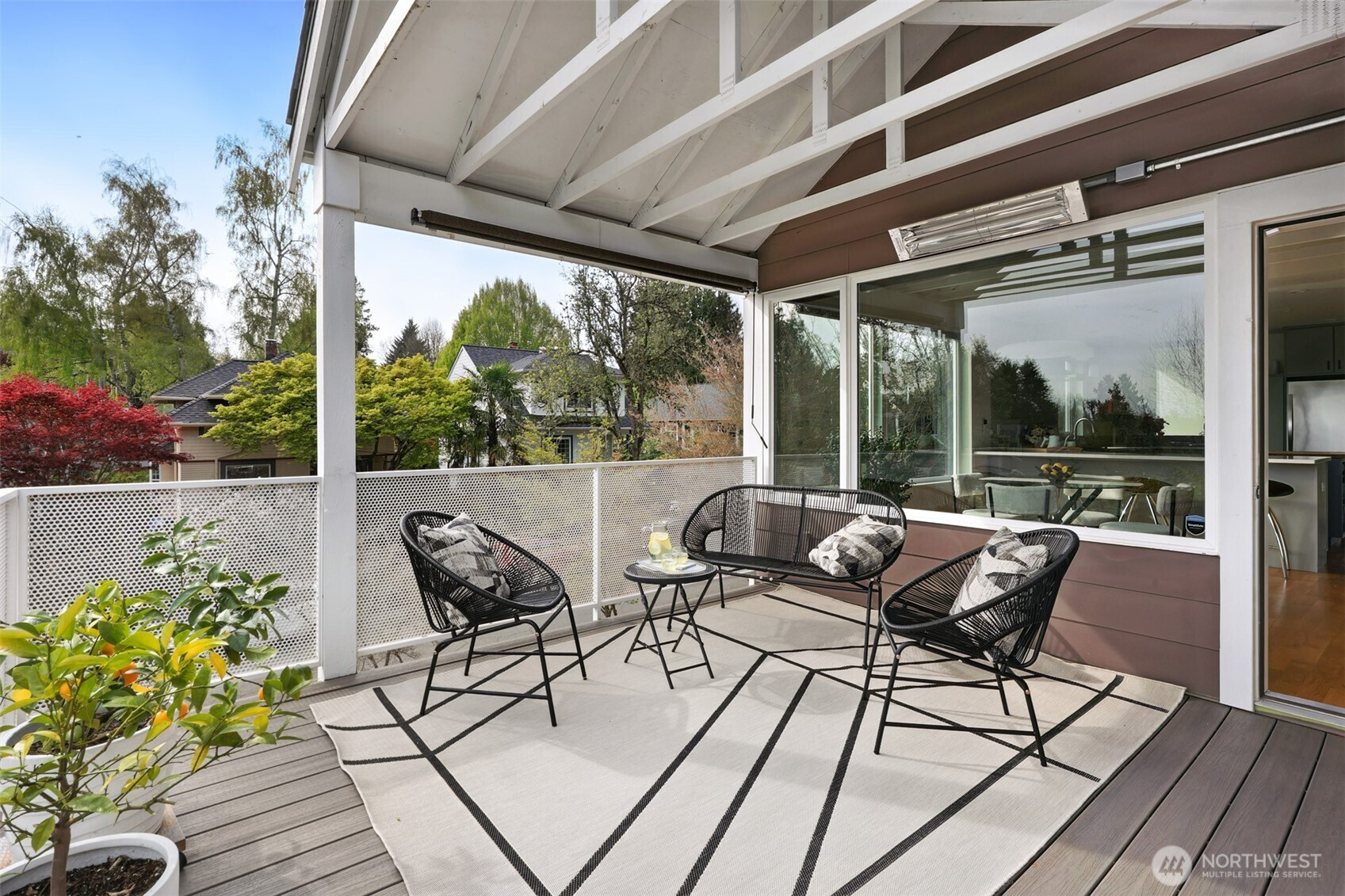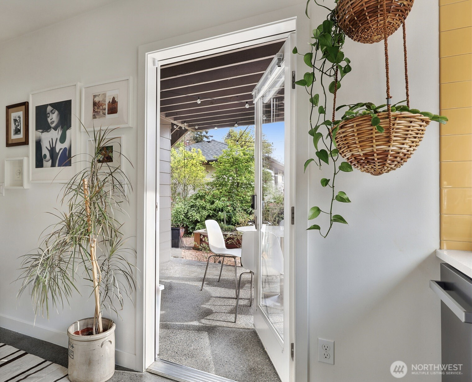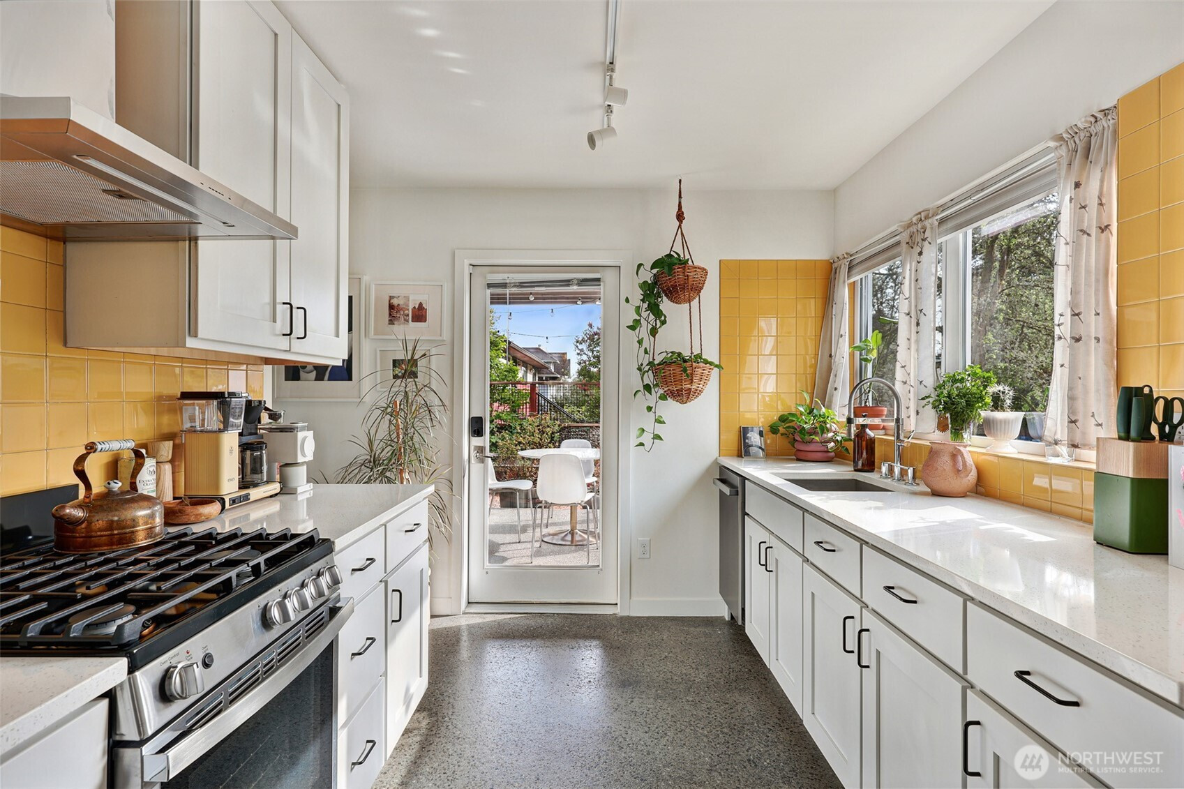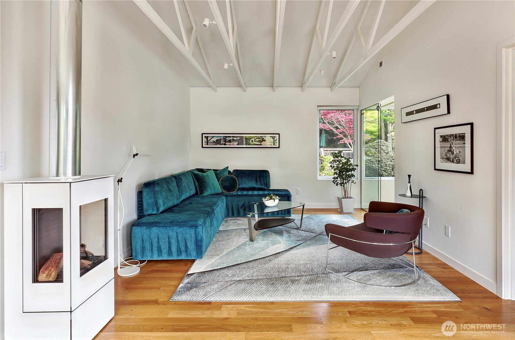 On a quiet Madrona corner lot, this modern home blends thoughtful design with everyday practicality. Built in 2020, it includes a light-filled upper home and a well-appointed lower-level ADU. The main level features soaring ceilings with exposed trusses and a wall of windows framing leafy neighborhood views. A generous island anchors the kitchen, flowing seamlessly to dining and living spaces, with a deck extending outdoors. The primary bedroom offers skylights and open trusses, with a refined ensuite featuring warm tile, a walk-in shower, and a Japanese soaking tub. A flexible second room with glass wall serves as bedroom or office, with an adjacent 3/4 bath in cool blue tile. The lower ADU, with separate entry, offers concrete floors, a galley kitchen in white cabinetry and cheerful tile work that extends to an outdoor patio. A window seat with garden views adds charm to the main living area. Generous bedroom, and 3/4 bath in clean white tile and in unit W/D. Outdoors, a gabion wall of stone and steel mesh creates privacy with an organic, open feel. Low-maintenance grounds with raised garden beds. Heat pump, radiant heated concrete floors and attached garage with ample storage. A modern in-city dwelling ideal for a contemporary lifestyle in one of Seattle's best residential neighborhoods.