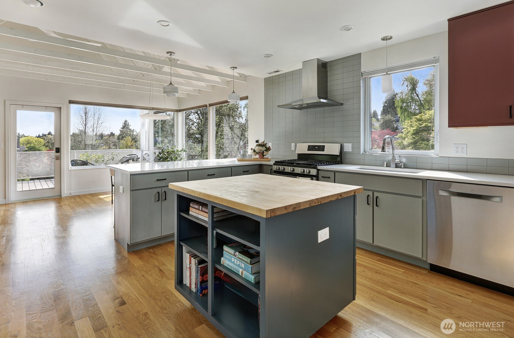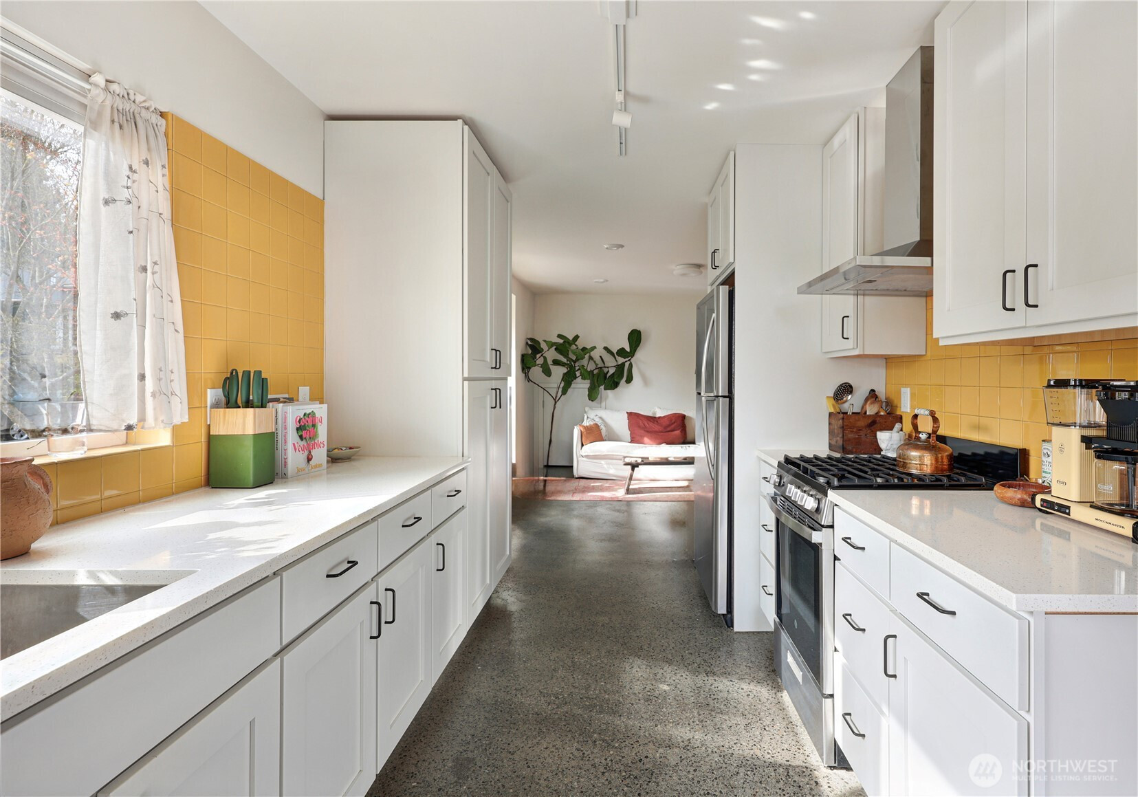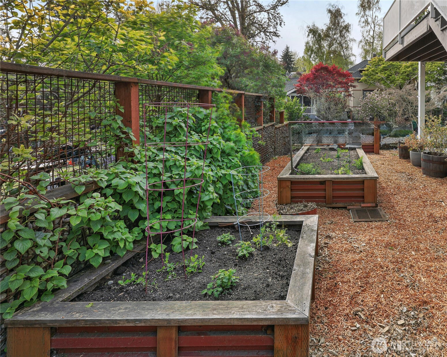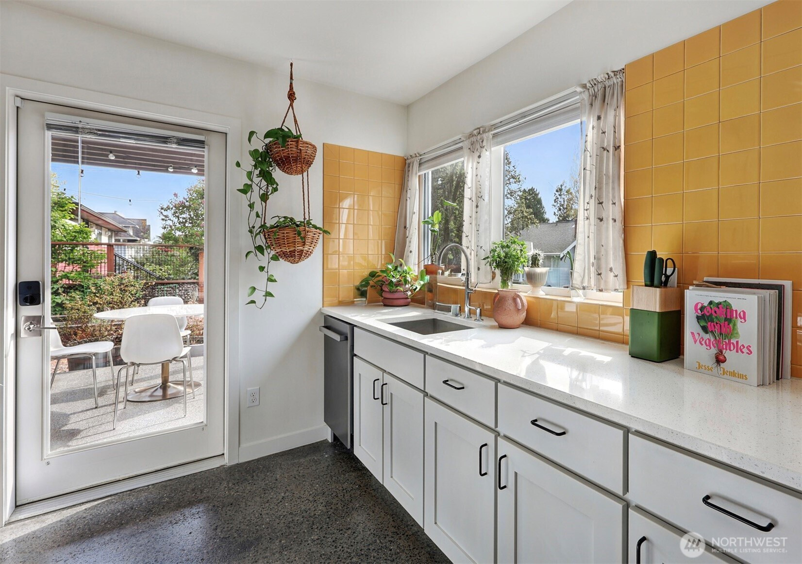 On a quiet Madrona corner lot, this modern home blends thoughtful design with everyday practicality. Built in 2020, it includes a light-filled upper home and a well-appointed lower-level ADU. The main level features soaring ceilings with exposed trusses and a wall of windows framing leafy neighborhood views. A generous island anchors the kitchen, flowing seamlessly to dining and living spaces, with a deck extending outdoors. The primary bedroom offers skylights and open trusses, with a refined ensuite featuring warm tile, a walk-in shower, and a Japanese soaking tub. A flexible second room with glass wall serves as bedroom or office, with an adjacent 3/4 bath in cool blue tile. The lower ADU, with separate entry, offers concrete floors, a galley kitchen in white cabinetry and cheerful tile work that extends to an outdoor patio. A window seat with garden views adds charm to the main living area. Generous bedroom, and 3/4 bath in clean white tile and in unit W/D. Outdoors, a gabion wall of stone and steel mesh creates privacy with an organic, open feel. Low-maintenance grounds with raised garden beds. Heat pump, radiant heated concrete floors and attached garage with ample storage. A modern in-city dwelling ideal for a contemporary lifestyle in one of Seattle's best residential neighborhoods.