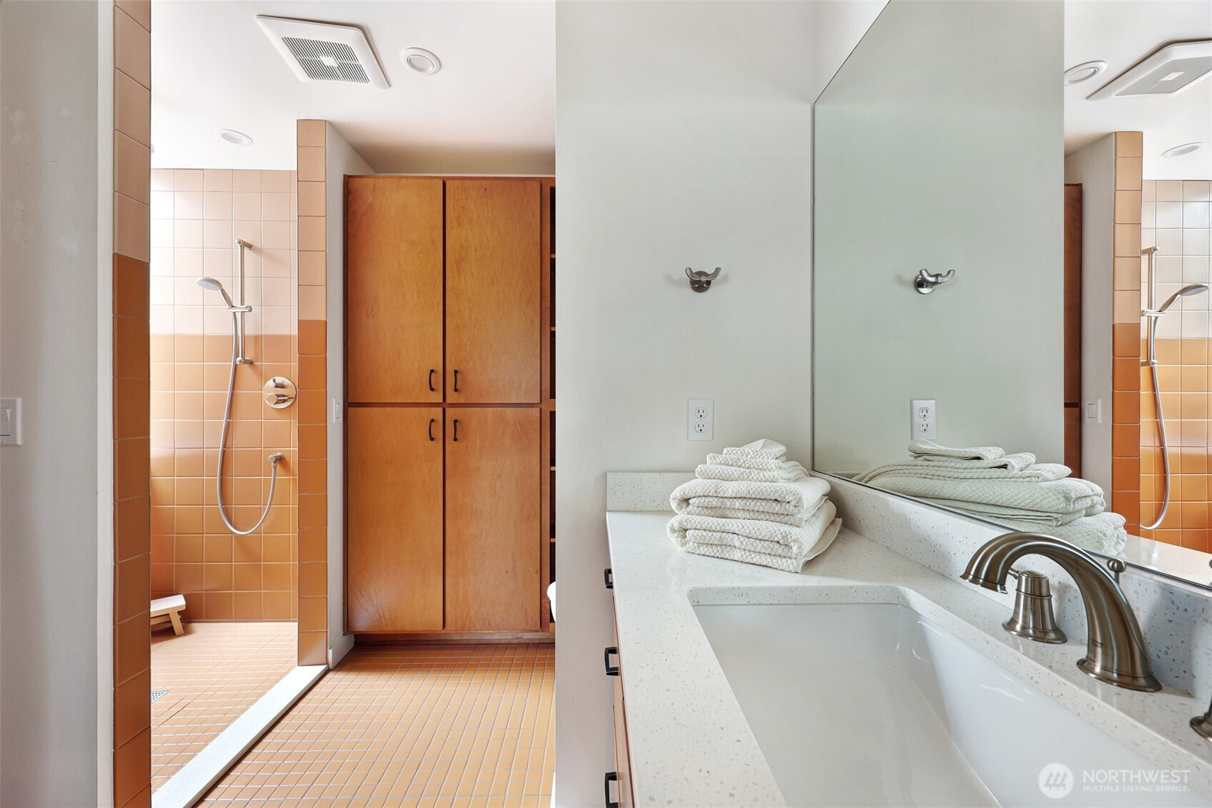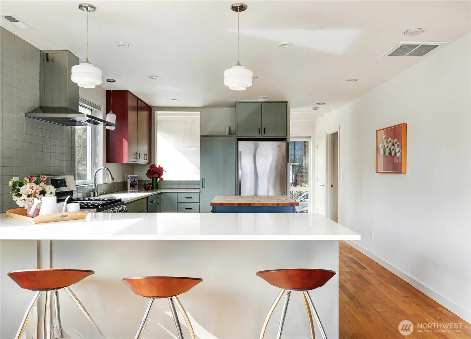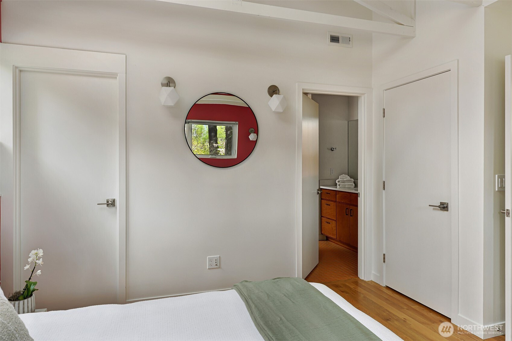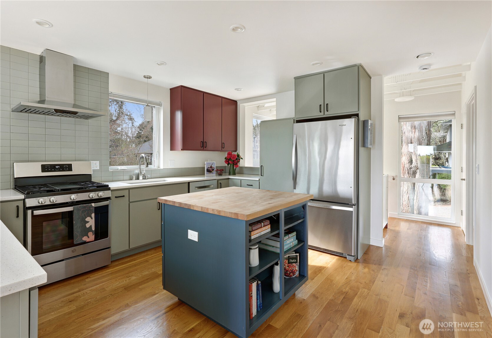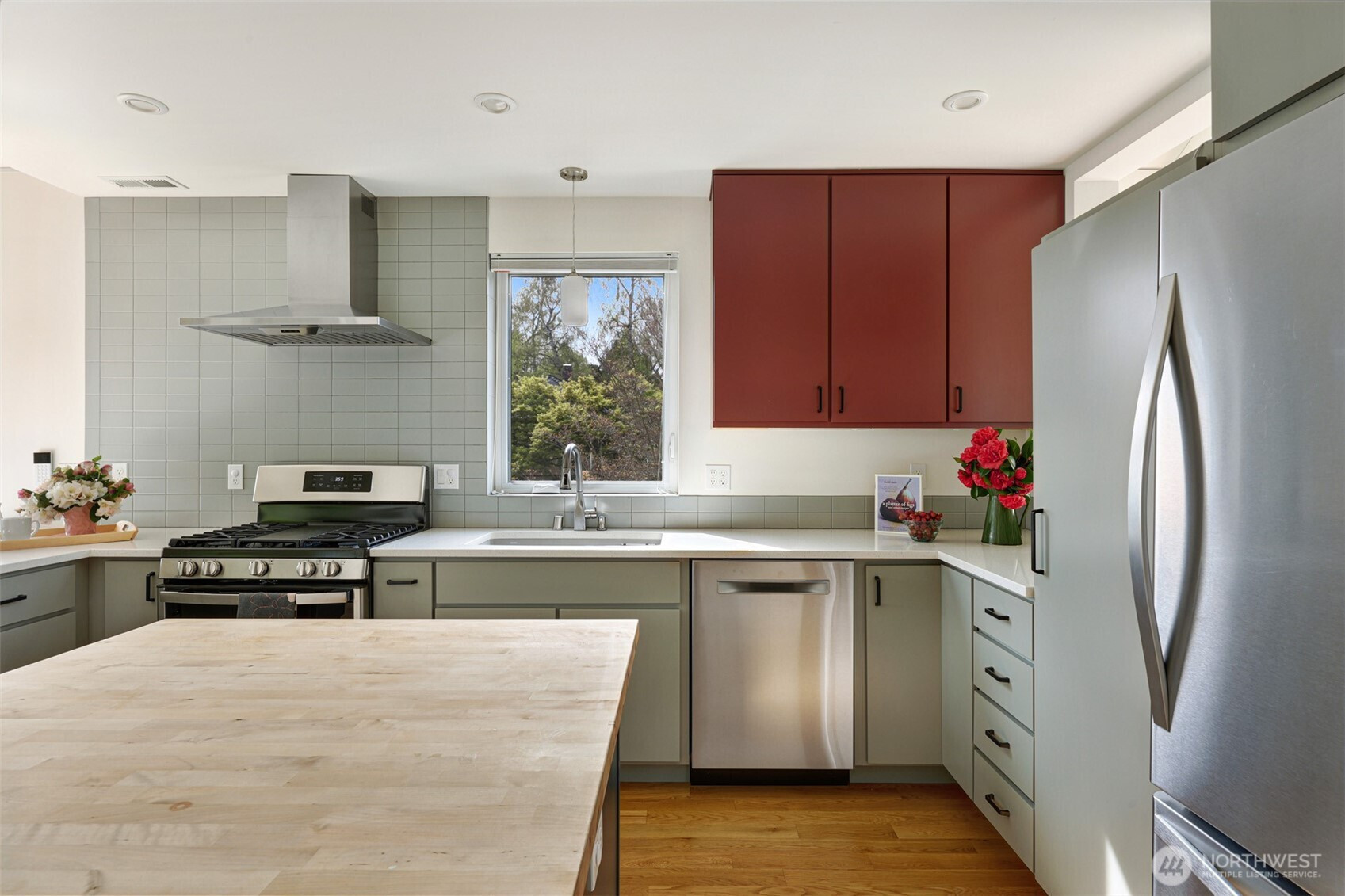 On a quiet Madrona corner lot, this modern home blends thoughtful design with everyday practicality. Built in 2020, it includes a light-filled upper home and a well-appointed lower-level ADU. The main level features soaring ceilings with exposed trusses and a wall of windows framing leafy neighborhood views. A generous island anchors the kitchen, flowing seamlessly to dining and living spaces, with a deck extending outdoors. The primary bedroom offers skylights and open trusses, with a refined ensuite featuring warm tile, a walk-in shower, and a Japanese soaking tub. A flexible second room with glass wall serves as bedroom or office, with an adjacent 3/4 bath in cool blue tile. The lower ADU, with separate entry, offers concrete floors, a galley kitchen in white cabinetry and cheerful tile work that extends to an outdoor patio. A window seat with garden views adds charm to the main living area. Generous bedroom, and 3/4 bath in clean white tile and in unit W/D. Outdoors, a gabion wall of stone and steel mesh creates privacy with an organic, open feel. Low-maintenance grounds with raised garden beds. Heat pump, radiant heated concrete floors and attached garage with ample storage. A modern in-city dwelling ideal for a contemporary lifestyle in one of Seattle's best residential neighborhoods.