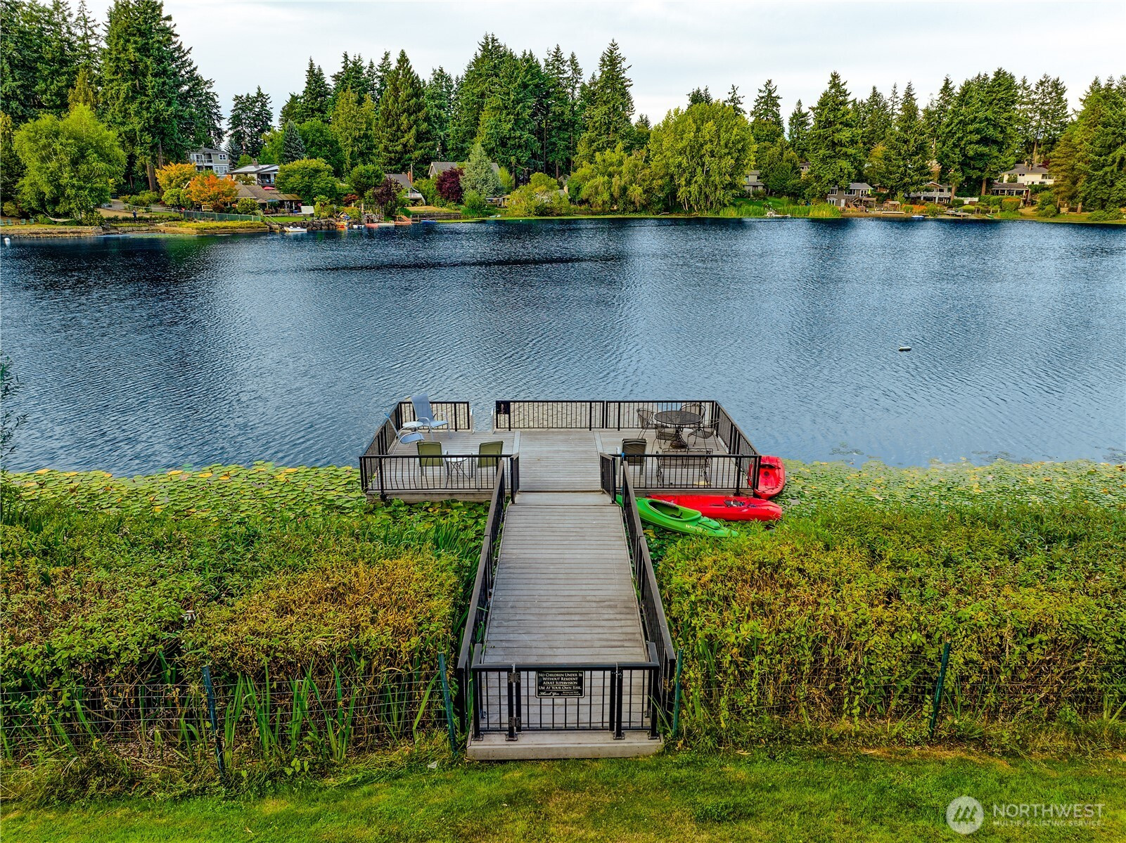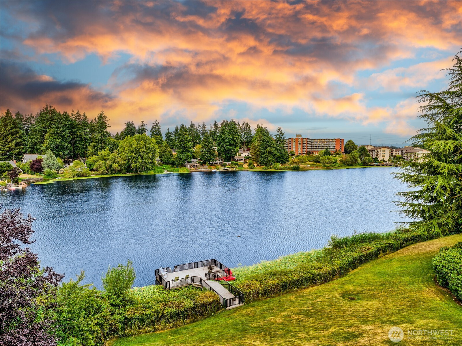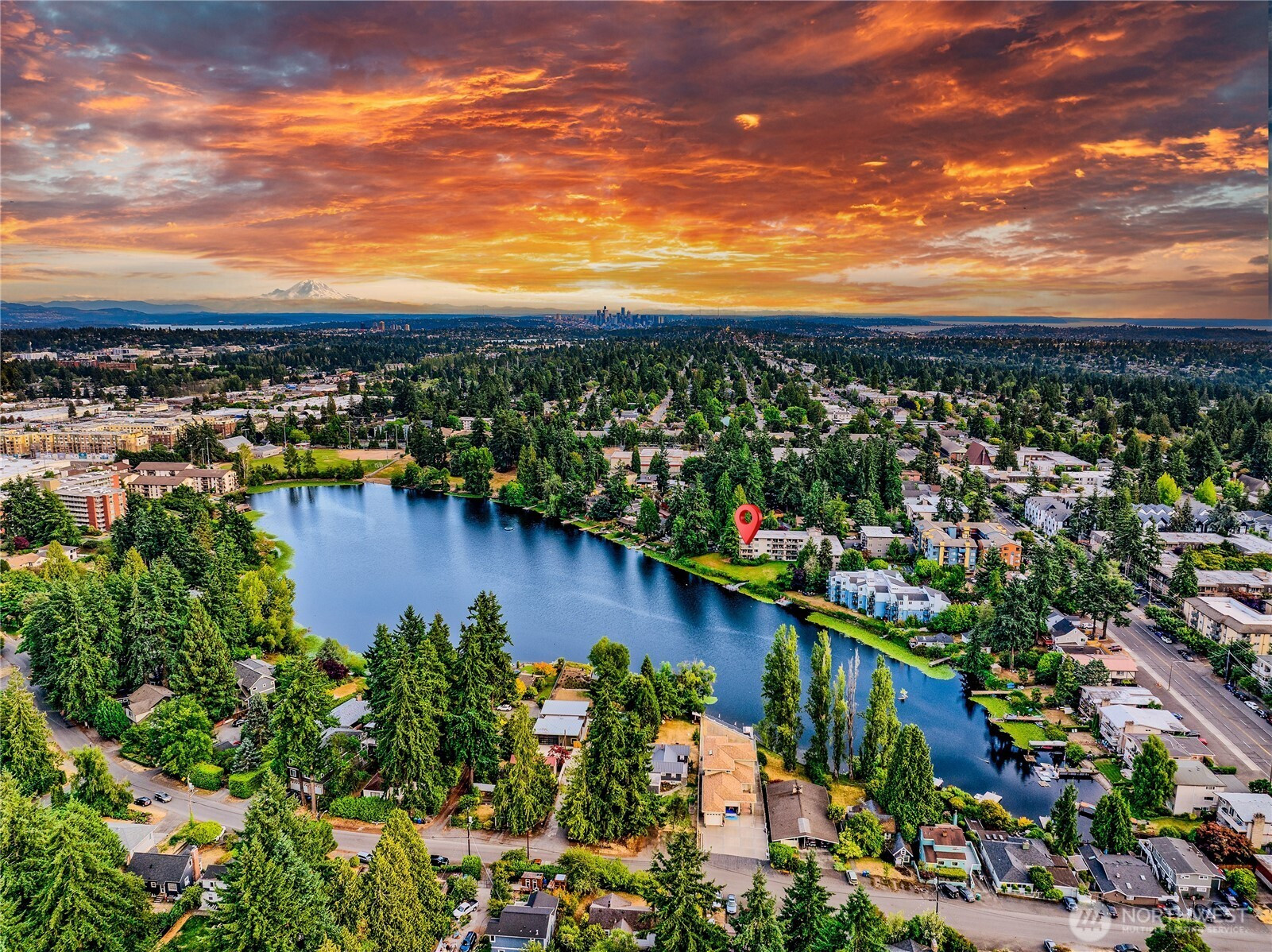 Experience waterfront living on Bitter Lake in this fully remodeled corner residence, where city noise fades and uninterrupted 180° lake and territorial views define every moment. Light and water shape a living backdrop from sunrise to sunset. Morning light pours through expansive windows, filling the home with calm. Afternoons offer quiet reflection over water and trees, while evenings glow with warmth as interior lighting contrasts the darkening lake, creating a private, restorative atmosphere. The 2-bedroom, 1.5-bath layout offers an efficient, open flow between living, dining, and kitchen areas. The updated kitchen features granite countertops, quality finishes, and functional design suited to daily living and entertaining. A wood-burning fireplace anchors the living room, adding warmth and texture against the view-driven setting. Step onto the covered private balcony for a fully immersive experience, fresh air, shifting light, and uninterrupted lake views. Bathrooms are tastefully updated, and recent interior paint enhances a clean, well-maintained feel throughout. Community amenities include a private dock for kayaking and paddleboarding, in-unit laundry, dedicated parking, private storage, and ample guest parking. Ideally located minutes to the Interurban Trail, parks, shopping, and dining. Do not miss this rare opportunity to own a true waterfront retreat on Bitter Lake, schedule your private showing today.