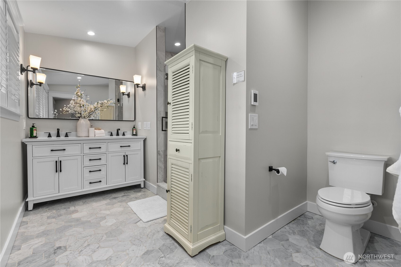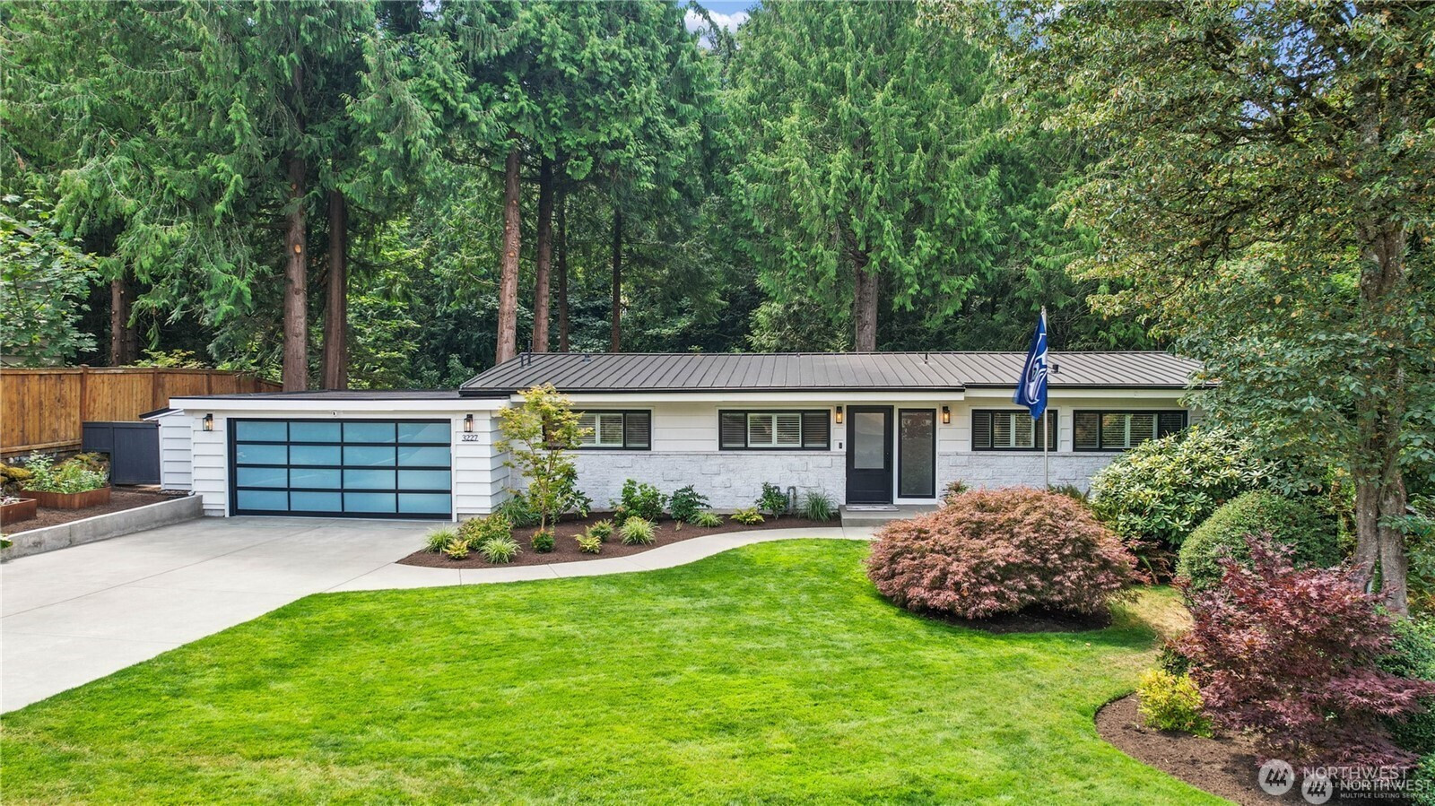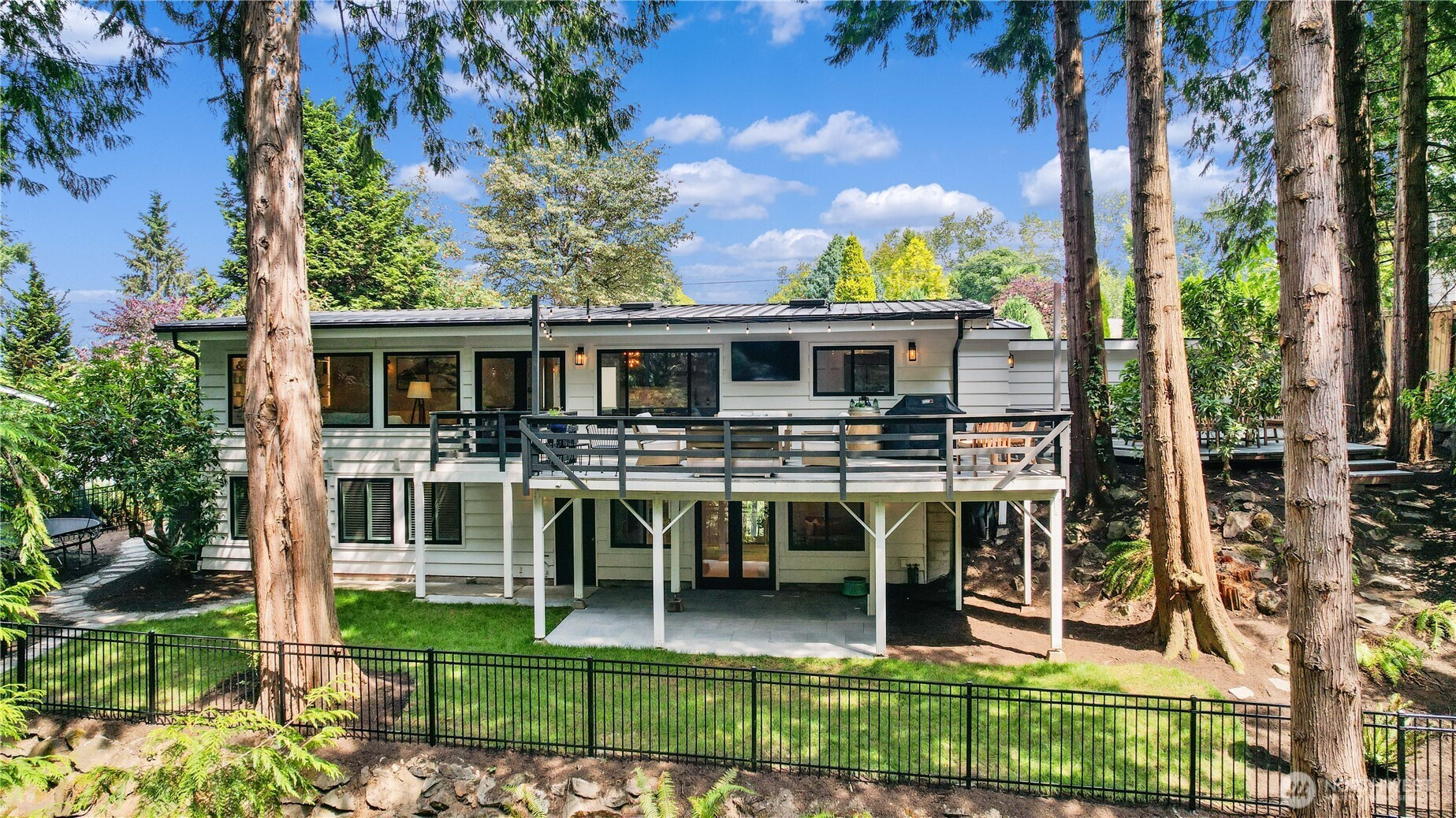 Fully remodeled West Bellevue 4-bedroom, 3-bath home spanning 2,960 sq ft, where modern sophistication meets timeless craftsmanship. Interiors are filled with natural light from skylights and expansive windows, showcasing wide-plank white oak hardwoods, crown molding, and solid wood interior doors throughout. The open-concept main level is anchored by a showpiece chef’s kitchen with professional-grade appliances, soapstone countertops, dual dishwashers, and a marble wet bar—ideal for effortless entertaining. Living spaces are warmed by an Astria gas fireplace and flow seamlessly for everyday living and hosting. The main-floor primary suite offers a spa-like retreat with heated tile floors, a Carrara marble shower, and Graber wood shutters. A second bedroom completes the main level. Downstairs, find two additional bedrooms, a media lounge with bar, and a flexible gym or wellness space. Comfort and reliability are assured with a Bryant Evolution heat pump for efficient heating and A/C, a Rheem water heater with recirculation pump, and a Honeywell standby generator. Additional highlights include a Tesla charger and integrated smart home systems controlling lighting, climate, appliances, and surround sound. Outdoors, a fully fenced backyard retreat backs to a tranquil creek and lush natural surroundings. Ideally located minutes from downtown Bellevue, Kirkland, Redmond, and award-winning schools.