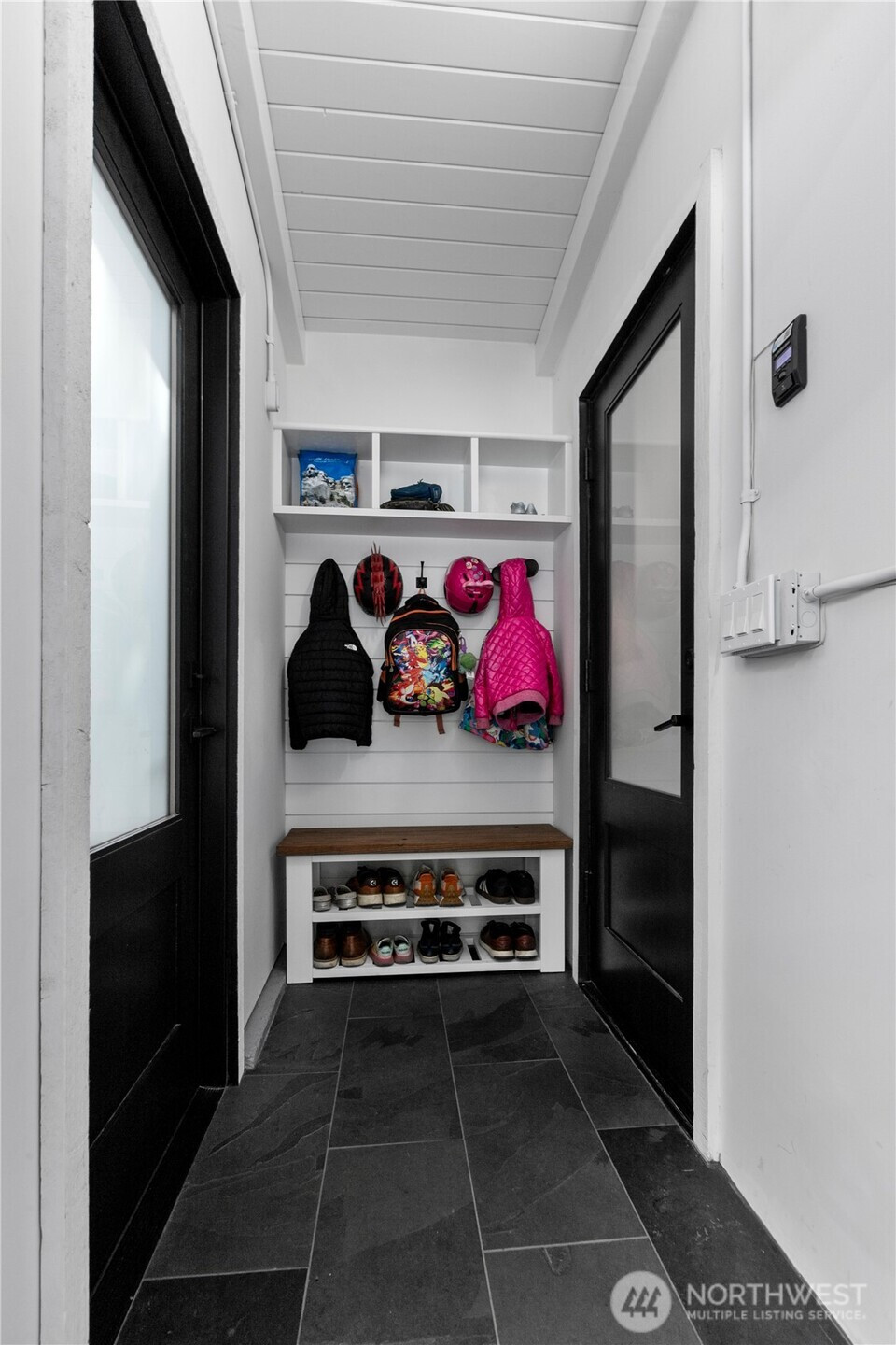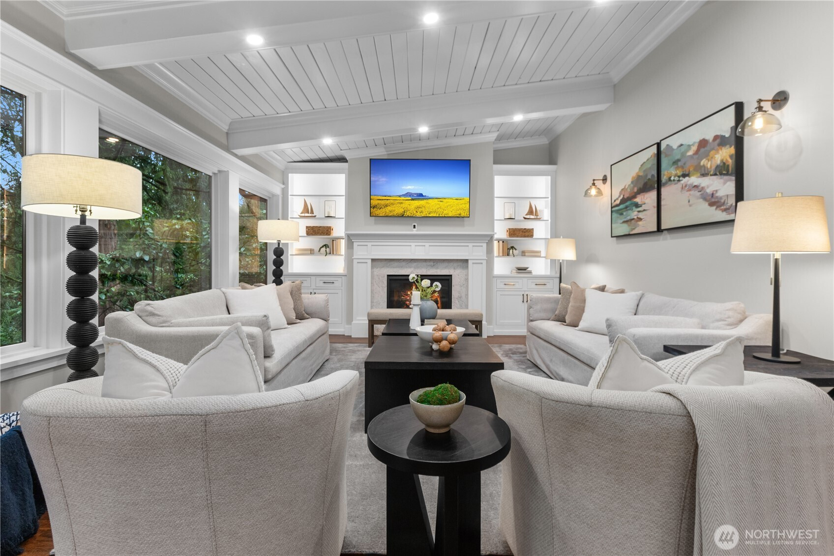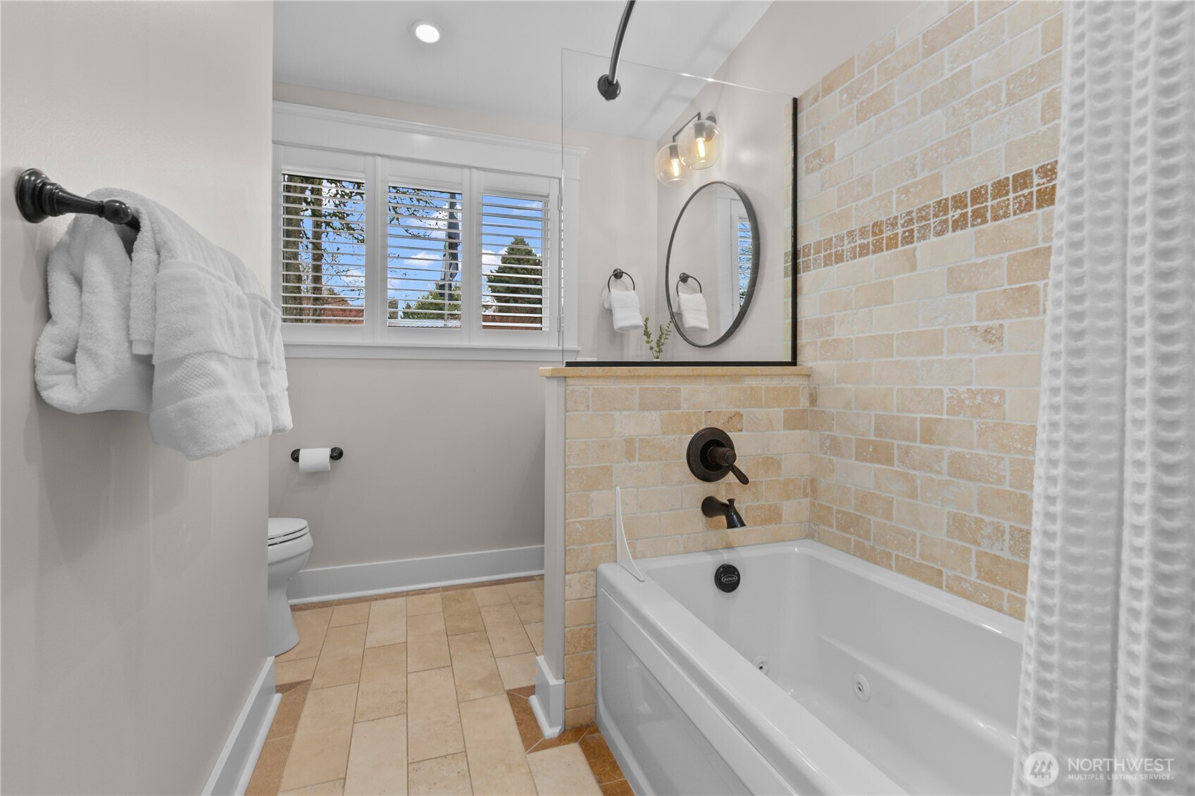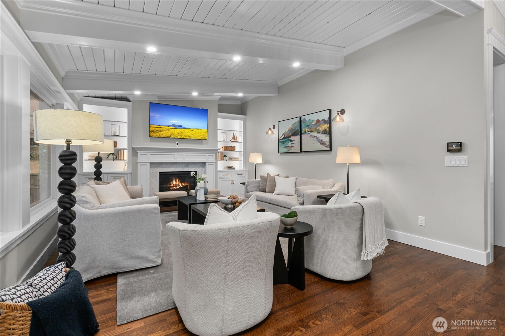 Fully remodeled West Bellevue 4-bedroom, 3-bath home spanning 2,960 sq ft, where modern sophistication meets timeless craftsmanship. Interiors are filled with natural light from skylights and expansive windows, showcasing wide-plank white oak hardwoods, crown molding, and solid wood interior doors throughout. The open-concept main level is anchored by a showpiece chef’s kitchen with professional-grade appliances, soapstone countertops, dual dishwashers, and a marble wet bar—ideal for effortless entertaining. Living spaces are warmed by an Astria gas fireplace and flow seamlessly for everyday living and hosting. The main-floor primary suite offers a spa-like retreat with heated tile floors, a Carrara marble shower, and Graber wood shutters. A second bedroom completes the main level. Downstairs, find two additional bedrooms, a media lounge with bar, and a flexible gym or wellness space. Comfort and reliability are assured with a Bryant Evolution heat pump for efficient heating and A/C, a Rheem water heater with recirculation pump, and a Honeywell standby generator. Additional highlights include a Tesla charger and integrated smart home systems controlling lighting, climate, appliances, and surround sound. Outdoors, a fully fenced backyard retreat backs to a tranquil creek and lush natural surroundings. Ideally located minutes from downtown Bellevue, Kirkland, Redmond, and award-winning schools.