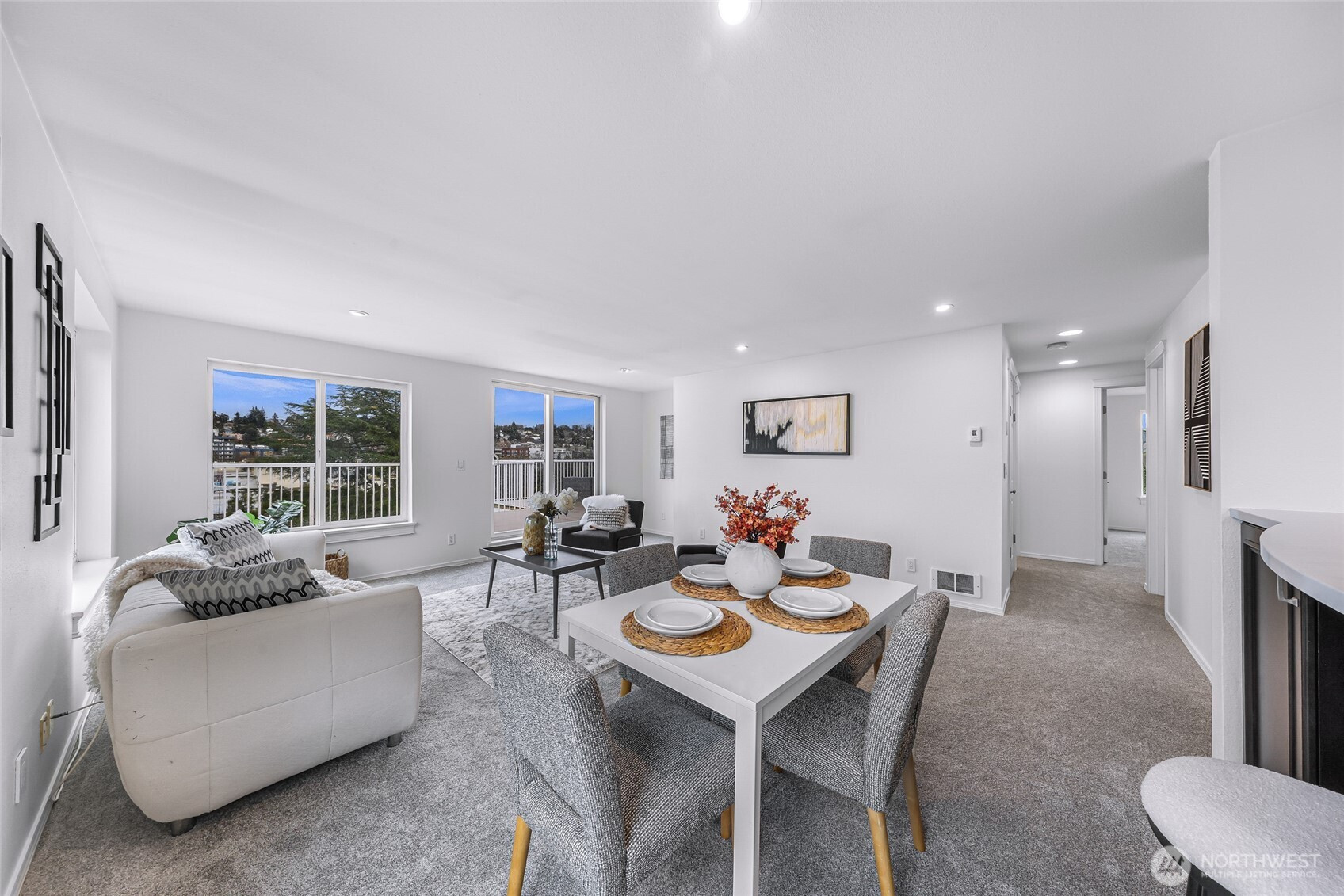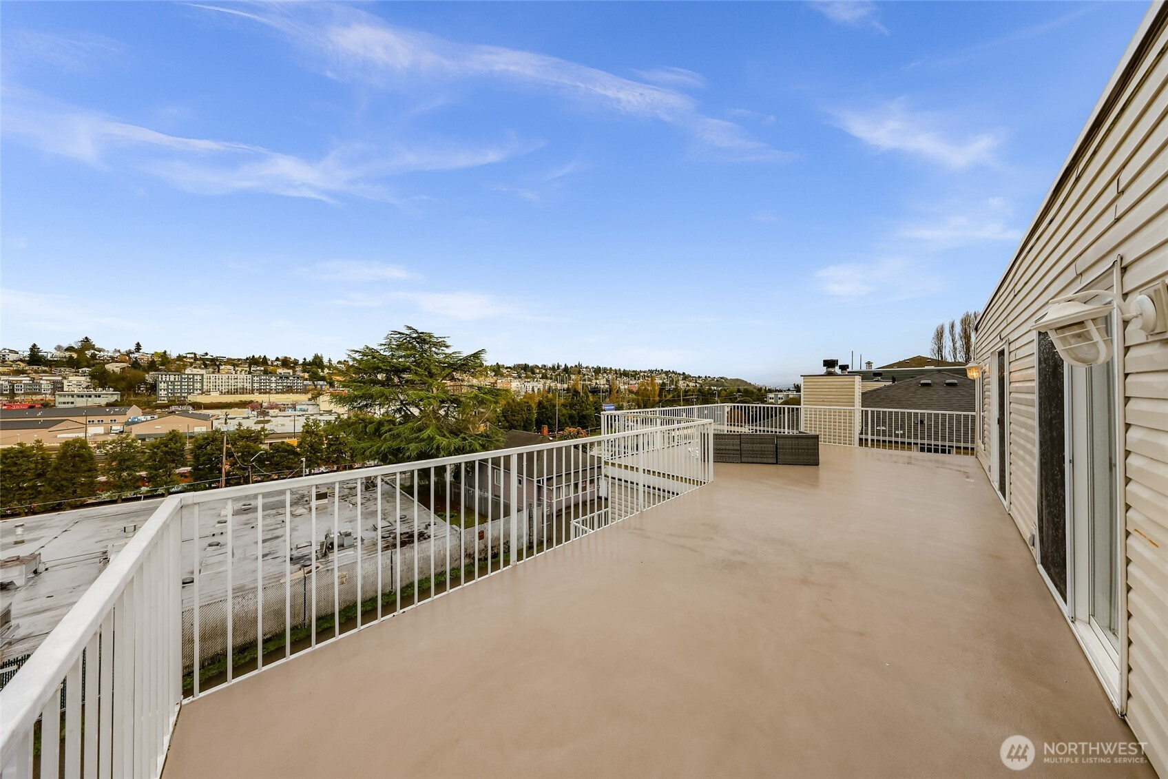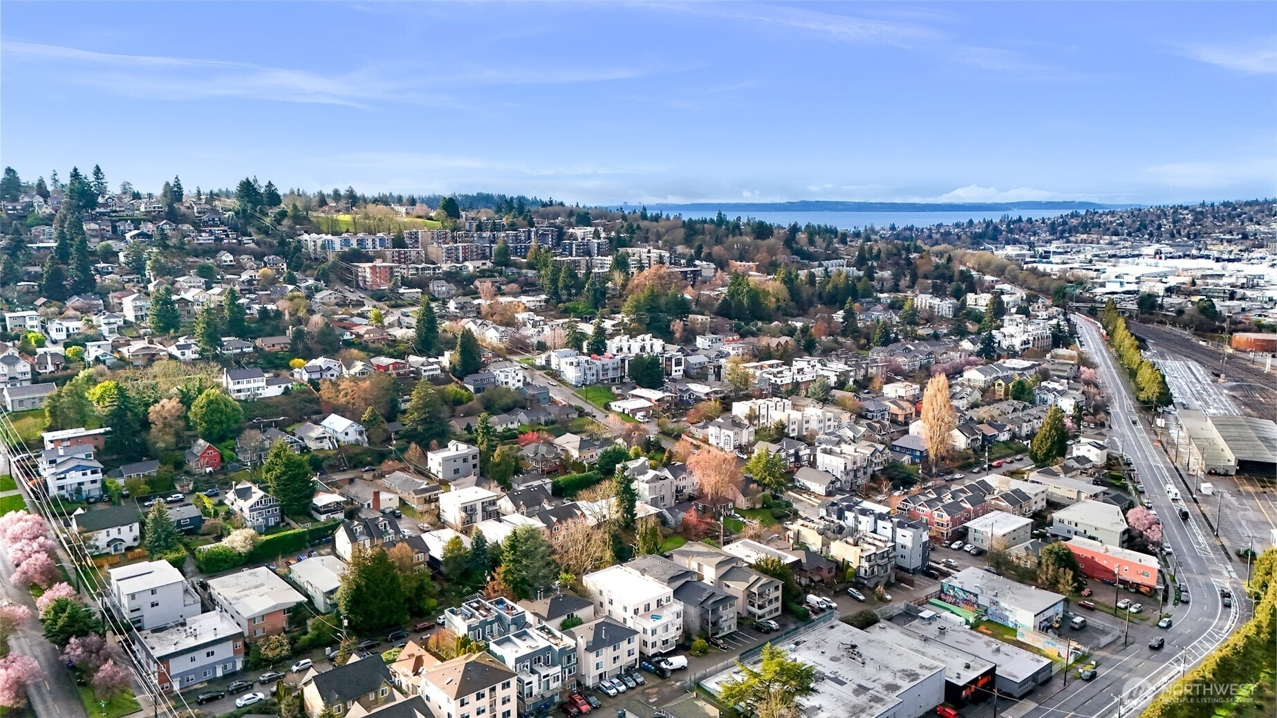 This end-unit Magnolia penthouse offers 2 bedrooms and 2 bathrooms, highlighted by a spacious, oversized private exterior deck that serves as an additional living area in warmer months—perfect for entertaining, container gardening, and enjoying the outdoors with no neighboring units in sight. Enjoy sweeping 180-degree views from Salmon Bay to the Seattle skyline. The interior has been freshly repainted and recarpeted, creating a bright, move-in-ready feel. An open-concept kitchen and living area flows seamlessly to the expansive deck—ideal for hosting guests or everyday living. The guest bedroom and full bath are thoughtfully positioned, while the primary suite features an ensuite bath, walk-in closet, direct deck access, and stunning views to wake up to each morning. Pets are welcome, and there is no rental cap. One parking space is included in the garage, along with a generous approx. 6' x 4.5' storage unit. Mortgage savings may be available for buyers of this listing.