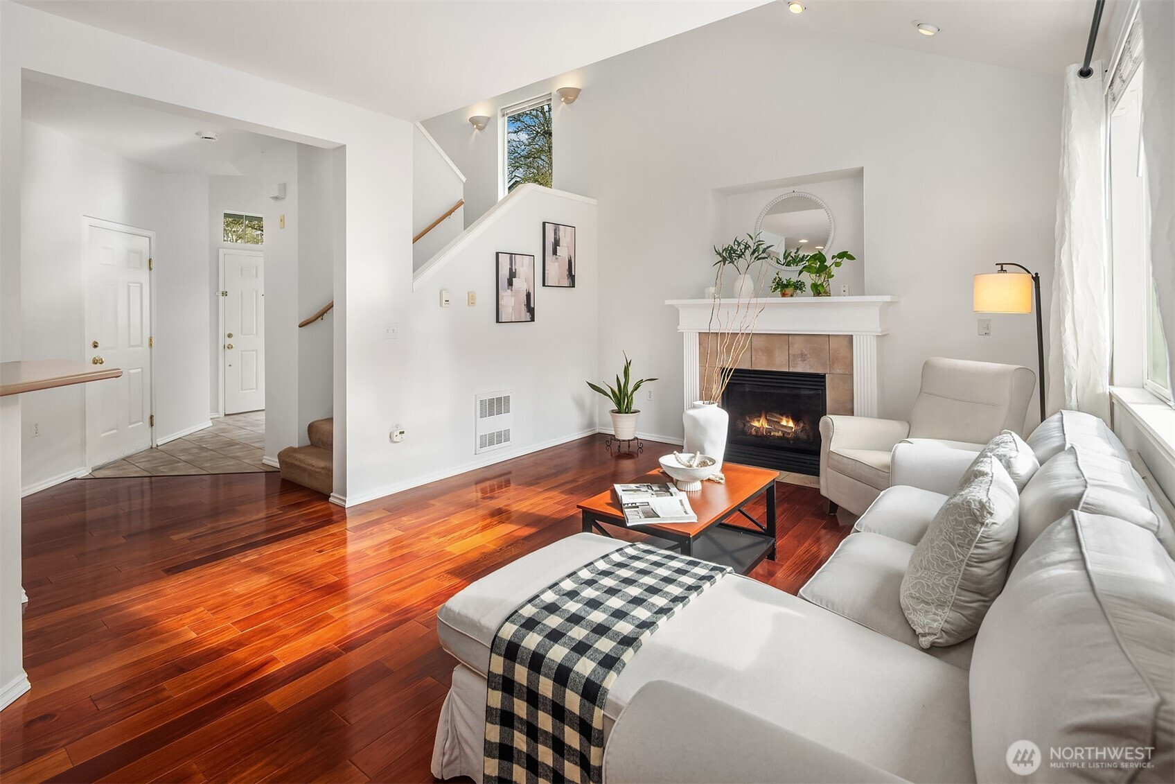 Sun-filled corner-lot townhome in the desirable gated Ashburn community. This stunning 2-story home offers an impressive sense of space and openness. The south-facing main floor features an open-concept great room with a gas fireplace and vaulted ceilings, seamlessly connecting to the dining area and sliding door to private back patio. The well-appointed kitchen showcases newer stainless steel appliances, a gas range, and abundant cabinetry. Beautiful hardwood and tile flooring extend throughout the main level. Upstairs, the spacious primary suite includes a large walk-in closet with built-in organizers and an ensuite bath with double vanities and a skylight. Two additional bedrooms, a full hallway bath, and a convenient side-by-side washer and dryer complete the upper level. Additional highlights include a two-car side-by-side garage with driveway parking, fresh interior paint (2025), and ample guest parking. Residents enjoy access to a community clubhouse offering a sport court, game room, full kitchen, and fitness center. Ideally located just minutes from the airport, UW Valley Medical Center, and major freeways. No rental cap!