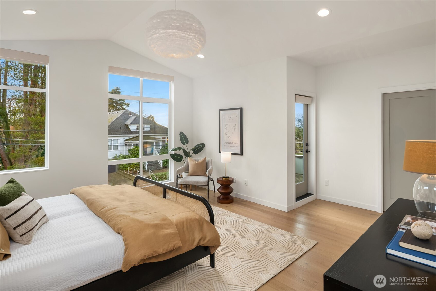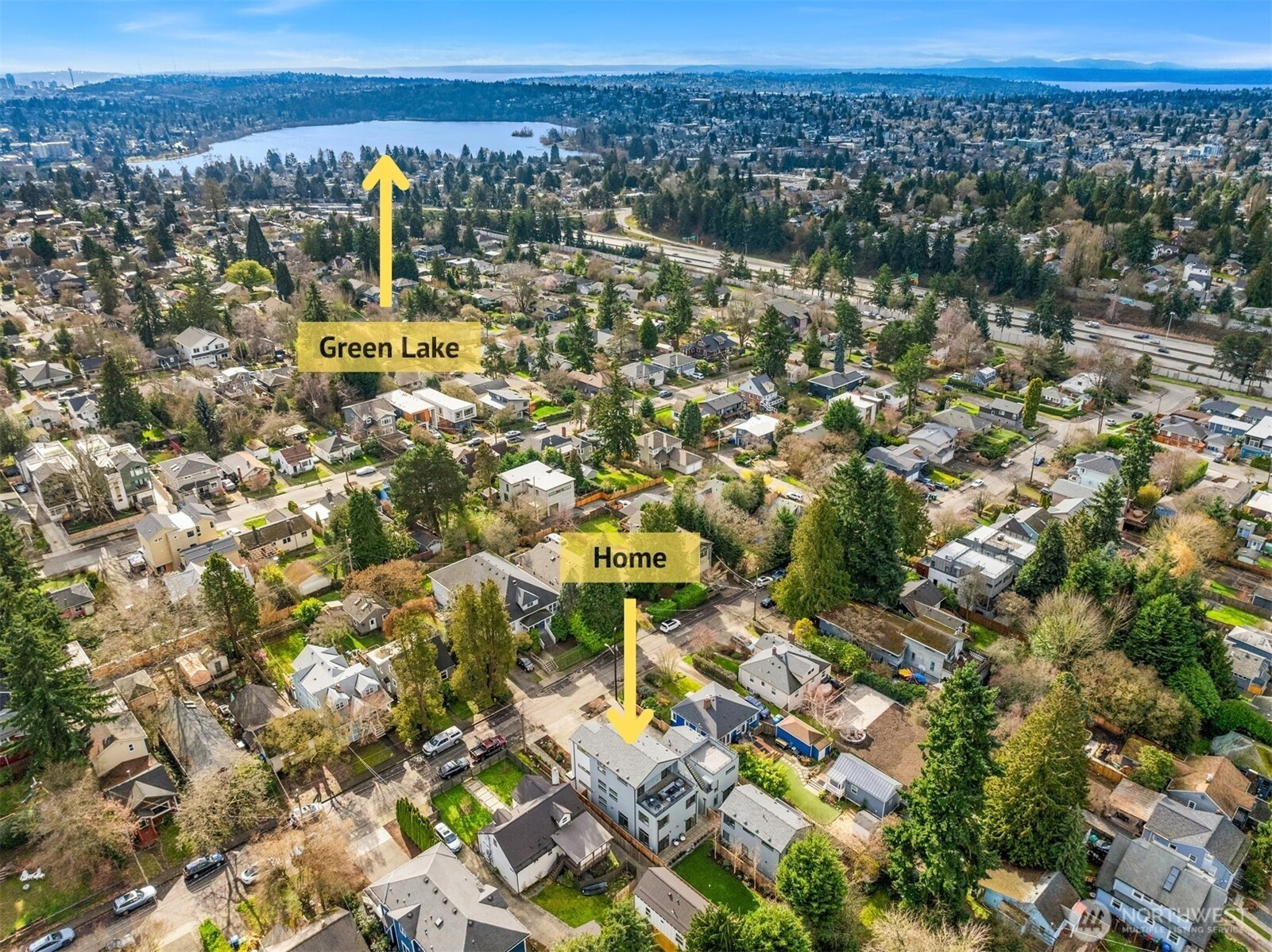 Modern North Seattle living reaches new heights in this impeccably designed 4-bedroom residence located in the idyllic Maple Leaf neighborhood. The expansive open-concept floor plan is bathed in natural light through oversized windows, featuring a gourmet chef’s kitchen equipped with Fisher & Paykel appliances and designated dining area that flows into the living room anchored by a luxurious gas fireplace. The versatile main-floor office provides the perfect footprint for a professional workspace, home gym, or creative studio. Designed for ultimate flexibility, the home offers two primary suites and the rare convenience of custom walk-in closets in every bedroom. The principal primary retreat serves as a private sanctuary with vaulted ceilings and a balcony boasting serene Olympic Mountain views. On the third floor, a versatile bonus media room opens to an elevated deck plumbed for a gas grill—perfect for hosting Pacific Northwest summer evenings. Unlike typical urban builds, this property features a rare, fully-fenced flat backyard, offering a private oasis for play or gardening. Premium modern amenities include an oversized garage with EV charging, smart home lighting, and hardwired Ethernet throughout. Join block parties, explore Maple Leaf Reservoir Park, coffee shops, and neighborhood eateries. A 3-minute drive to the Northgate Light Rail station and easy access to I-5 and Hwy 99 make this a commuter's dream location. Welcome home!