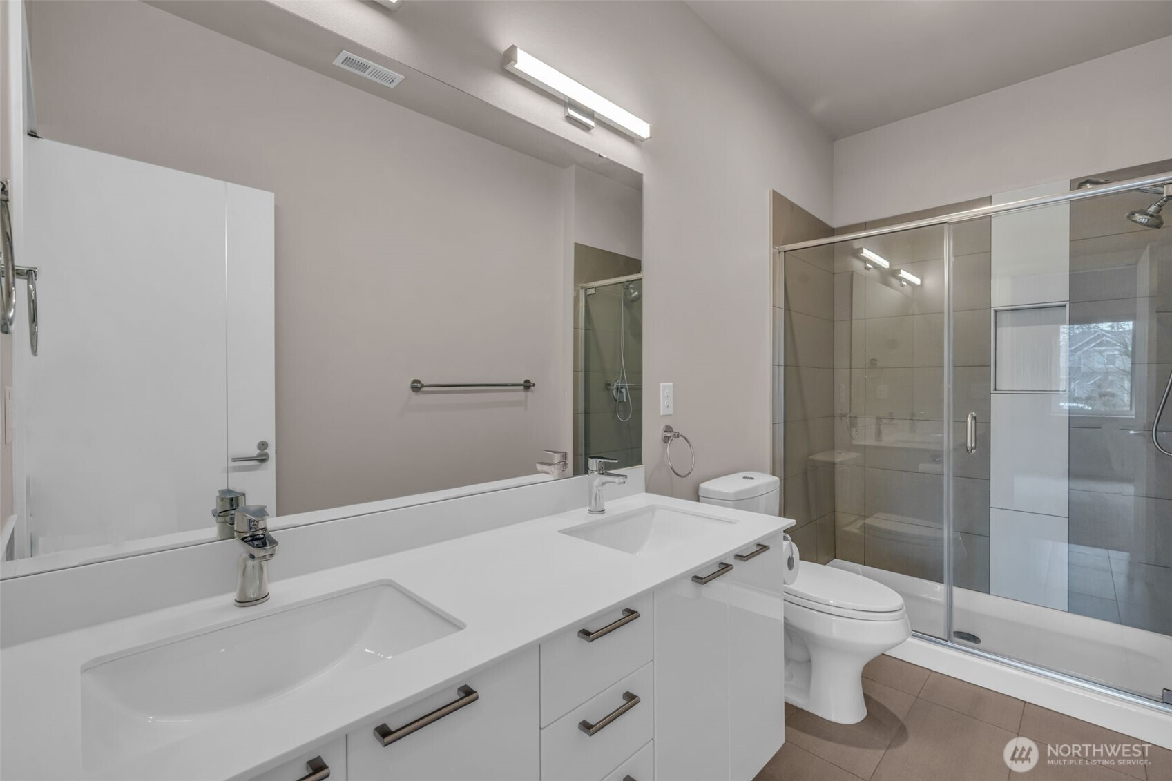 Immaculate Ichijo home and former model showcasing premium upgrades throughout! This light-filled open-concept design features soaring ceilings and expansive windows with custom top-down/bottom-up shades. The stunning kitchen offers quartz countertops, stainless steel appliances, and custom cabinet organizers for exceptional functionality. Cozy up by the gas fireplace or step outside to the patio off the dining area with gas BBQ hookup—perfect for entertaining. The main-floor primary suite provides comfort and convenience, while the deluxe powder room includes a heated seat and bidet. Smart features include Ring doorbell and Nest thermostat. Energy-efficient solar panels and a 3-zone irrigation system add long-term value. Upstairs bonus space offers a versatile flex area. Attached 2-car garage with utility sink. HOA covers landscaping and internet. Enjoy all that Ten Trails has to offer with multiple parks, trails, and sports courts just moments away!