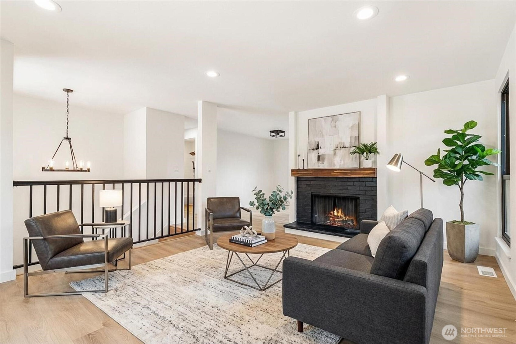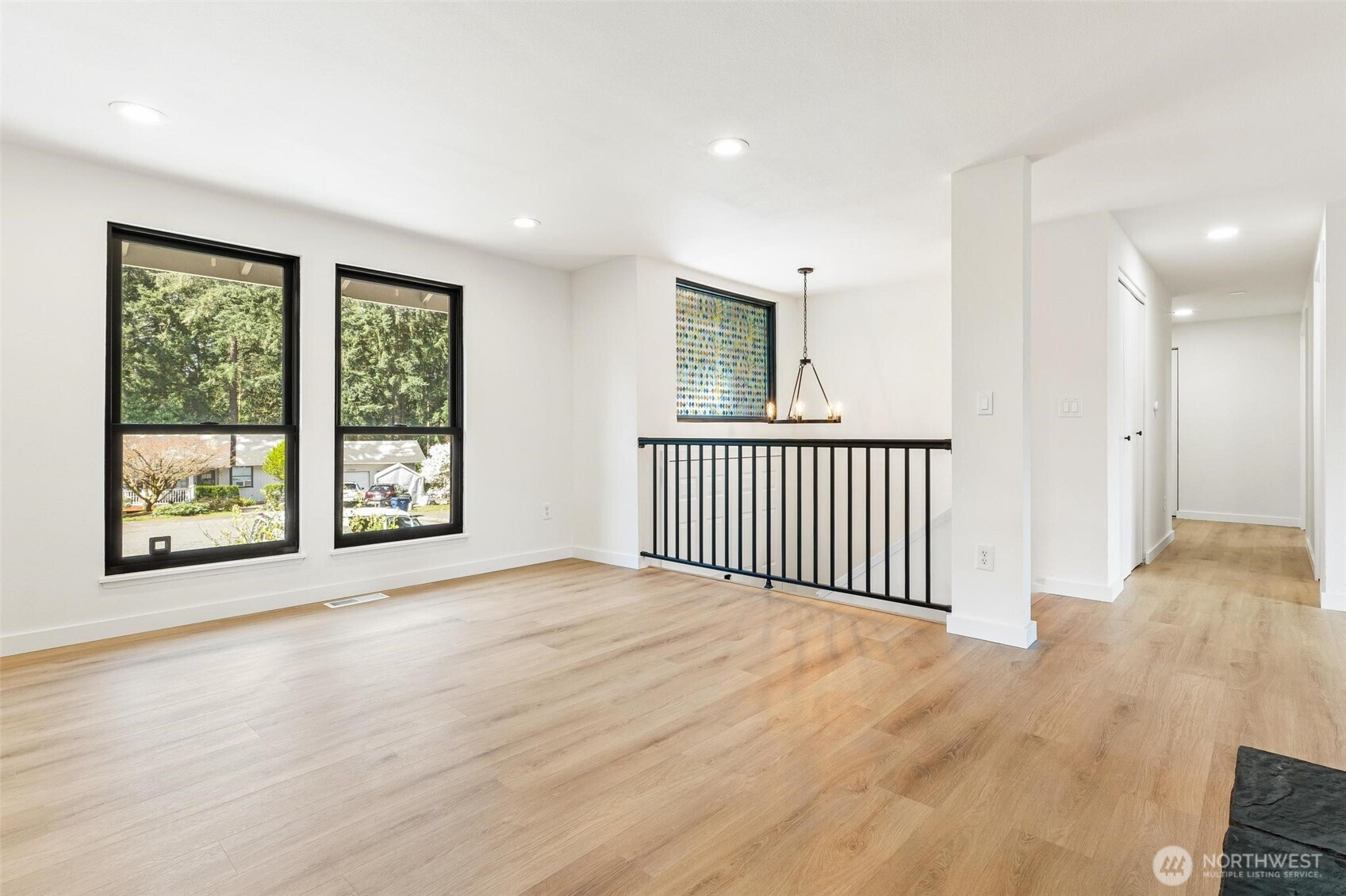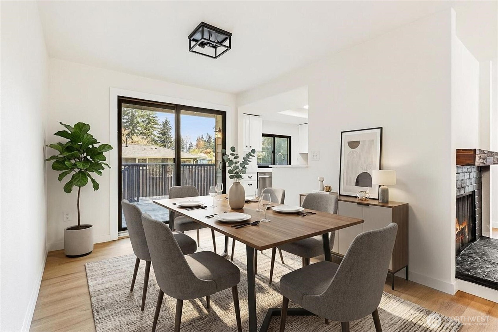 Tucked away in a quiet cul-de-sac with no through traffic, this beautifully updated home offers comfort, style, and an ideal location for commuters with easy access to Highway 18 and I-5. Filled with abundant natural light, the home features new luxury vinyl plank flooring throughout, a striking black fireplace that anchors the inviting living space, and elegant iron railing accents. The updated kitchen showcases quartz countertops and stainless steel appliances, flowing seamlessly into the dining area with direct deck access—perfect for indoor-outdoor living. The main-floor primary suite offers convenience and privacy with an en-suite bath and French doors, while the spacious lower-level bonus area with its own bathroom and backyard access provides versatile living options for guests, work, or recreation. Enjoy garden space in the backyard and a prime location near schools, shopping, dining, The Commons at Federal Way, and Twin Lakes Golf & Country Club, making this home the perfect blend of lifestyle and accessibility.