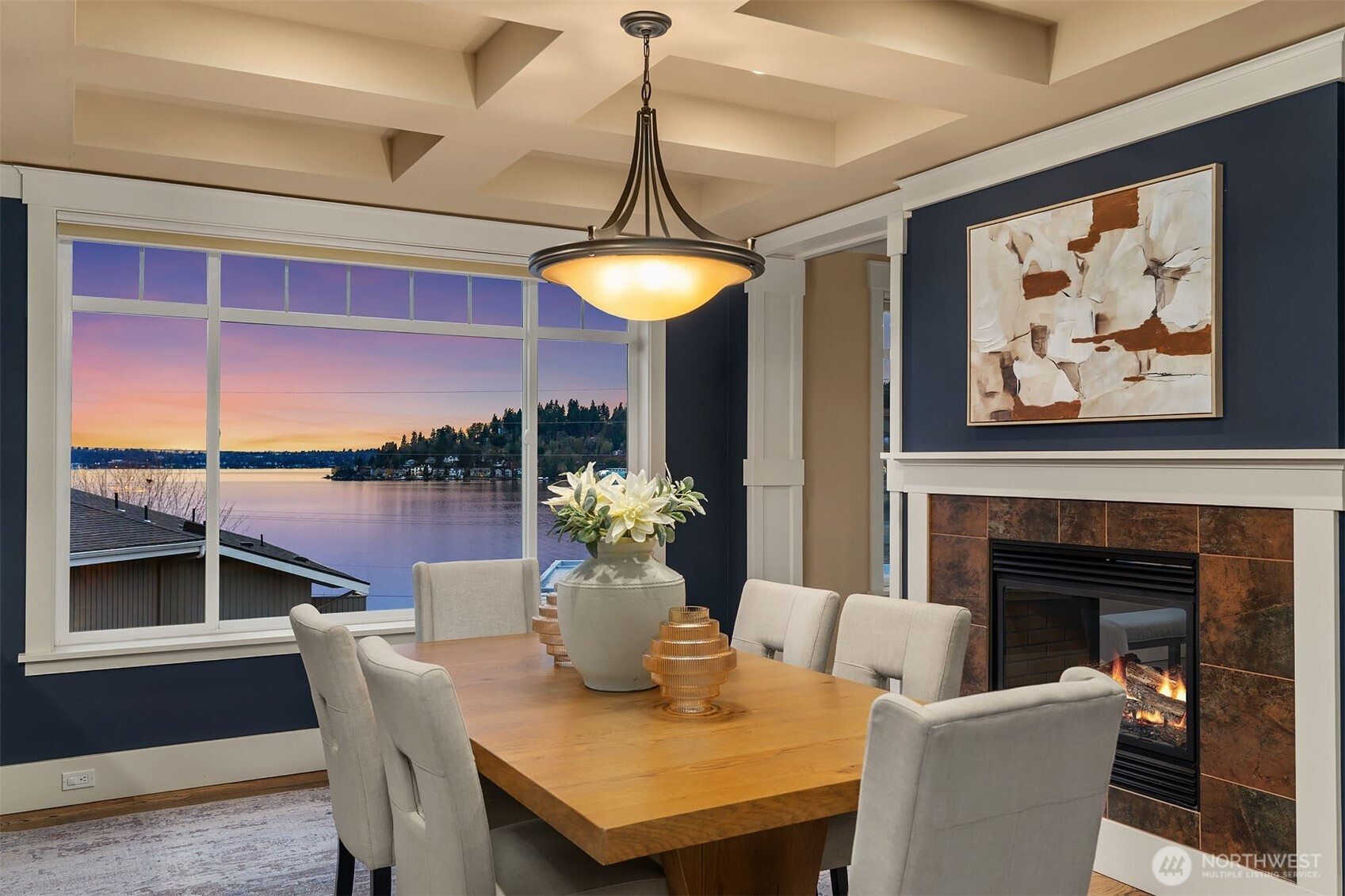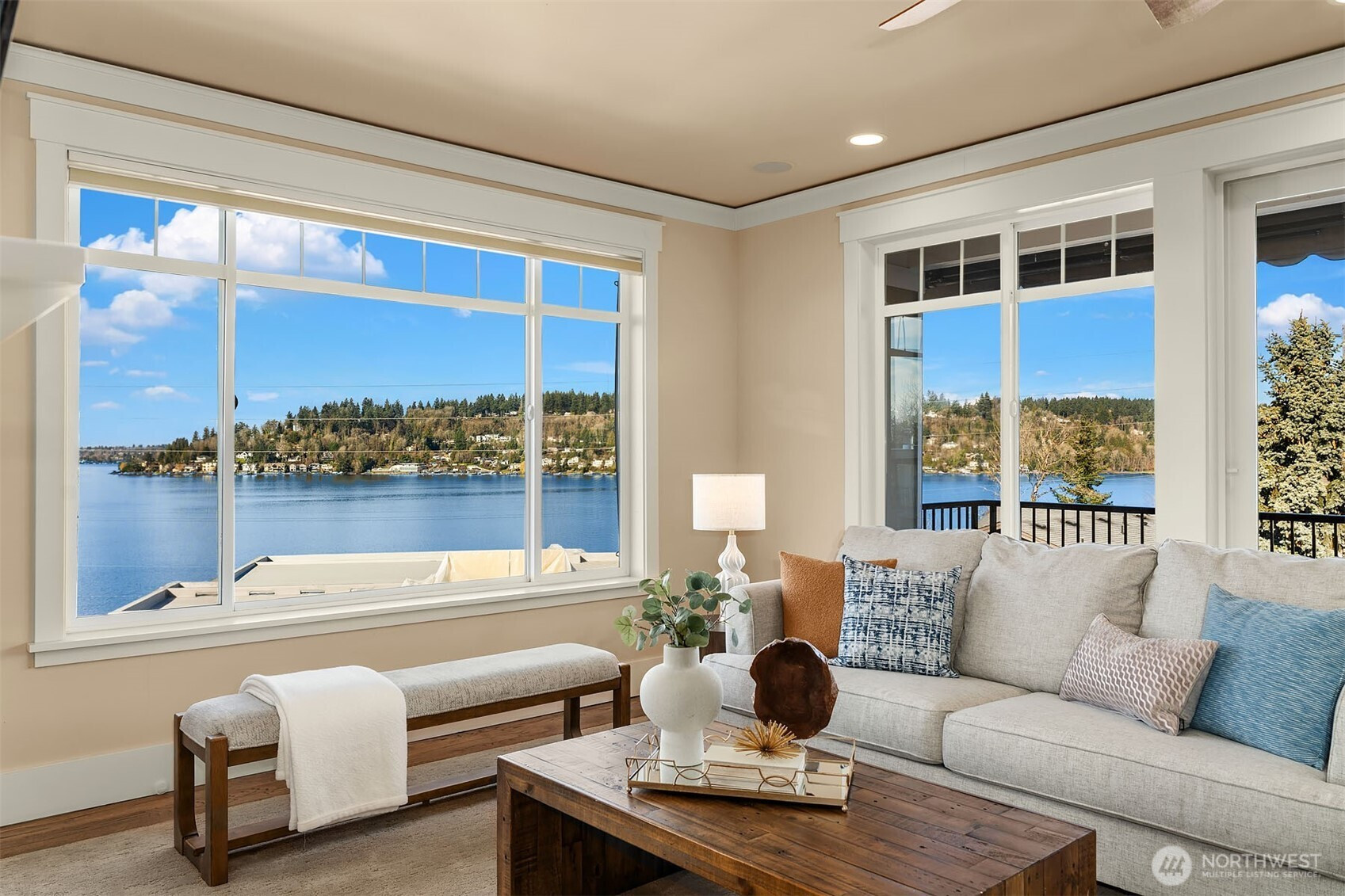 Situated in the sought-after Lower Kennydale neighborhood, this exceptional residence offers sweeping panoramic views encompassing Lake Washington, Mercer Island, and the Olympic Mountains. The home showcases refined craftsmanship and thoughtful detailing, seamlessly blending traditional and contemporary elements with a sophisticated yet inviting palette. Enjoy a tranquil and private sanctuary, free from street noise. The luxurious primary suite includes a fireplace and a secluded deck, while the office and den feature custom cabinetry. The chef’s kitchen connects to an elegant dining room that boasts a fireplace and remarkable western vistas. Outdoor dining and boat watching are available on two spacious decks. The lower level comprises a home theater and bonus room with potential for a MIL suite. Enhancing convenience, the property is equipped with a beautiful elevator. Located just minutes from Kennydale Beach Park, East Trail for walking and biking, Coulon Beach Park, SeaTac Airport, Downtown Bellevue, and Seattle, the home provides impeccable maintenance and design. It combines luxury living with rare accessibility—quick access to I-405 without freeway noise. This modern classic embodies distinguished luxury living.