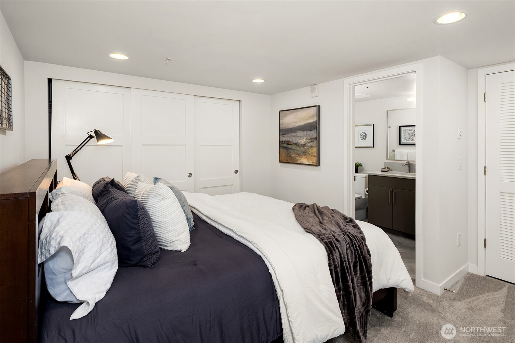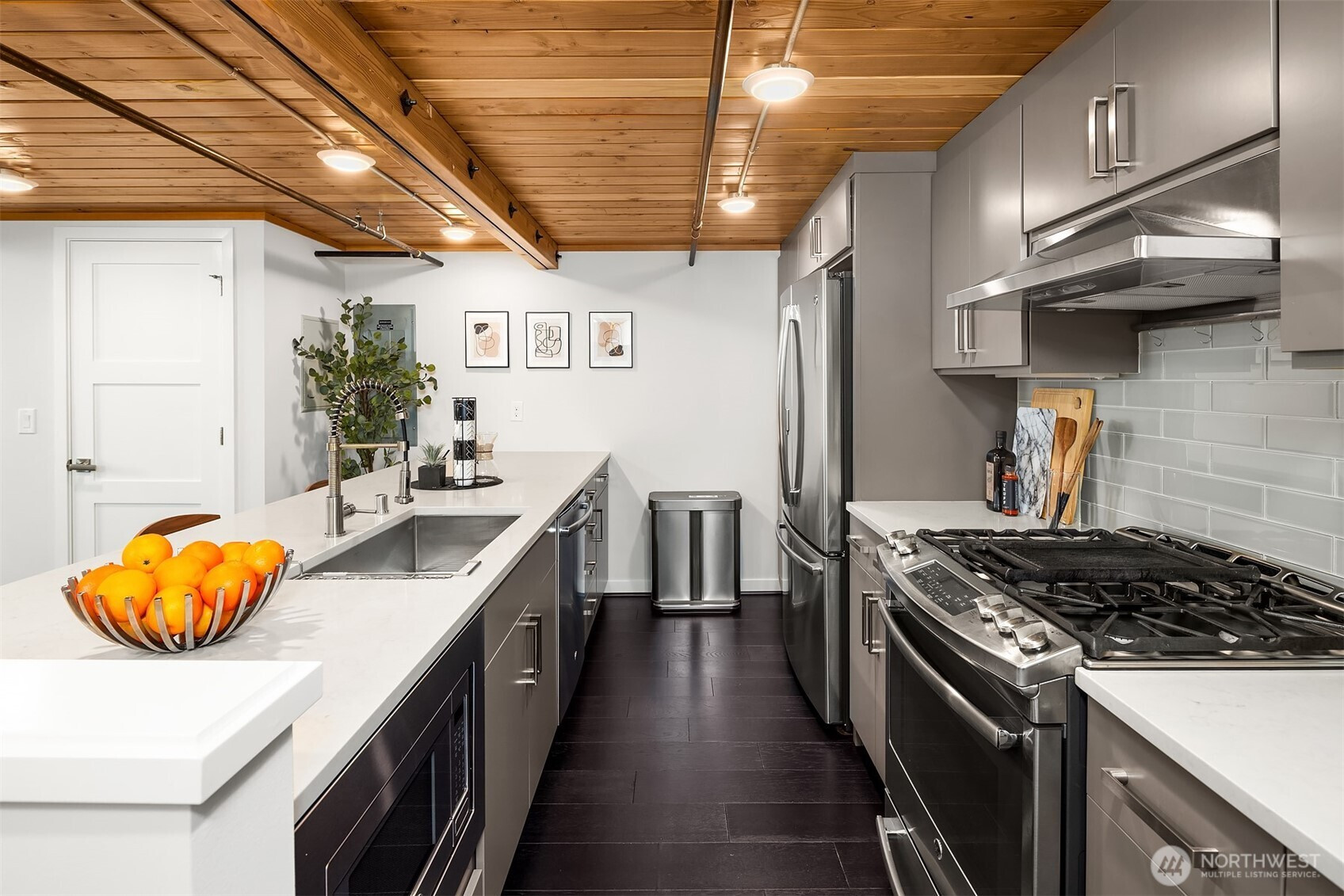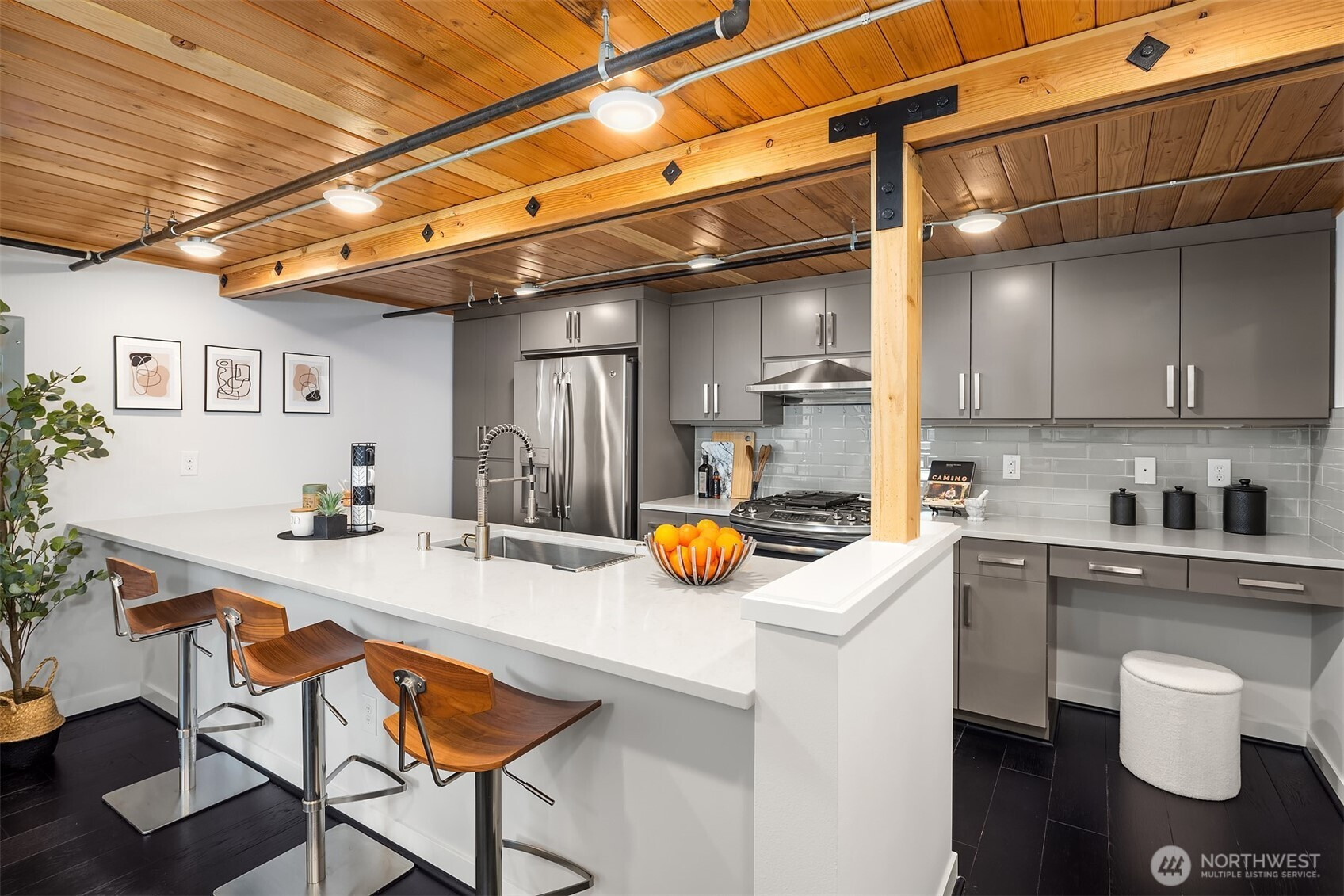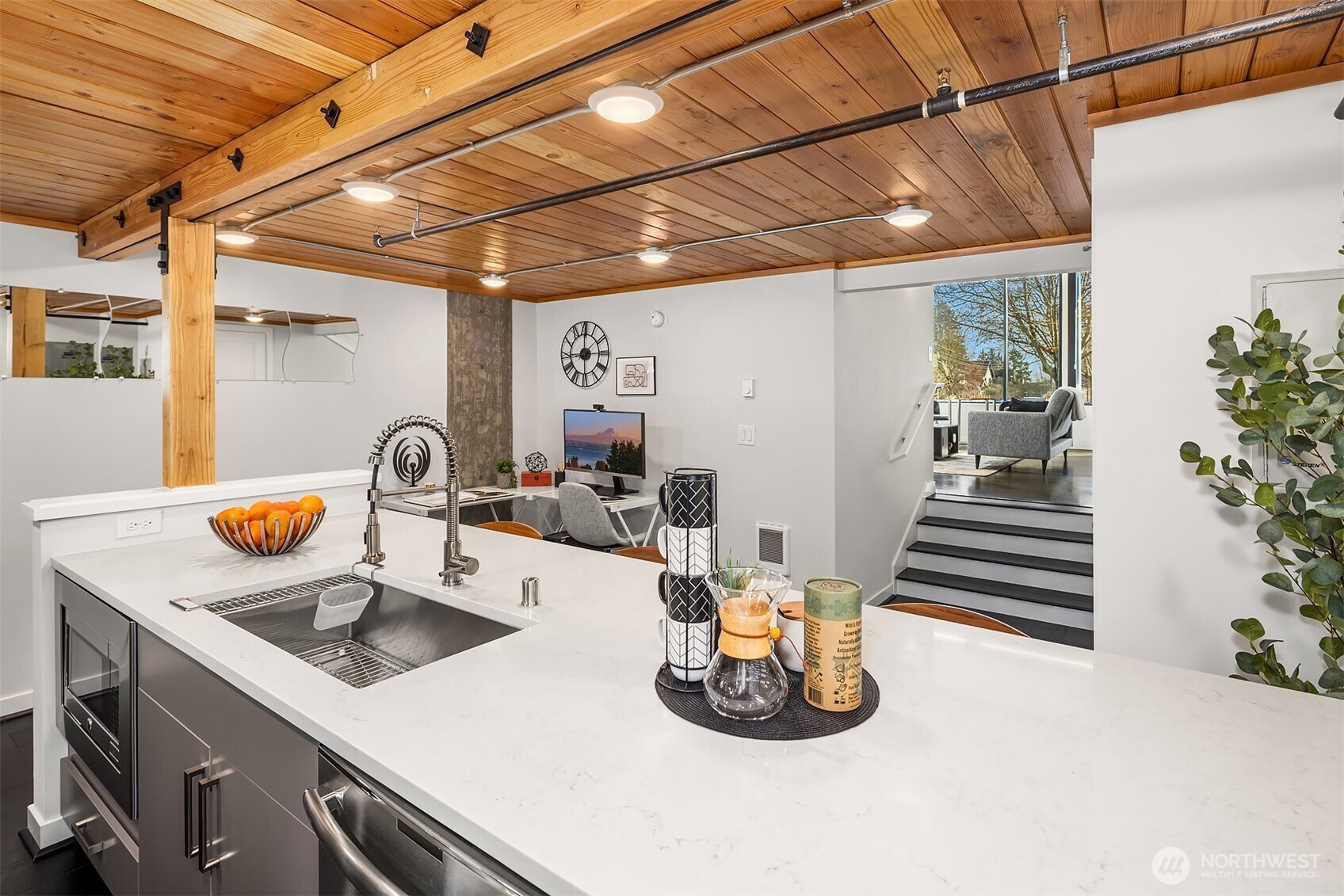 Enjoy modern living in the vibrant Ravenna community! This sleek loft offers live/work flexibility. Modern design elements include polished concrete floors, soaring ceilings and oversized windows that bask the interior with natural light. Inviting main level living space with a convenient half bath. The lower level kitchen is beautifully appointed with quartz counters, a stainless appliance package and subway tile backsplash. Flex space for office or dining. Upper level primary bedroom with ensuite bath and laundry. Secure garage parking space. Newer building with nearby transit makes commuting a breeze. Minutes to UW, Seattle Children's Hospital and shops and dining at University Village. Pre-inspected, turn-key condition. Welcome home!