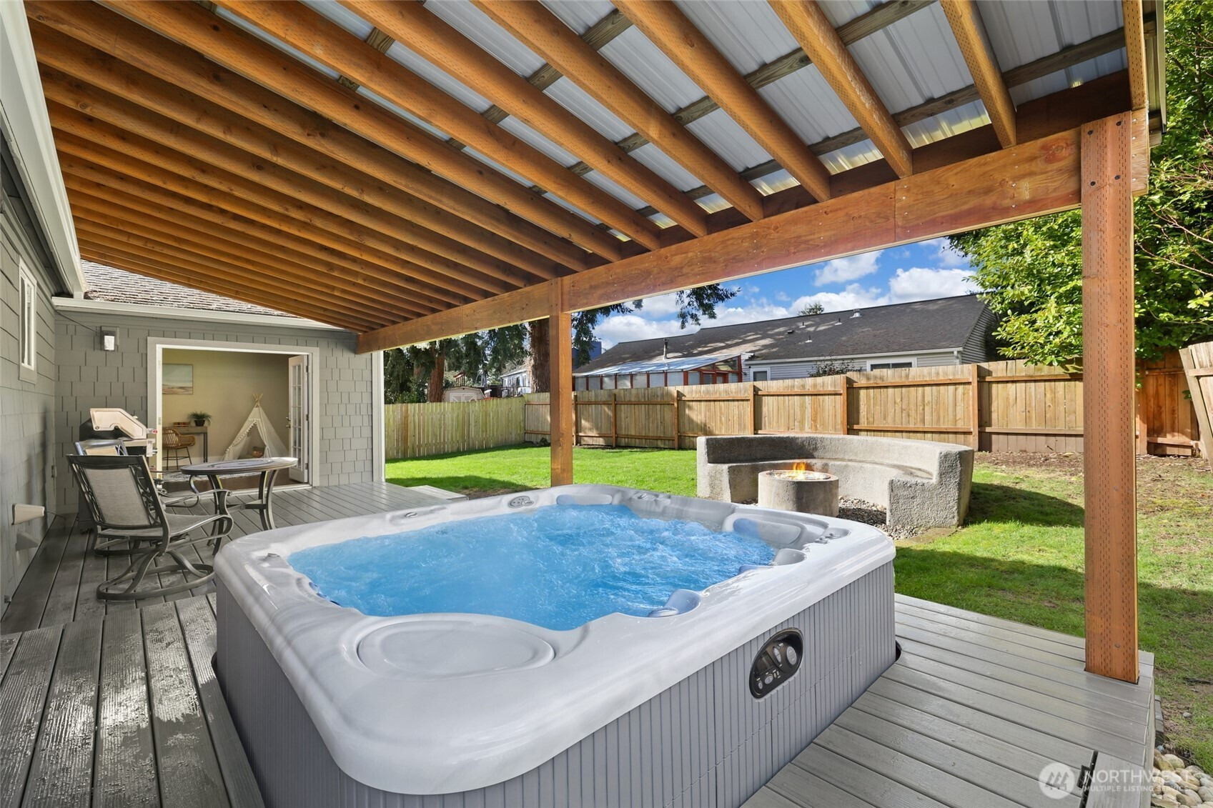 This beautifully updated rambler offers exceptional curb appeal and a warm, welcoming presence from the moment you arrive. Completely refreshed with new paint inside and out, this move-in ready home features an open-concept layout with vaulted ceilings and a cozy fireplace that anchors the main living area. Enjoy two spacious living areas, perfect for entertaining or relaxing, and a thoughtfully designed kitchen that includes all appliances. The generous laundry room adds everyday convenience, while three comfortable bedrooms provide space for everyone—including a private primary suite with an attached bathroom. Off the primary bedroom, step outside to an entertainer's dream backyard showcasing a new Trex deck, covered hot tub area, fire pit with built-in seating, and a fully fenced, flat yard ideal for gatherings. With RV parking, an attached garage, and meticulous care throughout, this home truly has it all. Conveniently located near shopping, local coffee spots, and the natural beauty of Dash Point State Park, you'll enjoy both comfort and lifestyle in one exceptional property. Mortgage savings may be available for buyers of this listing.