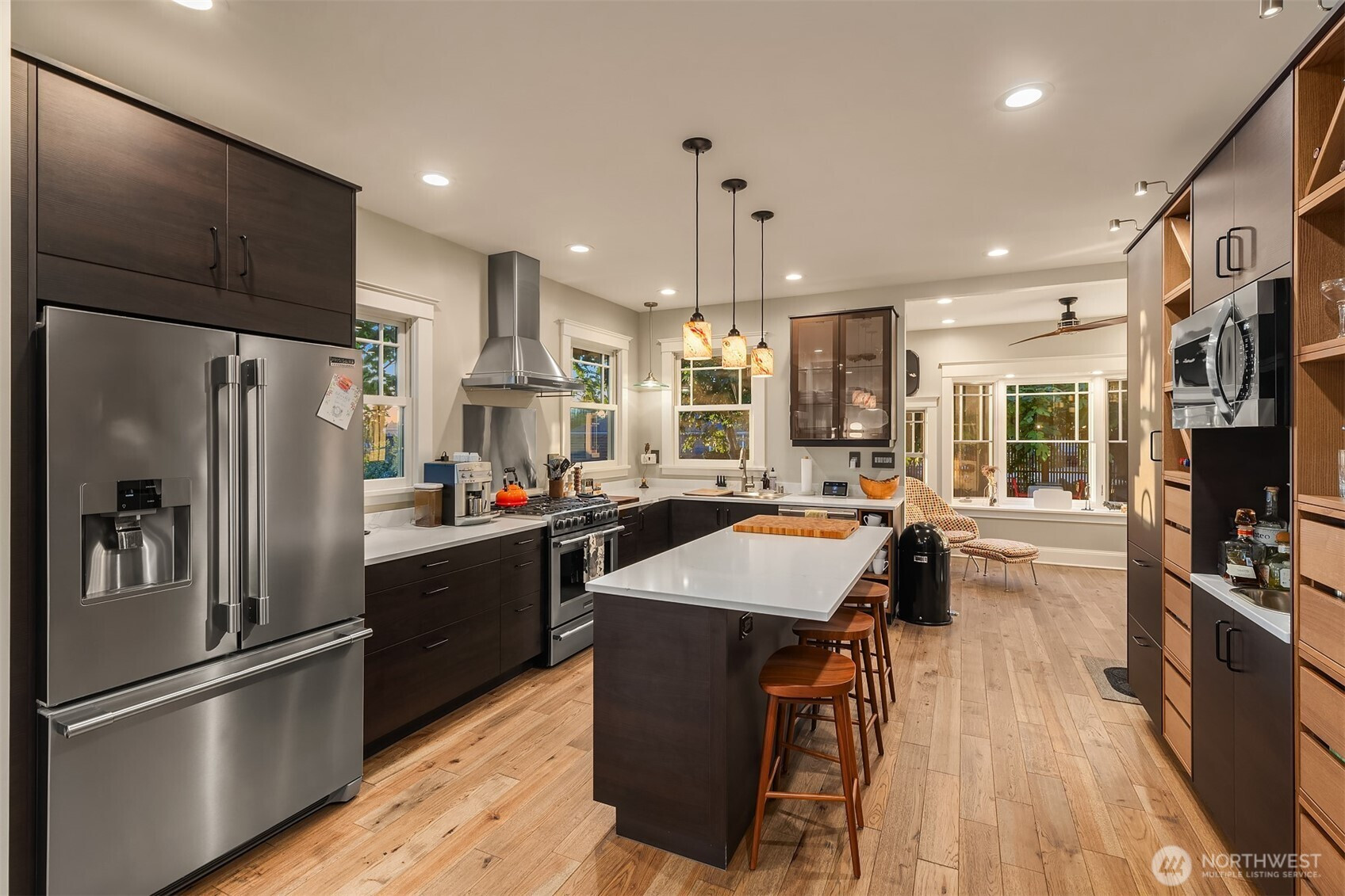 Located on a quiet street in Phinney Ridge, this fully renovated Craftsman offers Olympic Mountain views and a flexible layout designed for modern living. A covered front porch leads into a light-filled open floor plan with bay windows, ¾-inch hickory hardwood floors, and quartz countertops throughout. The kitchen features a professional-series gas range, new refrigerator, sink, and microwave, along with an open butler’s pantry for added storage and functionality. The main level includes two bedrooms and a well-appointed bathroom with vaulted ceilings, skylight, and a freestanding bath with shower. The true "wow" factor lies in the property’s versatility. The lower level is a fully self-contained guest suite with its own kitchen and exterior entrance-perfect for an Airbnb, multi-generational living, or an au pair. Add in the detached, private studio for the ultimate "commute-free" workday and a fully fenced backyard for weekend hosting. Located steps from the best coffee, dining, and parks in 98107, this is a rare opportunity to own a turnkey home that works as hard as you do.