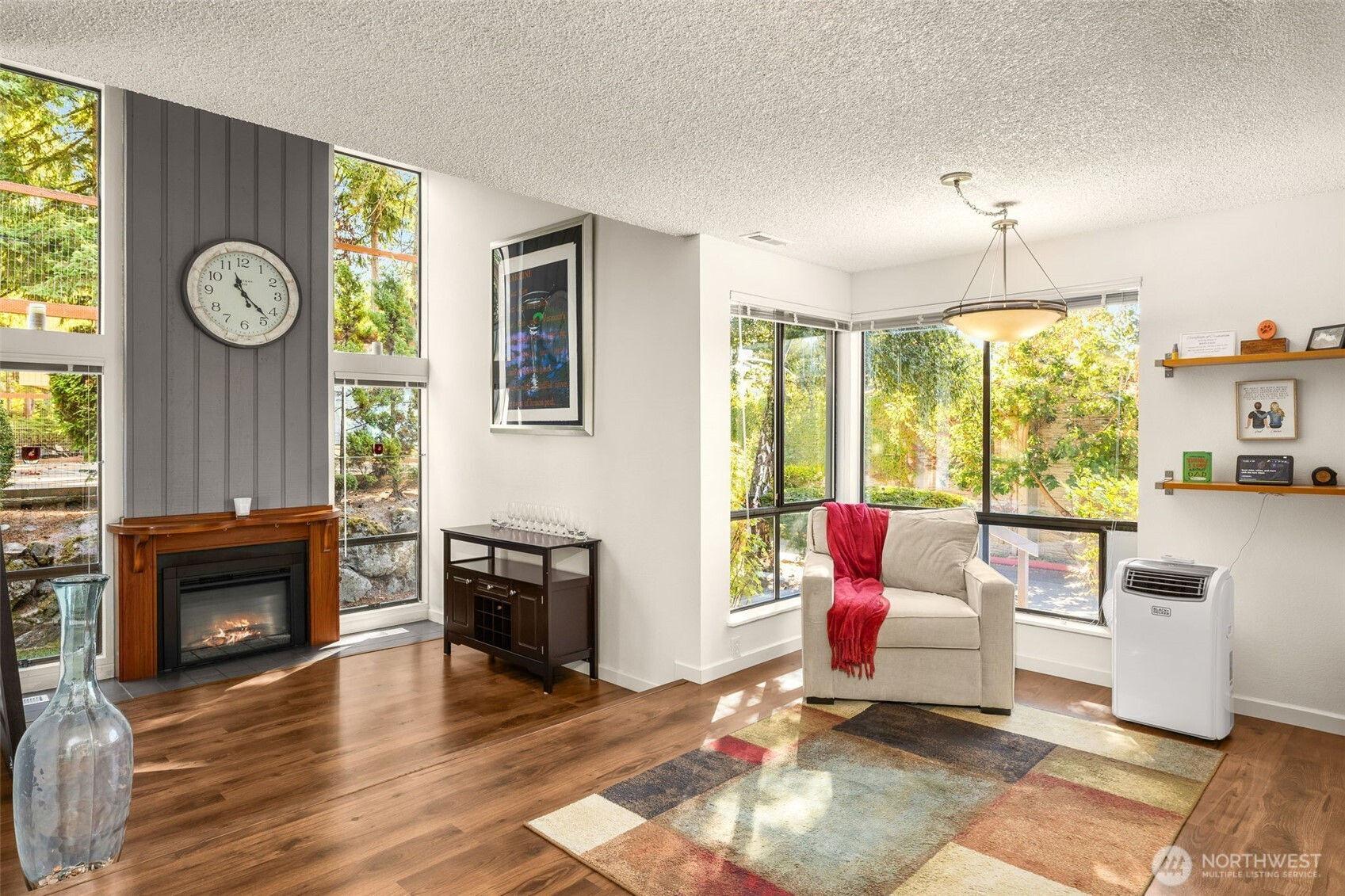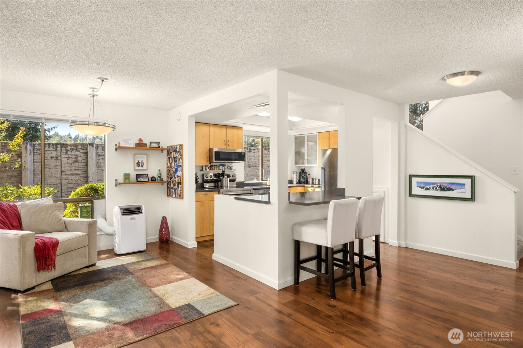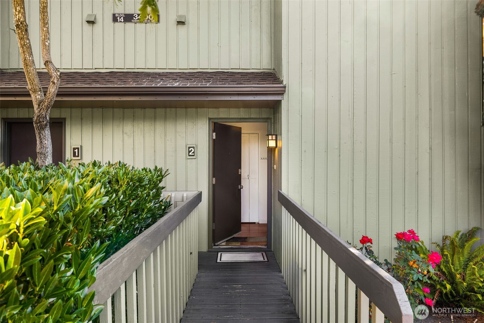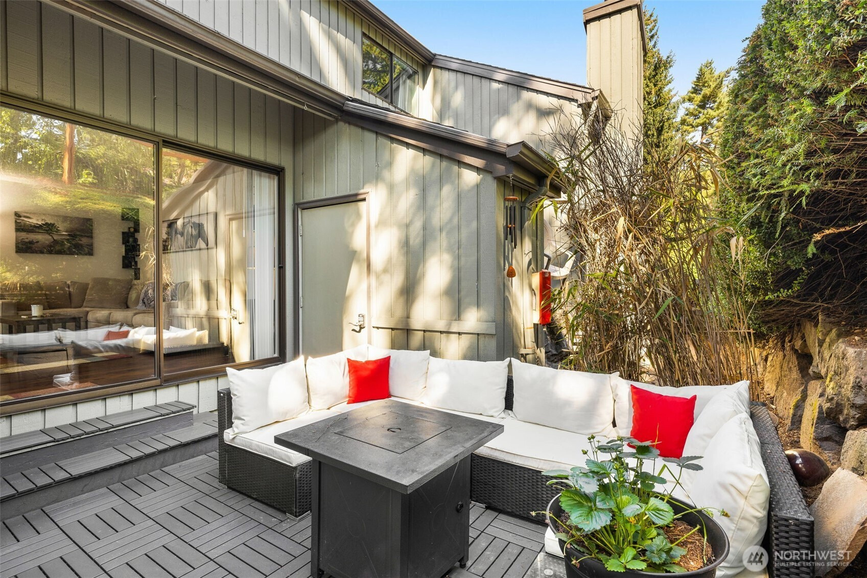 Beautiful NW Contemporary townhouse end unit in Yarrowood! Prime location near Seattle, DT Bellevue, Redmond & Kirkland. Vaulted ceilings and large windows offer tons of natural light and views of mature landscaping. The great room features hardwood floors, a wood-burning fireplace and an open floor plan that leads to a beautiful private patio—perfect for enjoying PNW evenings. Upstairs offers 2 bedrooms, full bath, and a laundry room. Just steps from the pool, tennis court & clubhouse. Includes 2 parking spaces, extra storage, and no rental cap!