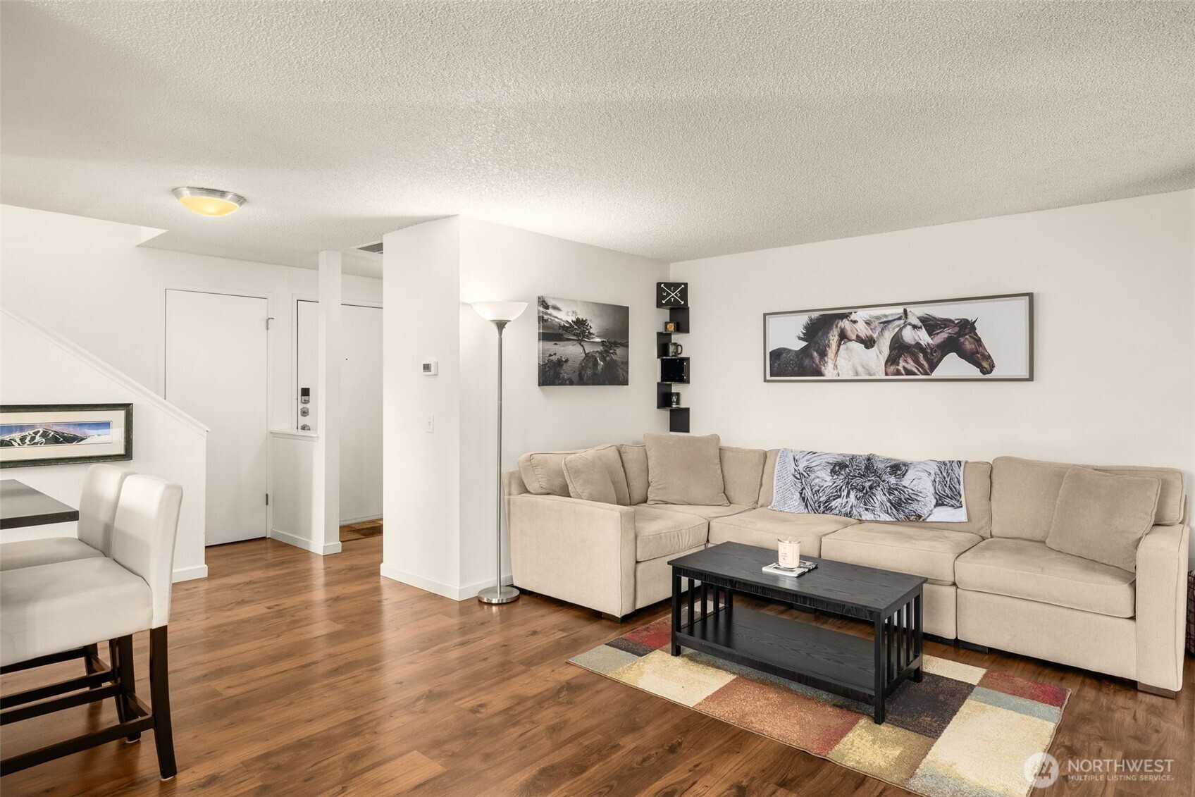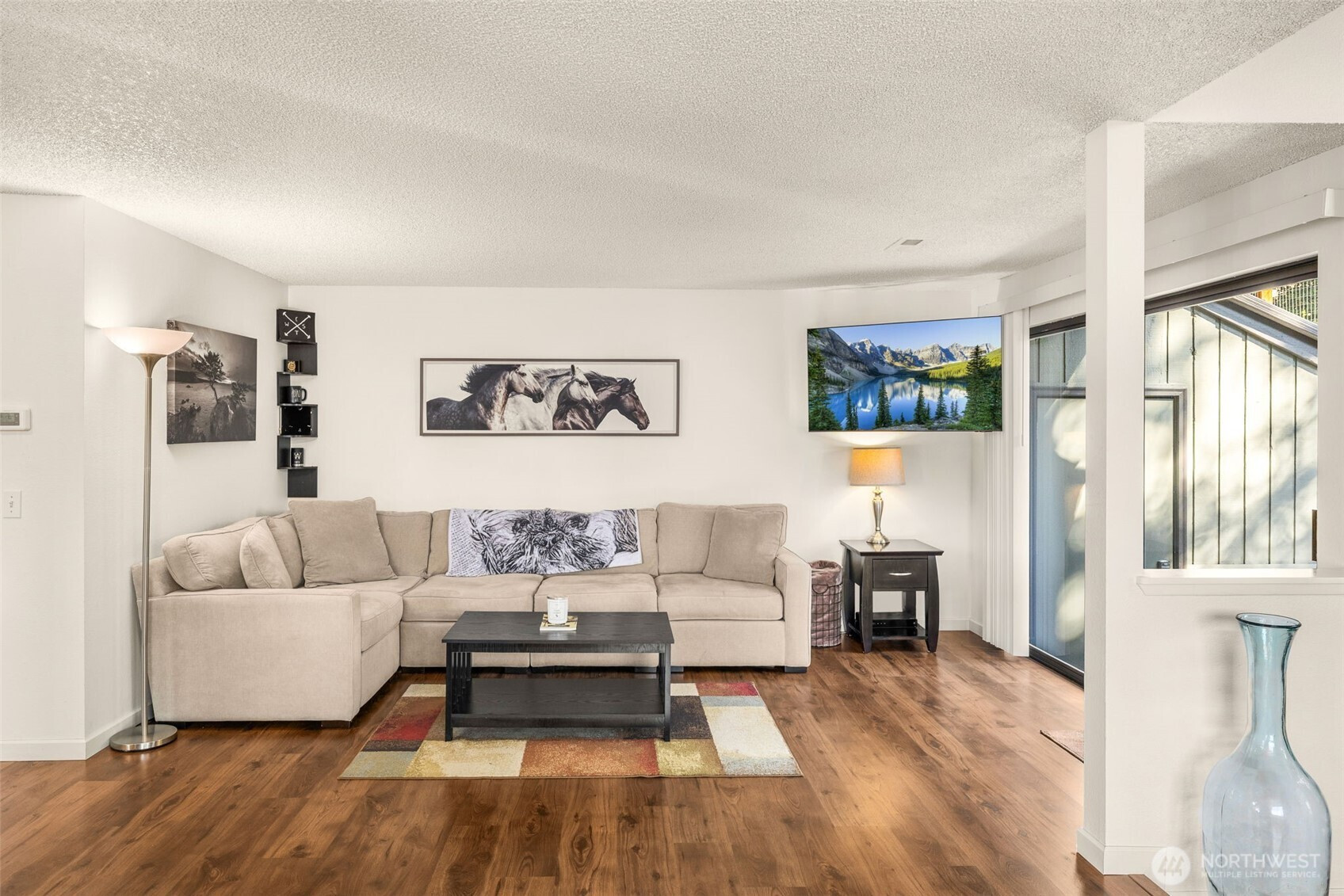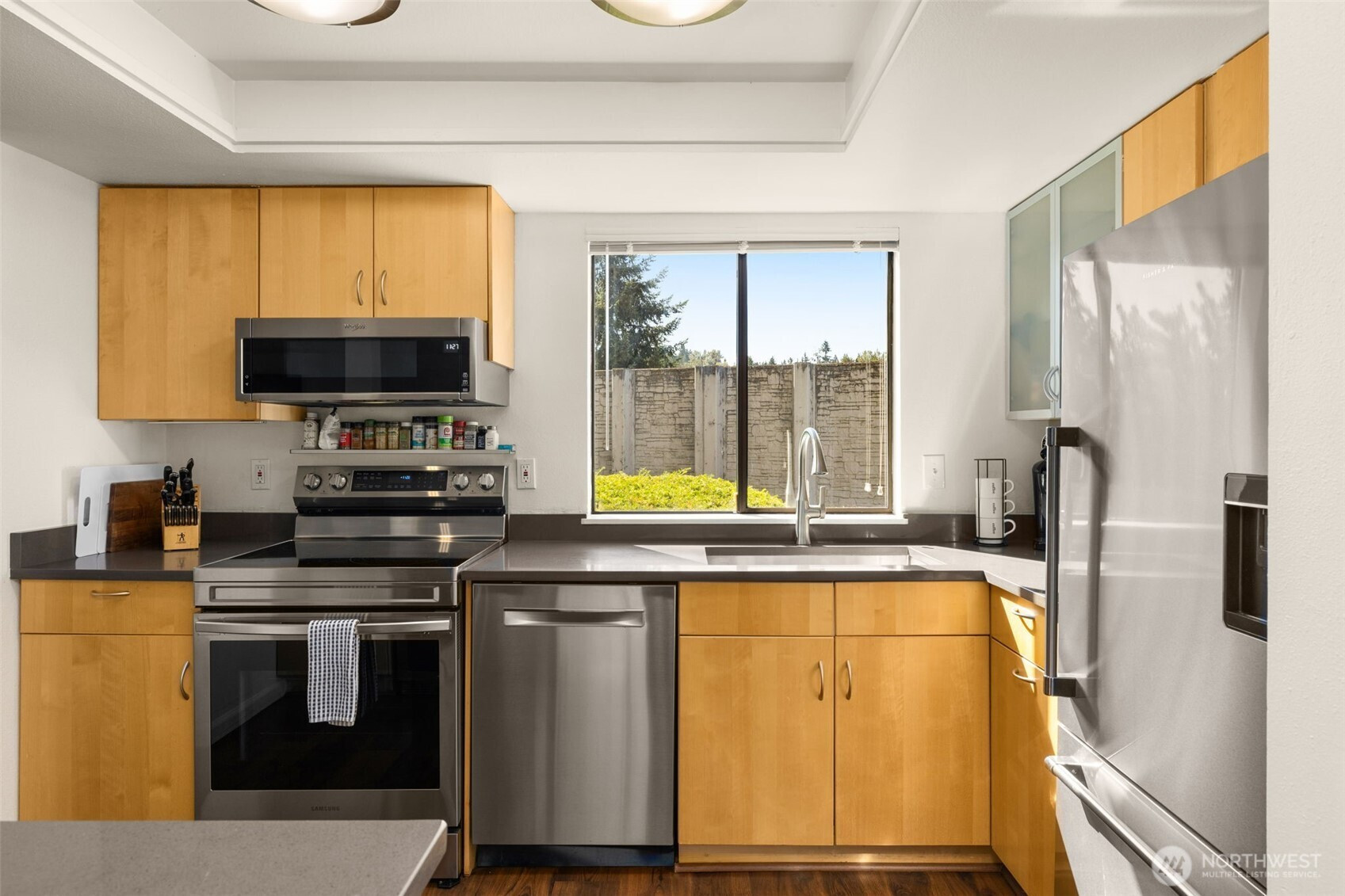 Beautiful NW Contemporary townhouse end unit in Yarrowood! Prime location near Seattle, DT Bellevue, Redmond & Kirkland. Vaulted ceilings and large windows offer tons of natural light and views of mature landscaping. The great room features hardwood floors, a wood-burning fireplace and an open floor plan that leads to a beautiful private patio—perfect for enjoying PNW evenings. Upstairs offers 2 bedrooms, full bath, and a laundry room. Just steps from the pool, tennis court & clubhouse. Includes 2 parking spaces, extra storage, and no rental cap!