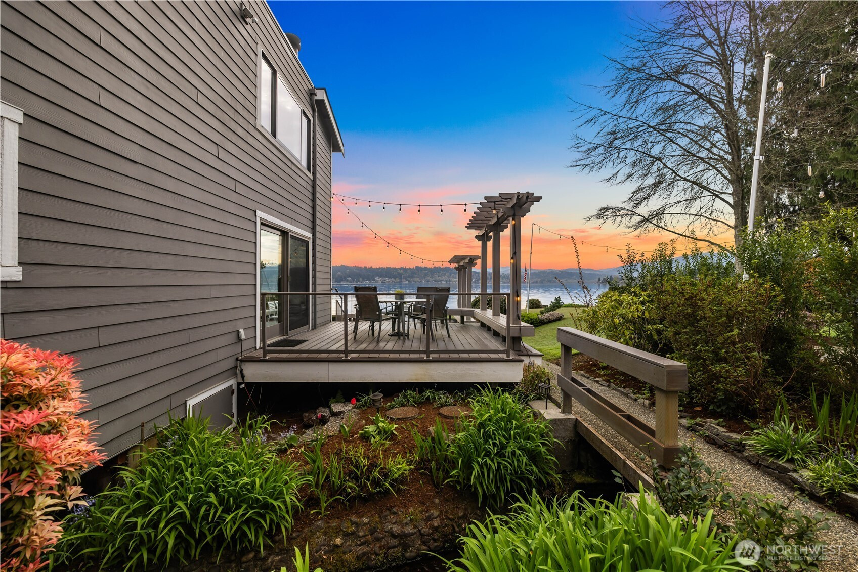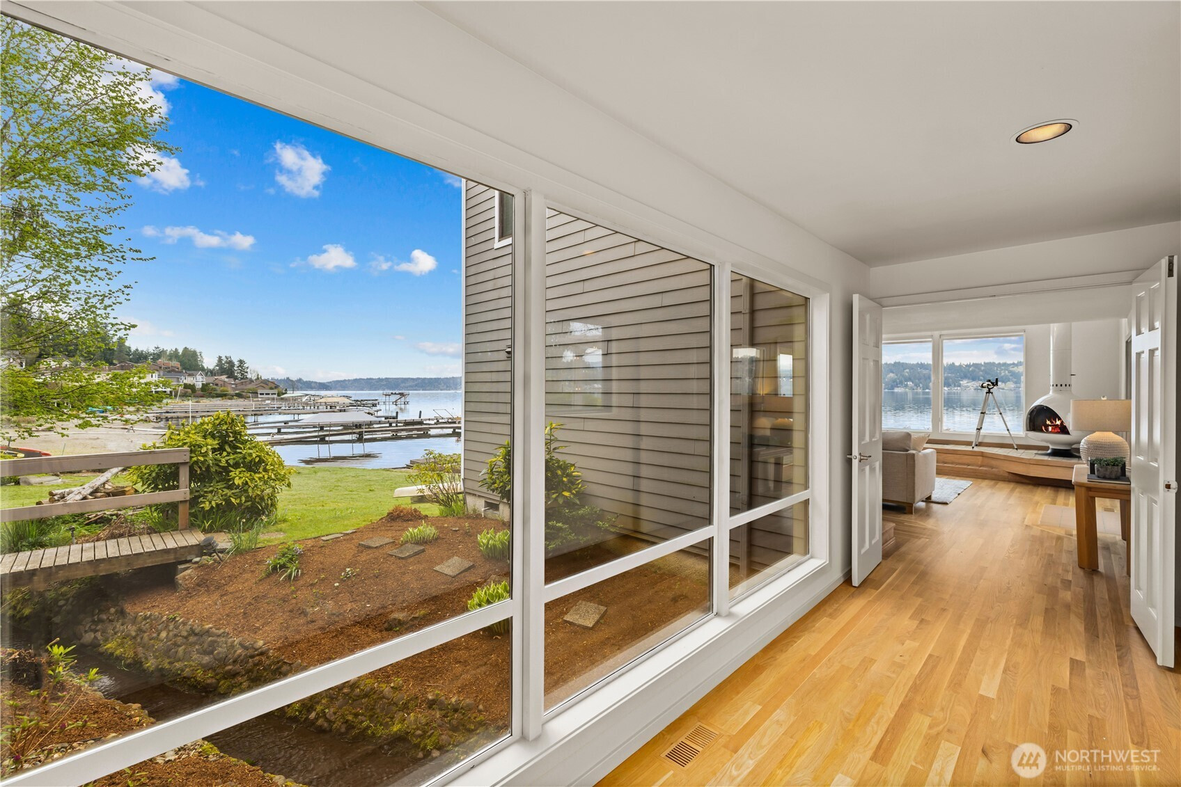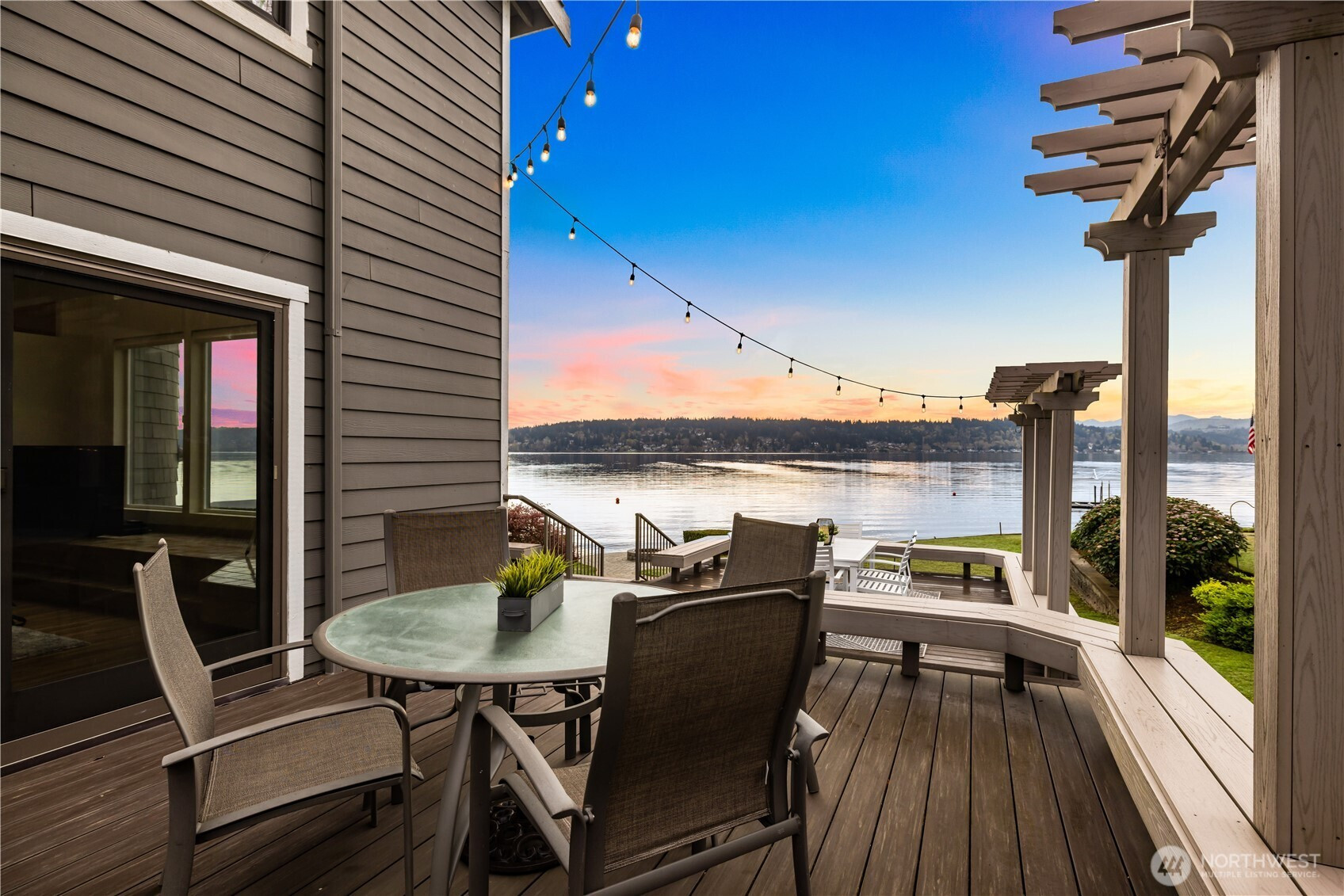Perfectly positioned on a shy half acre stretch of West Lake Sammamish shoreline, this serene estate offers an elevated waterfront lifestyle with 75 feet of shoreline, sweeping eastern views, and a closer-to-water setting that can no longer be replicated. Begin on the expansive deck beneath a pergola strung with soft lighting, where mornings start with sunrise reflections across the lake and evenings unfold around the dining table overlooking the water. The lawn extends gently to the shoreline, with a stone firepit creating a natural gathering place, while a stream winds through the property, adding a gentle rhythm to the grounds. Inside, soaring ceilings and walls of windows frame the lake, filling the main living room with light and reflecting across new oak hardwoods. The kitchen, appointed with high-end JennAir appliances, connects seamlessly to dining and gathering spaces. The primary suite extends the lake experience, with views to the water and a spacious en-suite bath with jetted spa for unwinding at day's end. With 4 bedrooms, two kitchens, and dual living spaces, the home offers flexibility without compromising comfort. A secondary living area with panoramic views and a sleek fireplace rounds out a residence that lives as beautifully as its setting suggests. Minutes from downtown Bellevue and Issaquah, with easy access to I-90 and WA-520, offering the tranquility of waterfront living without sacrificing connection to the Eastside's best dining, shopping, & trails.