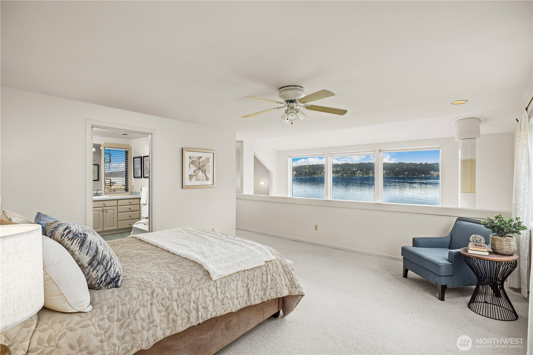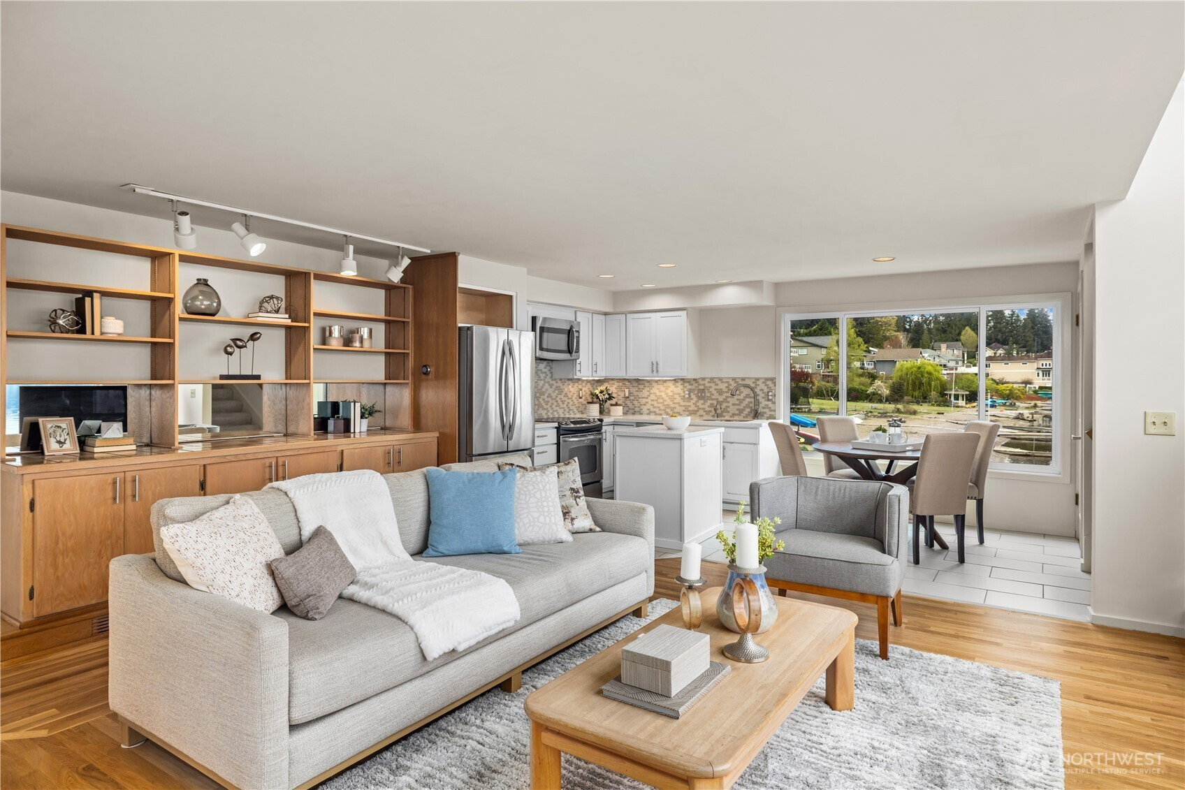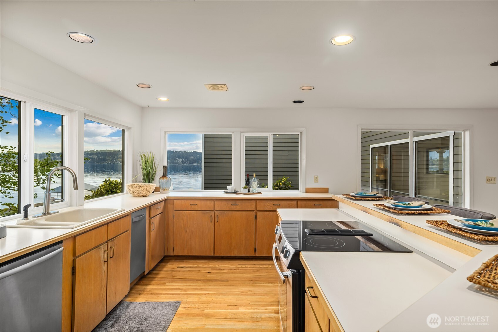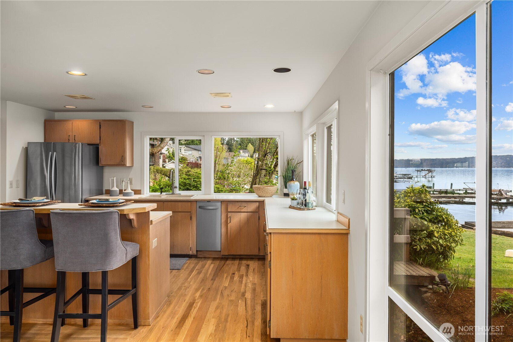 Perfectly positioned on a shy half acre stretch of West Lake Sammamish shoreline, this serene estate offers an elevated waterfront lifestyle with 75 feet of shoreline, sweeping eastern views, and a closer-to-water setting that can no longer be replicated. Begin on the expansive deck beneath a pergola strung with soft lighting, where mornings start with sunrise reflections across the lake and evenings unfold around the dining table overlooking the water. The lawn extends gently to the shoreline, with a stone firepit creating a natural gathering place, while a stream winds through the property, adding a gentle rhythm to the grounds. Inside, soaring ceilings and walls of windows frame the lake, filling the main living room with light and reflecting across new oak hardwoods. The kitchen, appointed with high-end JennAir appliances, connects seamlessly to dining and gathering spaces. The primary suite extends the lake experience, with views to the water and a spacious en-suite bath with jetted spa for unwinding at day's end. With 4 bedrooms, two kitchens, and dual living spaces, the home offers flexibility without compromising comfort. A secondary living area with panoramic views and a sleek fireplace rounds out a residence that lives as beautifully as its setting suggests. Minutes from downtown Bellevue and Issaquah, with easy access to I-90 and WA-520, offering the tranquility of waterfront living without sacrificing connection to the Eastside's best dining, shopping, & trails.