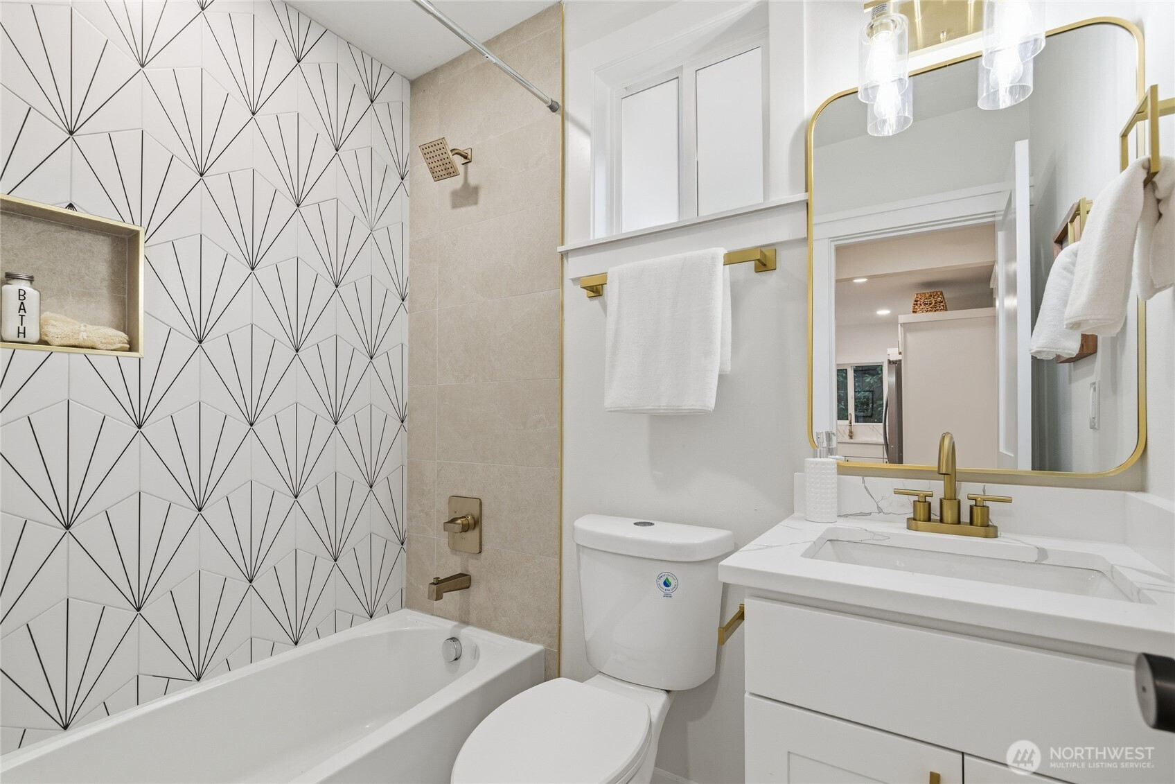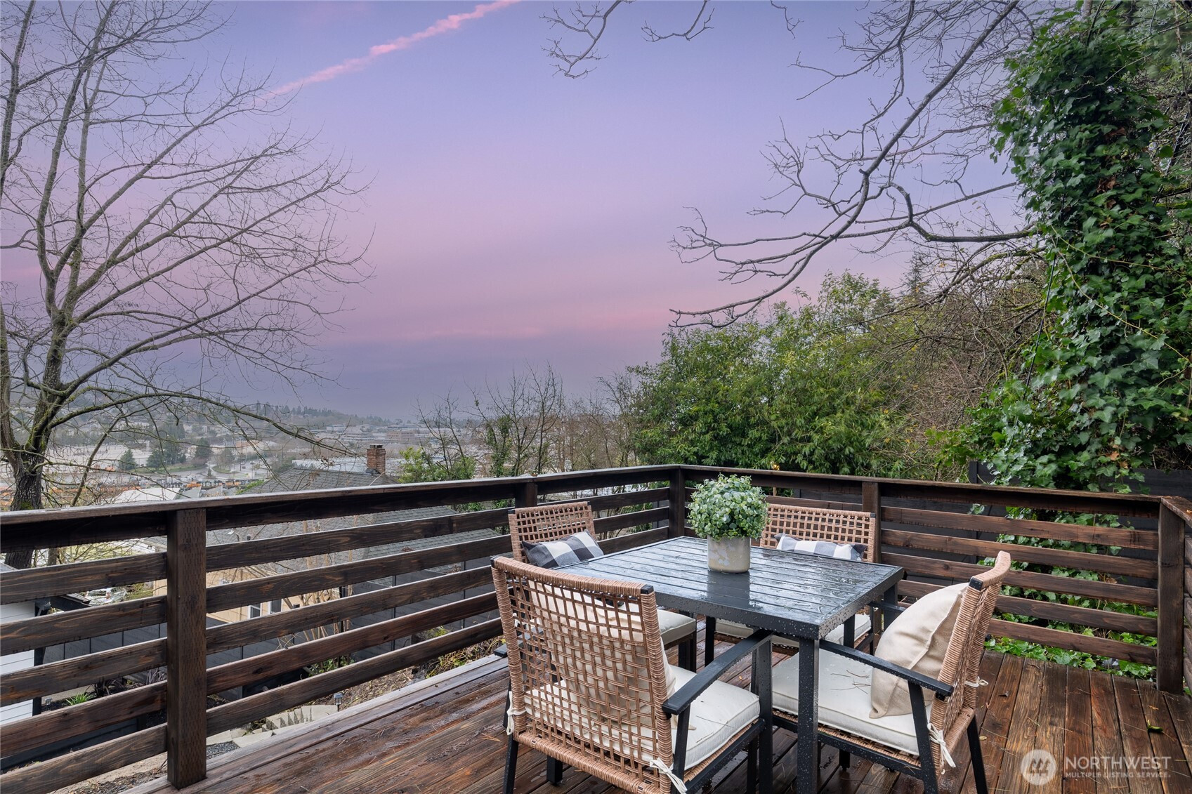 Come home to this fabulously located and tastefully renovated Queen Anne home with a westerly view of Salmon Bay and Fisherman's Terminal. Large windows allow warm afternoon sunlight to flood into the living and dining areas while the spacious kitchen presents sparkling quartz counter tops and new stainless steel appliances. The primary en suite bedroom with its generous walk-in closet and large shower is designed for comfort and conveniently located on the main floor. The adjacent bedroom could just as easily serve as a home office, offering the shortest of commutes. Two additional bedrooms downstairs make having company an easy and private affair. Venture up the back stairs for an evening conversation by the fire pit or on the deck.