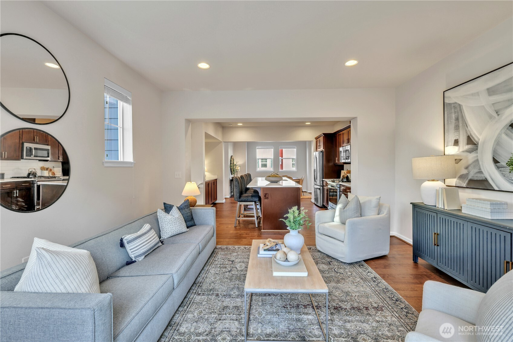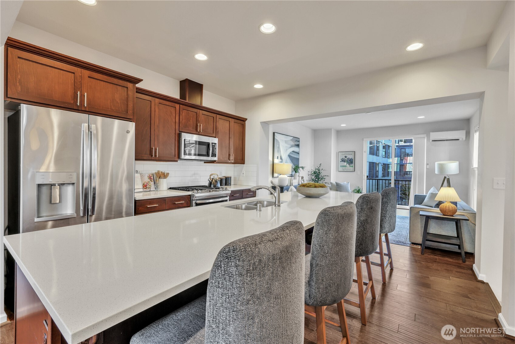Located in a vibrant part of West Seattle with quick access to Downtown, this thoughtfully designed 3 bedroom, 3.5 bath end-unit home blends comfort, efficiency, and modern style. A covered front porch welcomes you inside, natural light fills the open living room and flows seamlessly into the spacious kitchen. The kitchen features stainless steel appliances, a large island, and ample cabinetry. The primary bedroom is filled with natural light and includes an en-suite bathroom with a dual vanity. An additional upper-level space offers versatility for a home office or den. Mini-split heating and cooling provide year-round comfort, while energy-efficient features add lasting value. Enjoy a fenced yard, a huge two-car garage with additional driveway parking. Located within a well-run community. Home has been pre-inspected.