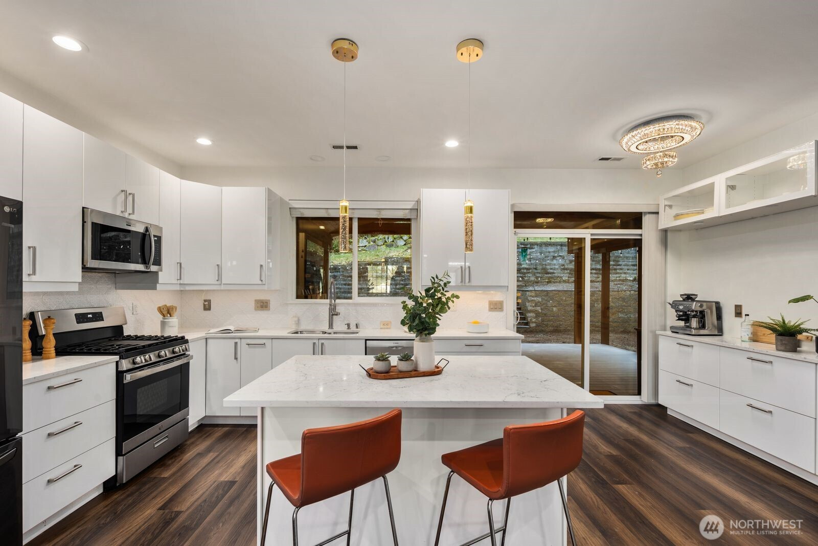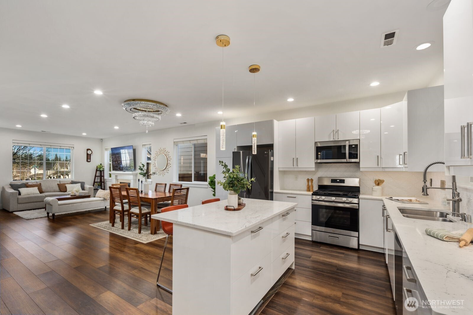 This extensively updated North facing home sits on a quiet street backing to a private greenbelt. The large covered front porch welcomes you into an open, light filled main level with LVP flooring. The 2023 remodeled chef’s kitchen features quartz countertops, stainless steel appliances and an island with seating. It opens to a luxurious covered outdoor patio designed for year round enjoyment, complete with a gas fireplace, built in infrared heat lamps, bar fridge, TV and lighting. The flat fenced backyard offers great privacy. Upstairs offers a spacious landing, a serene primary bedroom with an updated ensuite bath and walk in closet, three additional bedrooms, a guest bath and a laundry room with full washer and dryer. A custom mudroom sits by the half bath and leads to the two car garage with tankless water heater and EV charger. A/C, close to transit, top rated schools, parks and trails.