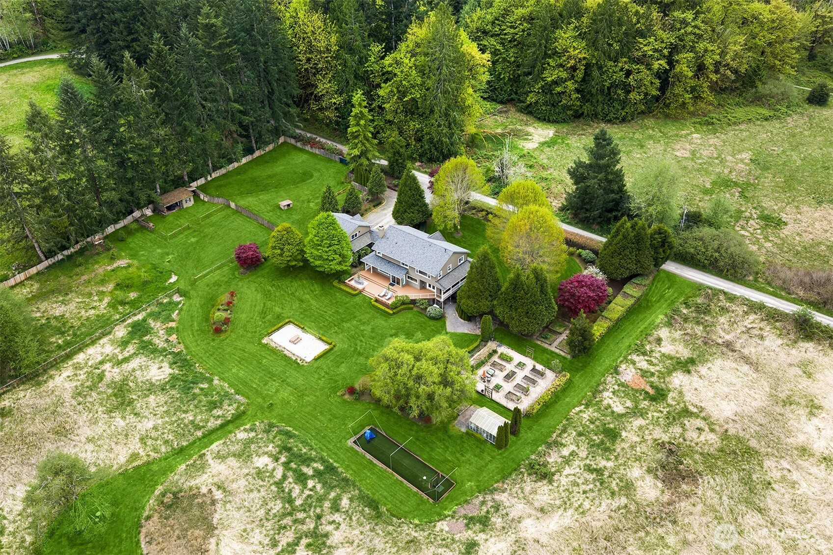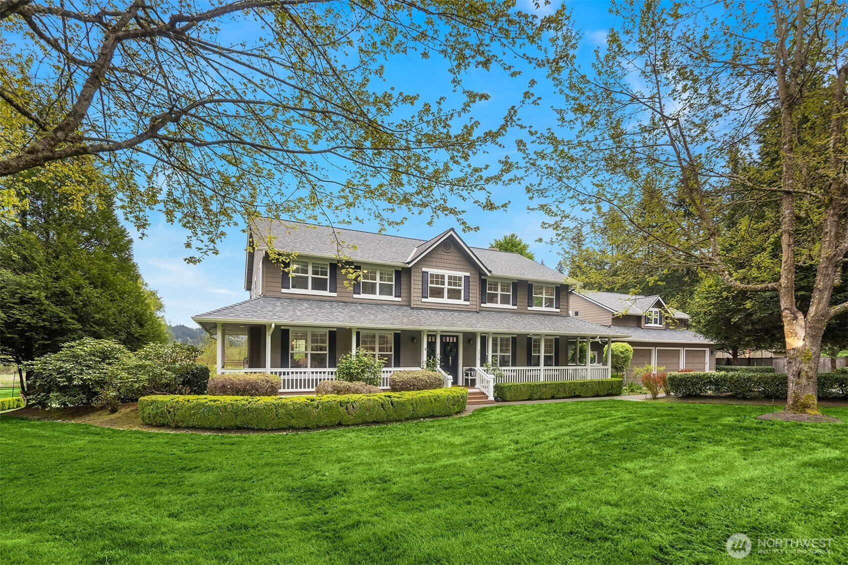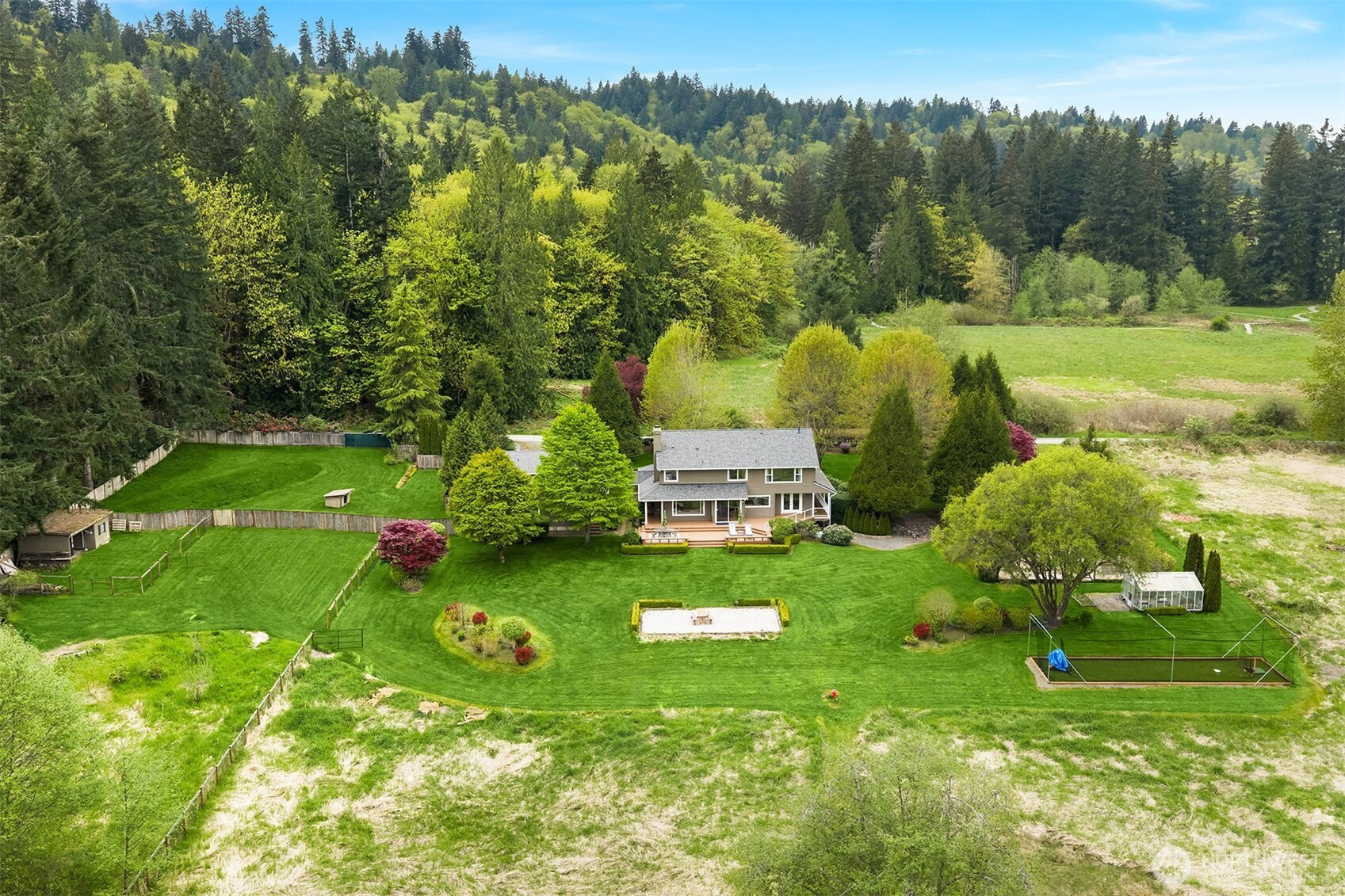 Tucked down a quiet lane, on 5 acres, sits a rare opportunity to enjoy stunning views of Mt Si while living in a one of a kind custom built home. Only the 2nd time on market, this meticulously maintained, custom build offers timeless & elegant finishes. The private, mature property boasts lush landscaping, fruit trees, garden space, a green house, fully fenced pastures & a new batting cage. The flat, usable land offers endless opportunity. Inside, expansive windows offer breathtaking views of nature from every room. The main floor is highlighted by hardwood floors, white wainscoting woodwork, a home office & 2 fireplaces. The Chef's kitchen features stainless steel appliances, a 4 burner range, walk-in-pantry and ample cabinet space. The perfect backdrop for entertaining; enjoy french doors from the dining room & kitchen, both extending to the large wrap around deck. Upstairs; the spacious primary suite boasts mountain views, a walk-in closet & newly remodeled spa like bath w/ radiant floor heat. 2 bedrooms & a functional loft complete the 2nd floor. A covered walkway leads to the detached 3 car garage which includes a studio apartment with private entrance, bedroom, updated full bath, kitchenette & laundry. Equipped with a brand new whole home generator, smart home technology, EV charger and abundant storage throughout, this home is a true retreat from it all with the convenience of shopping, trails & 520 minutes away. Great Lake Washington schools! Welcome Home!