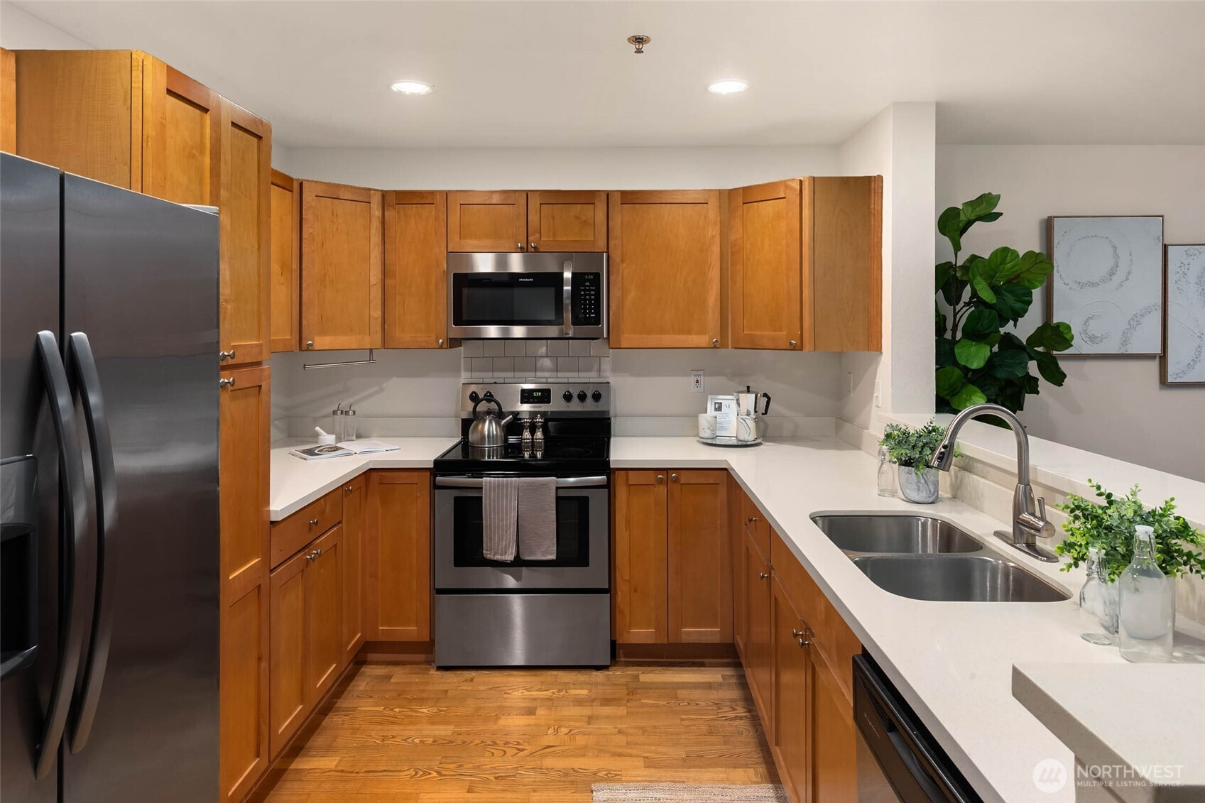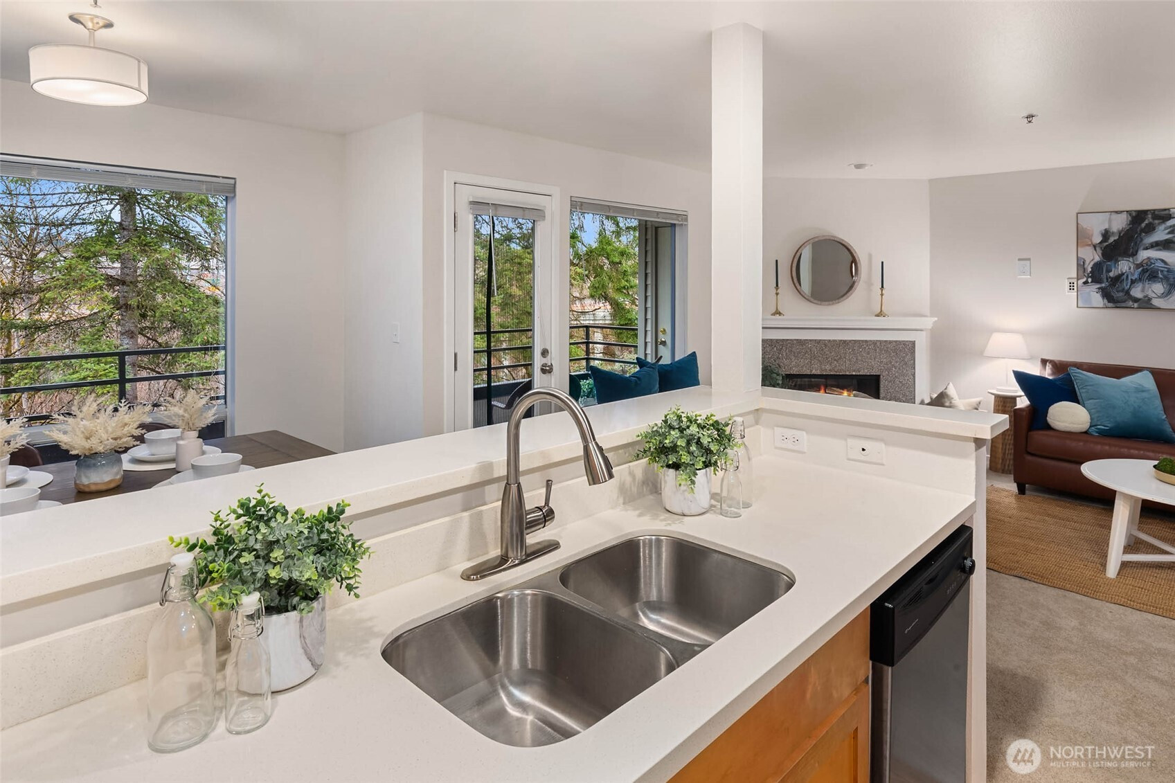 Simplicity in a world of distractions. Just steps from the lake, this beautifully updated and freshly painted, light-filled one-bedroom condo offers the perfect blend of comfort and convenience. Enjoy direct access to the waterfront trail connecting you to Downtown Bellevue and Mercer Slough Nature Park. The open-concept layout is designed for effortless living and entertaining, framed by peaceful westerly views. The kitchen overlooks the walking path and features stainless steel appliances and quartz countertops. The spacious primary suite includes a custom walk-in closet and a dual-vanity bath for everyday ease. Ideally located minutes from Downtown Bellevue and the future South Bellevue Light Rail, with quick access to I-405, I-90, and SR 520. Outdoor enthusiasts will appreciate nearby Mercer Slough Nature Park, the Lake Washington bike loop, the Eastside Rail Corridor, and the Newport Shores boat launch. Pet-friendly with no rental cap, plus one assigned parking space and a private storage unit.