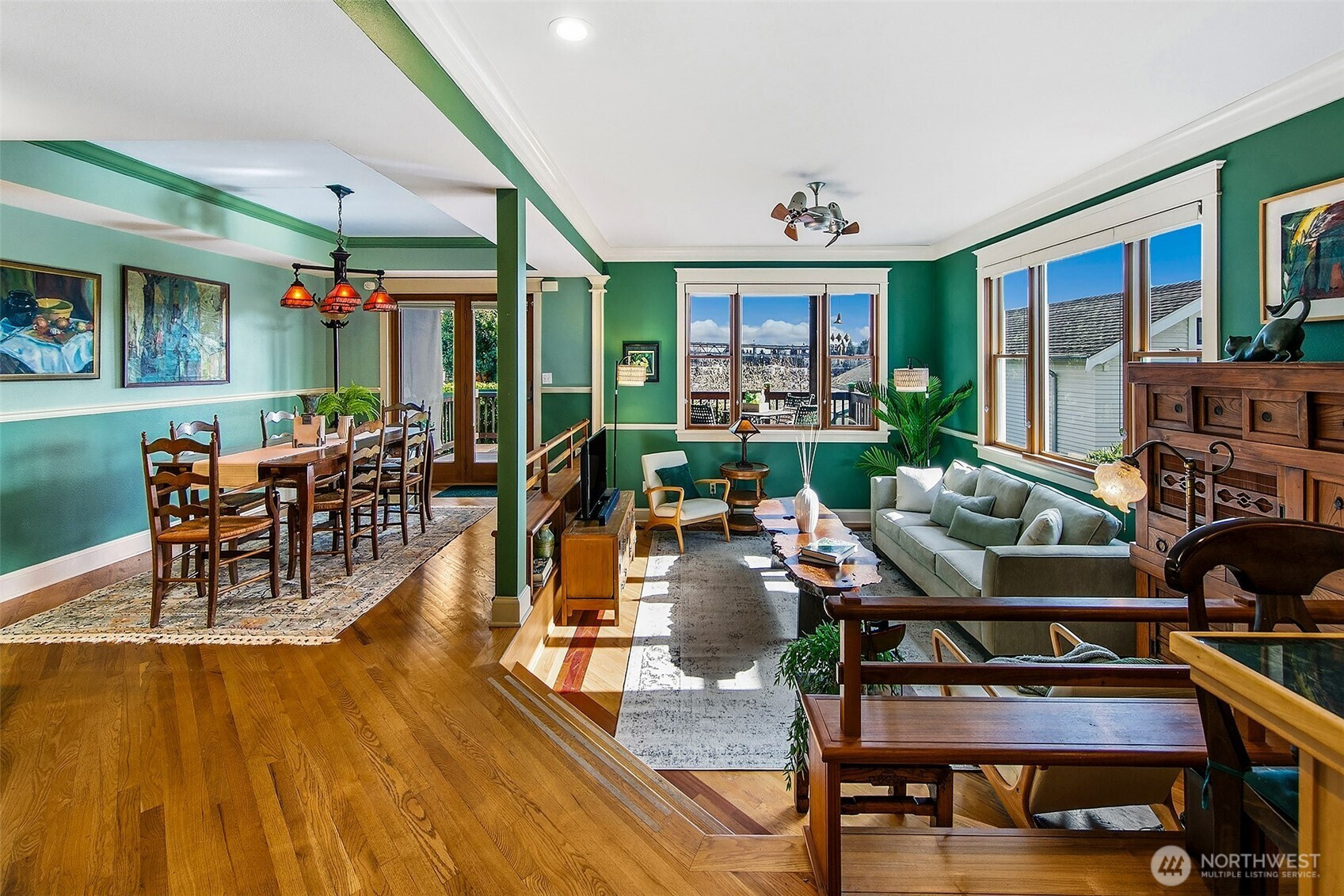 Wake up to sunrise over the Cascades, watch sailboats drift across Lake Union, and end the evening with the Seattle skyline glowing outside your windows. Panoramic views unfold from multiple vantage points throughout this exceptional Wallingford home, where quality craftsmanship feels as special as the setting. Oak hardwood floors, a stunning mahogany inlay sunken family room, and beautiful wood-clad windows and doors create warmth and character rarely found today. The chef’s kitchen, appointed with luxury Viking appliances and maple cabinetry, opens to a spacious great room and view decks designed for gathering and entertaining. The grand primary suite offers views, a large walk-in closet, and private en suite bath, while a free-standing gas fireplace adds comfort to the lower level living area. Flexible living options abound with a legally permitted 620sf front ADU and optional second kitchen — ideal for guests, multigenerational living, rental income, or a private office suite. Three laundry areas make everyday living effortless. Outside, the property becomes a private retreat with rare clear-grain virgin cedar decks, a welcoming front porch, and a park-like backyard featuring three ponds, waterfall, stream, and greenhouse. Plus, solar panels reduce electric bills by a ton. An absolute oasis in the city. Generous driveway and off-street parking, thoughtful materials throughout, and an unbeatable location complete a home that is not just beautiful, but truly unforgettable.