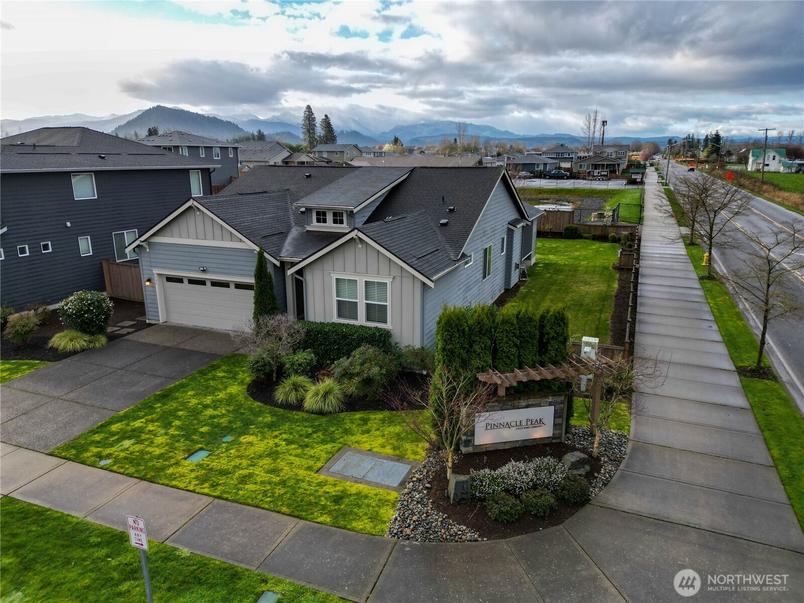Imagine waking up to Mount Rainier literally in your backyard! This beautiful Enumclaw home on a spacious corner lot offers breathtaking, front-row mountain views. The thoughtful layout features 2 bedrooms plus a versatile den/office (functioning as a 3rd bedroom) to ensure you have the dedicated workspace or guest room you need. The heart of the home is a gourmet kitchen boasting quartz countertops, a large island, stainless steel appliances, microwave, and a 5 burner gas cooktop. Natural light floods the inviting great room, highlighting the warm luxury vinyl plank flooring and cozy gas fireplace. Step outside to your private oasis: the light-filled dining area leads to a covered patio featuring an outdoor fireplace and privacy screens all the way around—creating the perfect "outdoor room" for year-round relaxation with a stunning mountain backdrop. The primary suite serves as a true retreat with a walk-in closet and a well-appointed bath featuring a dual-sink vanity and glass-enclosed shower. Additional highlights include a fully fenced yard with a sprinkler system, a dedicated laundry room, and a 2-car attached garage. Combining unmatched views with modern functionality.