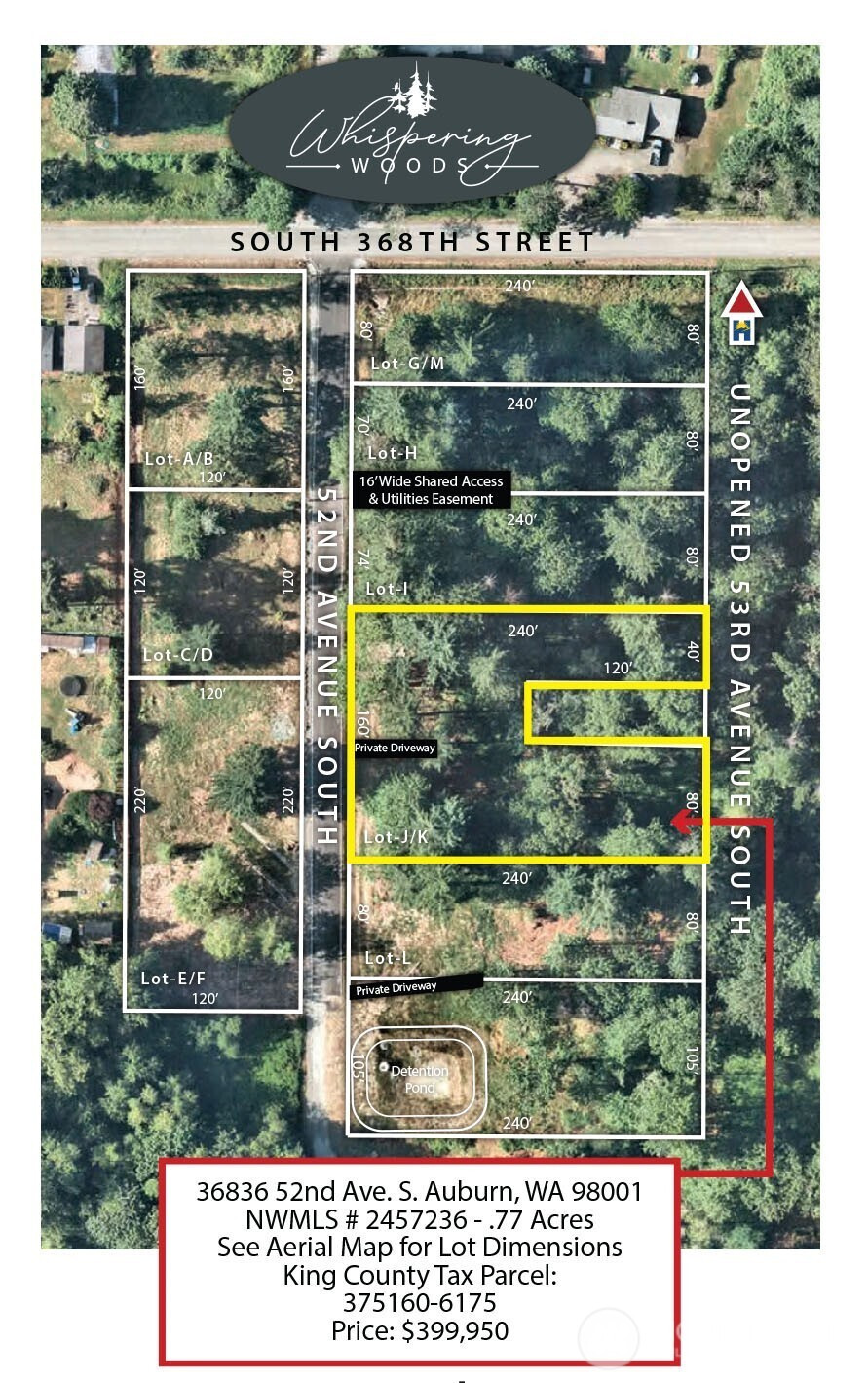 Whispering Woods Estates (“WWE”) is an entitlement-approved large-lot community on Auburn’s desirable West Hill in S. King County, situated just north of the City of Edgewood. This thoughtfully planned eight (8) lot neighborhood spans 4.49 acres and delivers privacy, certainty, and long-term value. WWE offers convenient commuter access to I-5, Hwy 167, Hwy 18, and a 10-minute drive to Milton Safeway, Starbucks, Federal Way Costco, medical services, dining, and parks. Lot JK is .77 acres and measures 160' by 240', less 40' x 120' Lot 21, Blk 136. The westerly .44 acres of Lot JK is buildable; the easterly .33 acres is a greenbelt buffer. Undevelopable 53rd Ave S runs parallel to the easterly .33 acres of Lot JK. Lot JK benefits from developer-completed entitlement work, including drainfield/storm engineering, surveys, and county approvals. This entitlement work eliminates buyer capital risk while accelerating financing, design, permitting, and construction timelines. Buyers may design/build independently as an owner-contractor or work with a designer/builder referral from the developer. King County Council vote set for 5/17/26 (V-2735): Whether to vacate 52nd Ave S (S 368th–S 370th) and enable HOA to pursue gated access to WWE. Drainfield design for Lot JK approved 3/31/25. Lakehaven Water and PSE power are available along 52nd Ave S. HOA documents, Bylaws, and CCRs were drafted to maintain consistent architecture, building standards, and long-term property values.