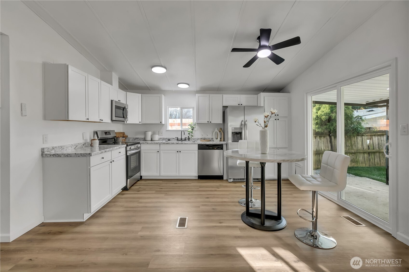 Hurry on this incredible opportunity—affordable manufactured home priced to sell! located in Desirable Sunnydale this light-filled home offers a spacious open layout with vaulted ceilings that create an airy, expansive feel throughout. Featuring 3 bedrooms and 2 full baths, the floor plan is both functional and inviting. The kitchen is equipped with stainless steel appliances—including range, microwave, dishwasher, and refrigerator—and flows seamlessly into the generous living area, making it ideal for everyday living and entertaining. Beautiful newer flooring and abundant natural light enhance the warm, welcoming interior. Step outside to a large yard with endless potential—perfect for gardening, fruit trees, outdoor living spaces, or simply enjoying the open space. Plenty of off-street parking adds convenience. Move-in ready and full of value, this home is a fantastic opportunity for homeowners or investors alike. Also, the Park has an outdoor pool which opens around Memorial Day and closes during colder season. Larger dogs are allowed, the park does not have a weight limit, but does have breed restrictions. There are basketball courts for recreation as well. Don’t follow your map once into the development. Follow the directions below given when in the development for accuracy to find home.