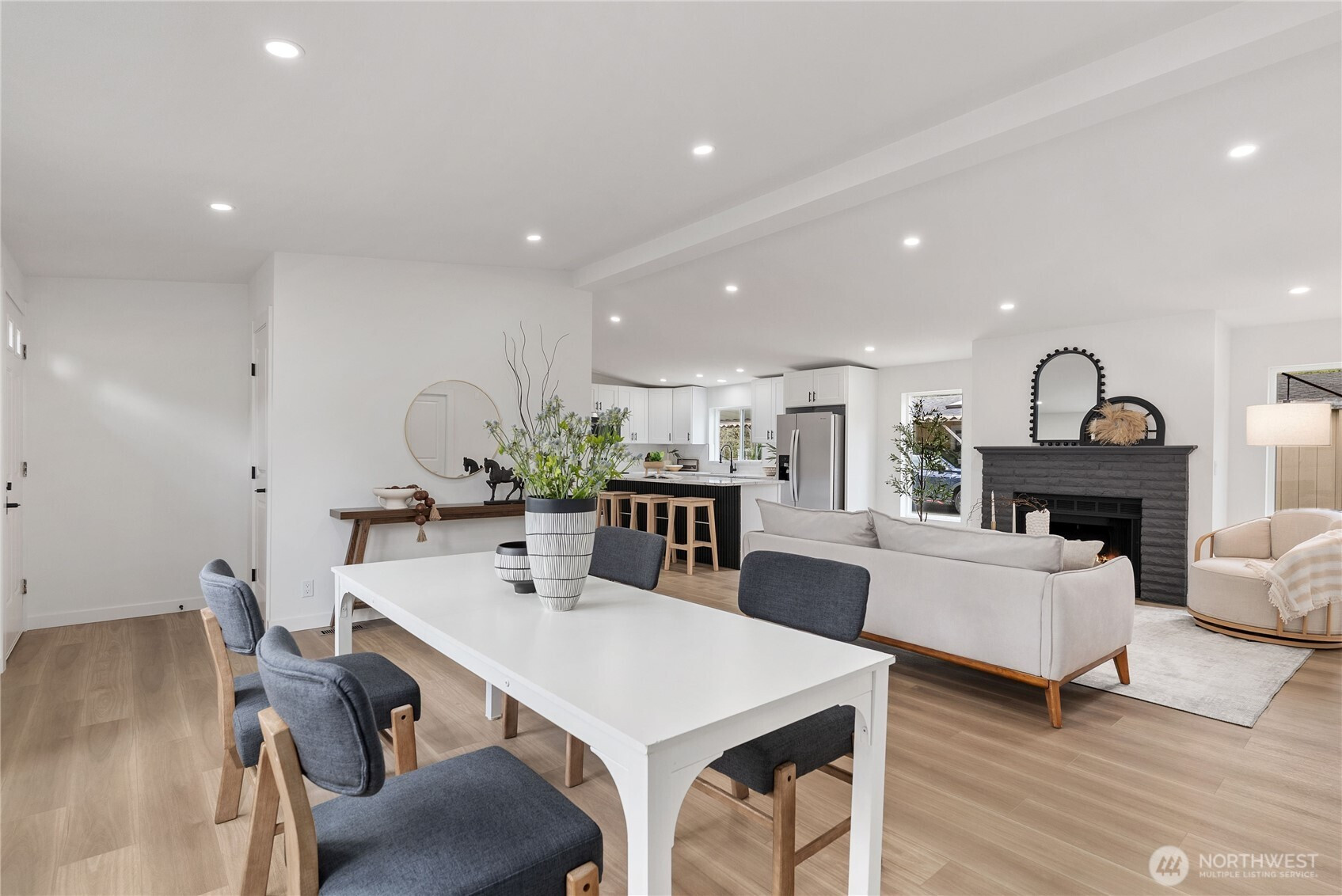 Welcome to the sought-after Sunnydale all-age community, offering fantastic amenities including a pool, clubhouse, basketball court, and playground. This beautifully updated home features 4 bedrooms and 2 bathrooms with an inviting open-concept layout and vaulted ceilings that create a bright and spacious feel throughout. The living room is warm and welcoming with a cozy wood-burning fireplace. The stunning kitchen has been fully updated with stainless steel appliances, quartz countertops, a sleek island, and a custom backsplash—perfect for both everyday living and entertaining. The oversized primary suite offers a walk-in closet and a luxurious ensuite bathroom with custom tile work, double vanity, soaking tub, and separate shower. Three additional generously sized bedrooms and a stylish guest bathroom provide plenty of space. New Roof. Convenient laundry room includes a new water heater. Outside, enjoy a covered awning and extra storage with a shed. Ideally located close to shopping, dining, and major freeways, this home combines comfort, style, and convenience. Must see!