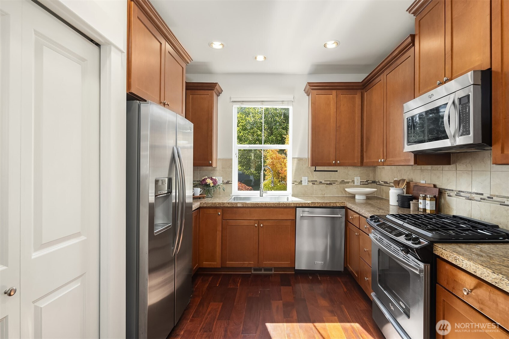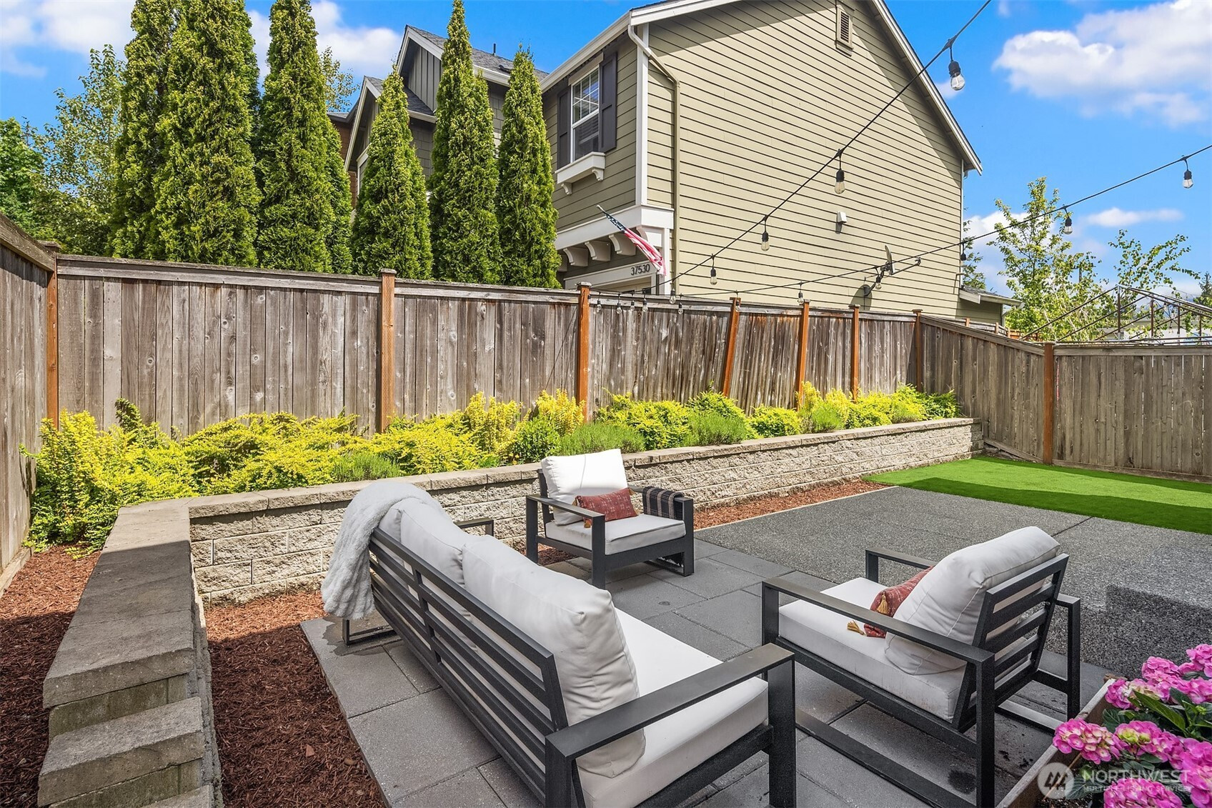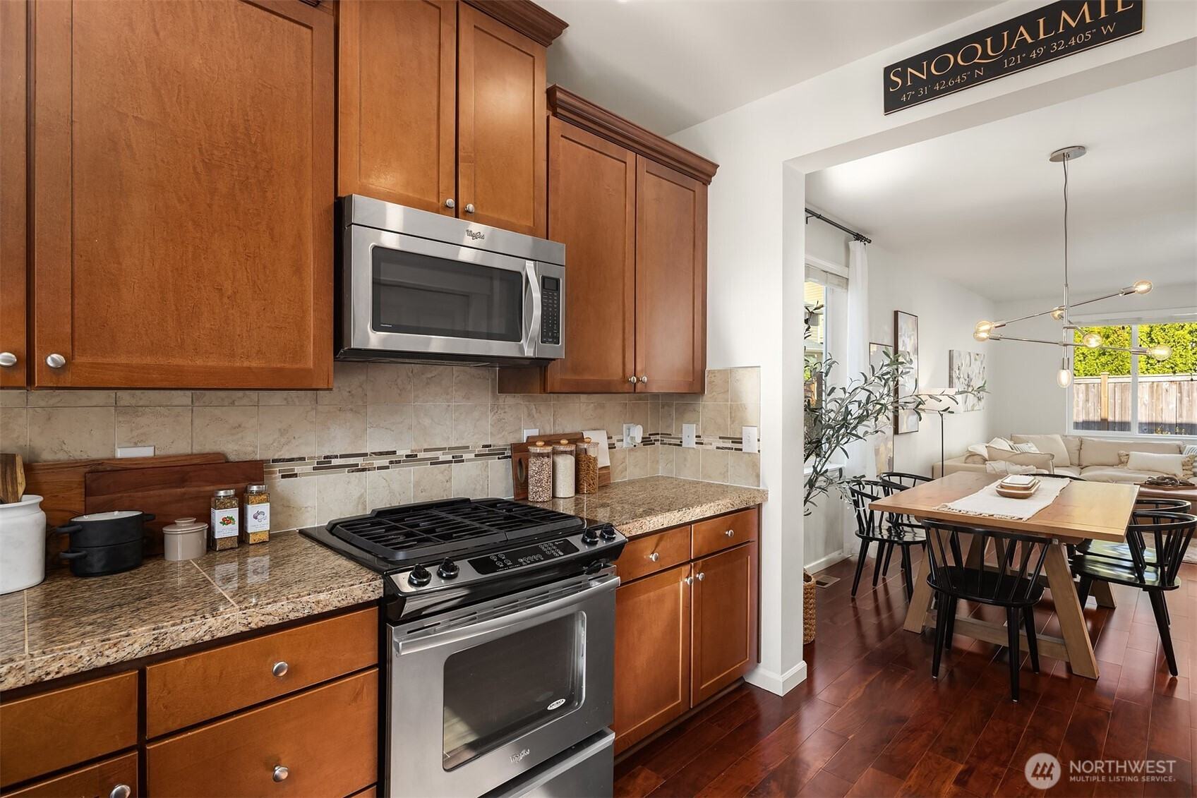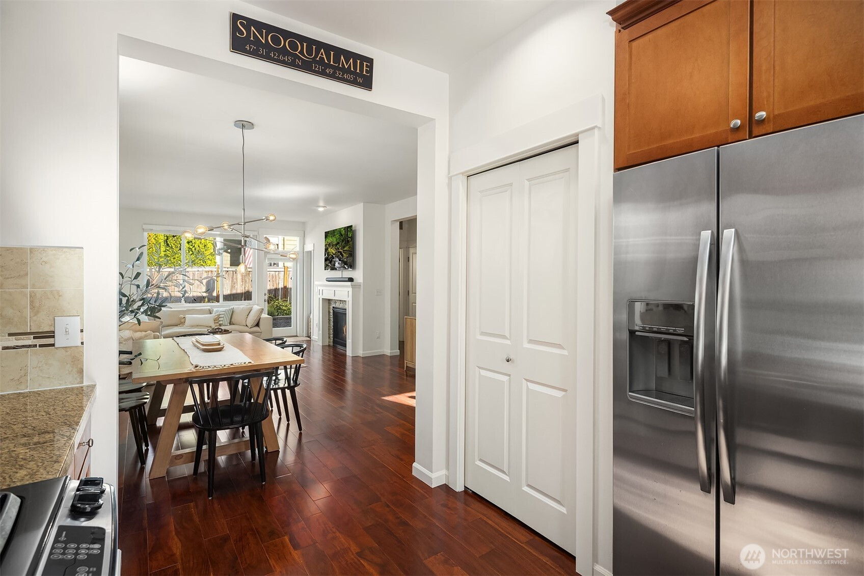 Step inside to soaring ceilings, warm hardwoods, and a cozy fireplace that set the tone for this inviting Snoqualmie Ridge retreat. The kitchen offers granite counters, stainless appliances, a gas cooktop, and rich cabinetry—ideal for everyday meals or casual entertaining. Upstairs, the primary suite includes two closets and a spa-like 5-piece bath, joined by two additional bedrooms, a full guest bath, and a versatile flex space. Exceptional woodworking details add timeless character. Outside, the turf backyard with lush landscaping provides a low-maintenance space for play, pets, or gatherings. With A/C, trails, parks, and the vibrant Ridge community at your doorstep, this home blends comfort, functionality, and adventure.