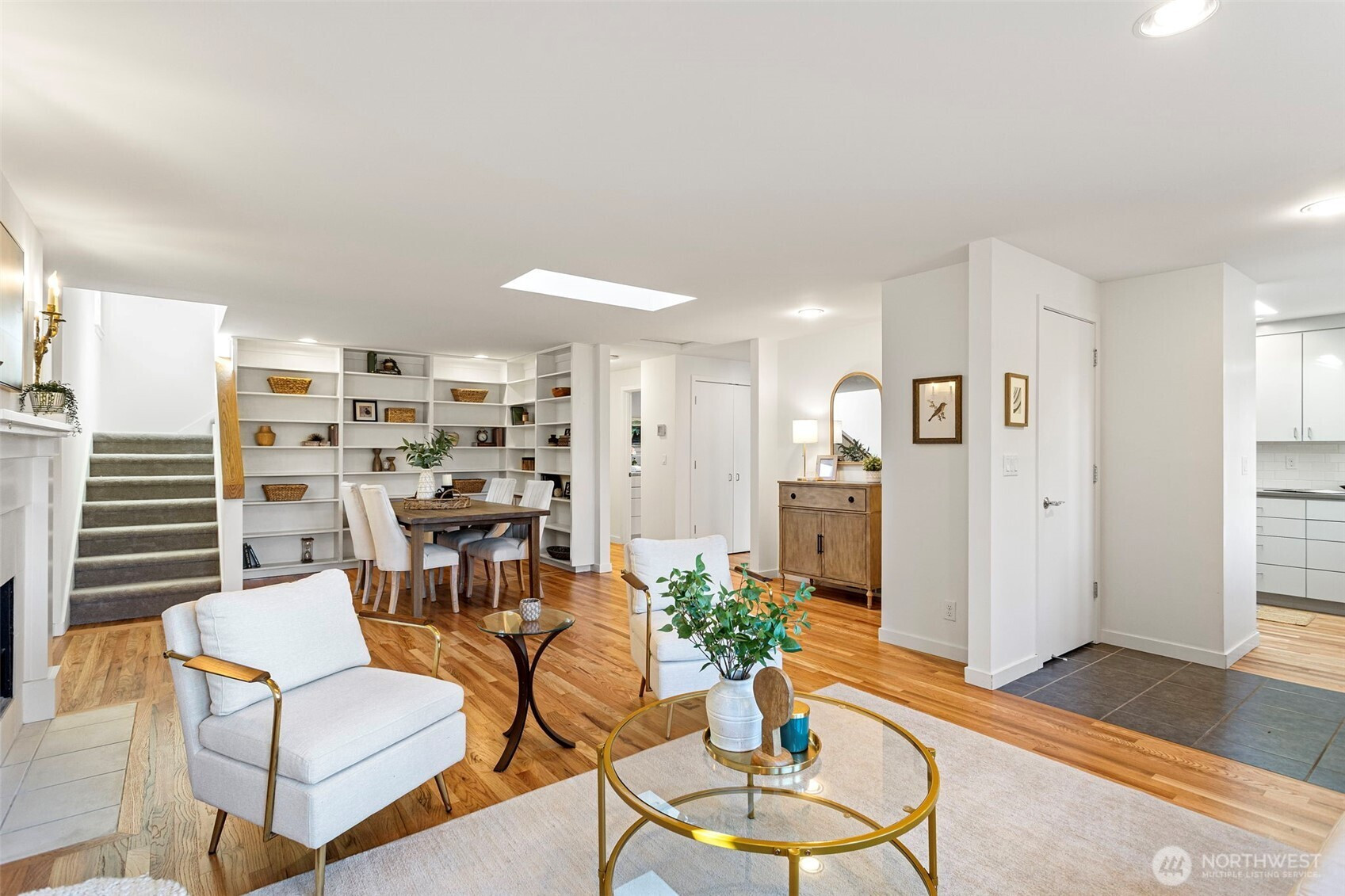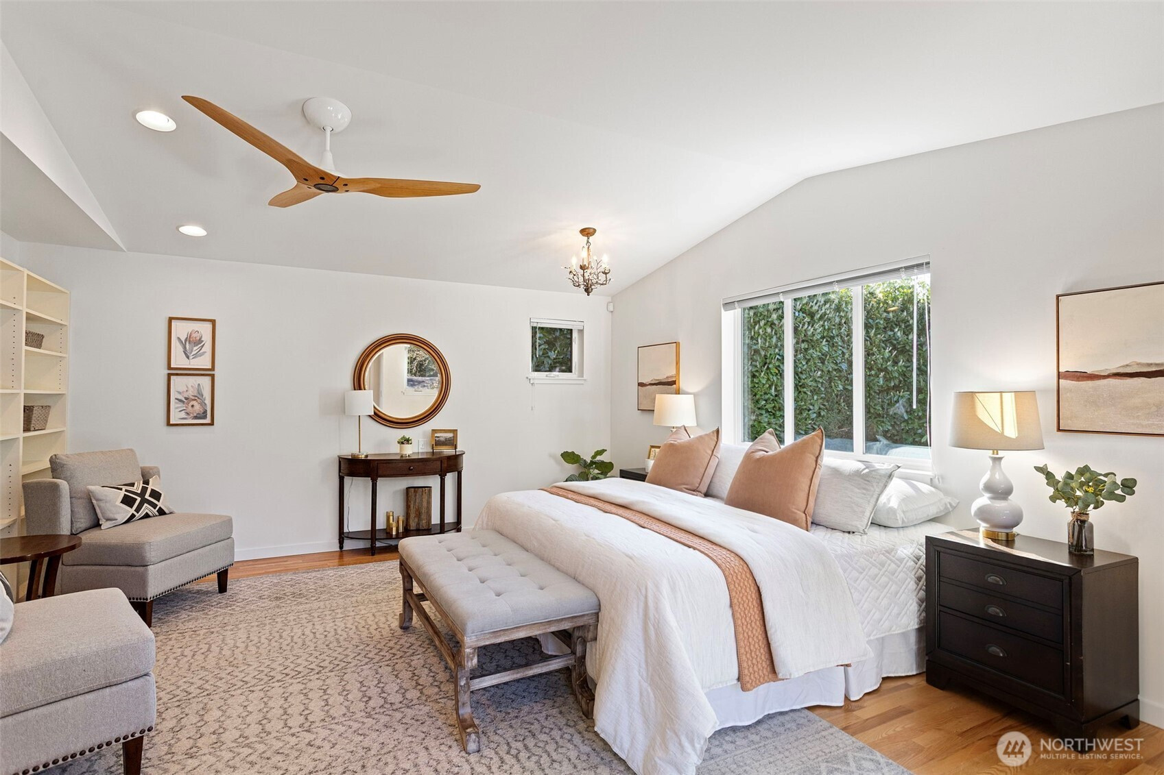 This beautifully reimagined 1955 Bryant home blends timeless mid-century charm with thoughtful modern expansion. A desirable main-floor layout features a stunning updated chef kitchen, convenient main-level bedroom suite, 2nd bedroom & bathroom, all while preserving the home’s original character. Upstairs features a 2nd primary suite & bedroom/office, creating flexible or multi-generational living. Enjoy the stunning Mt. Rainier view from the upstairs! Space & flow are maximized throughout with custom built-ins that add both beauty & smart storage. An additional eating nook seamlessly connects to outdoor living, making everyday life & entertaining effortless. The former garage has been converted into a versatile workshop, complemented by a separate laundry/utility room. The backyard is designed for gathering & relaxation, featuring a newer hot tub & an enchanting little reading cottage. Solar panels & A/C provide energy efficiency & year-round comfort. Ideally located in highly desirable Bryant with easy access to parks, playfields, & Magnuson Park. Enjoy walkability to nearby shops & eateries, sought-after schools, and an easy commute in every direction. A rare opportunity to own a beautifully expanded mid-century home in one of NE Seattle’s most beloved neighborhoods. This is more than a house — it’s a place to gather, grow & truly feel at home.