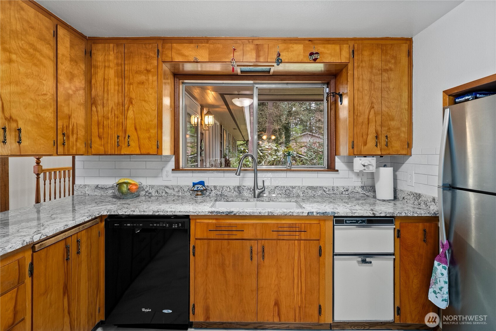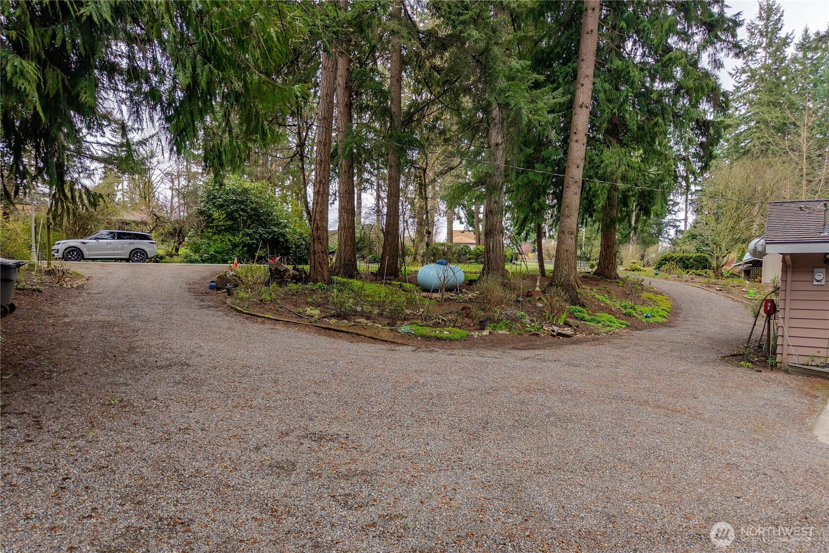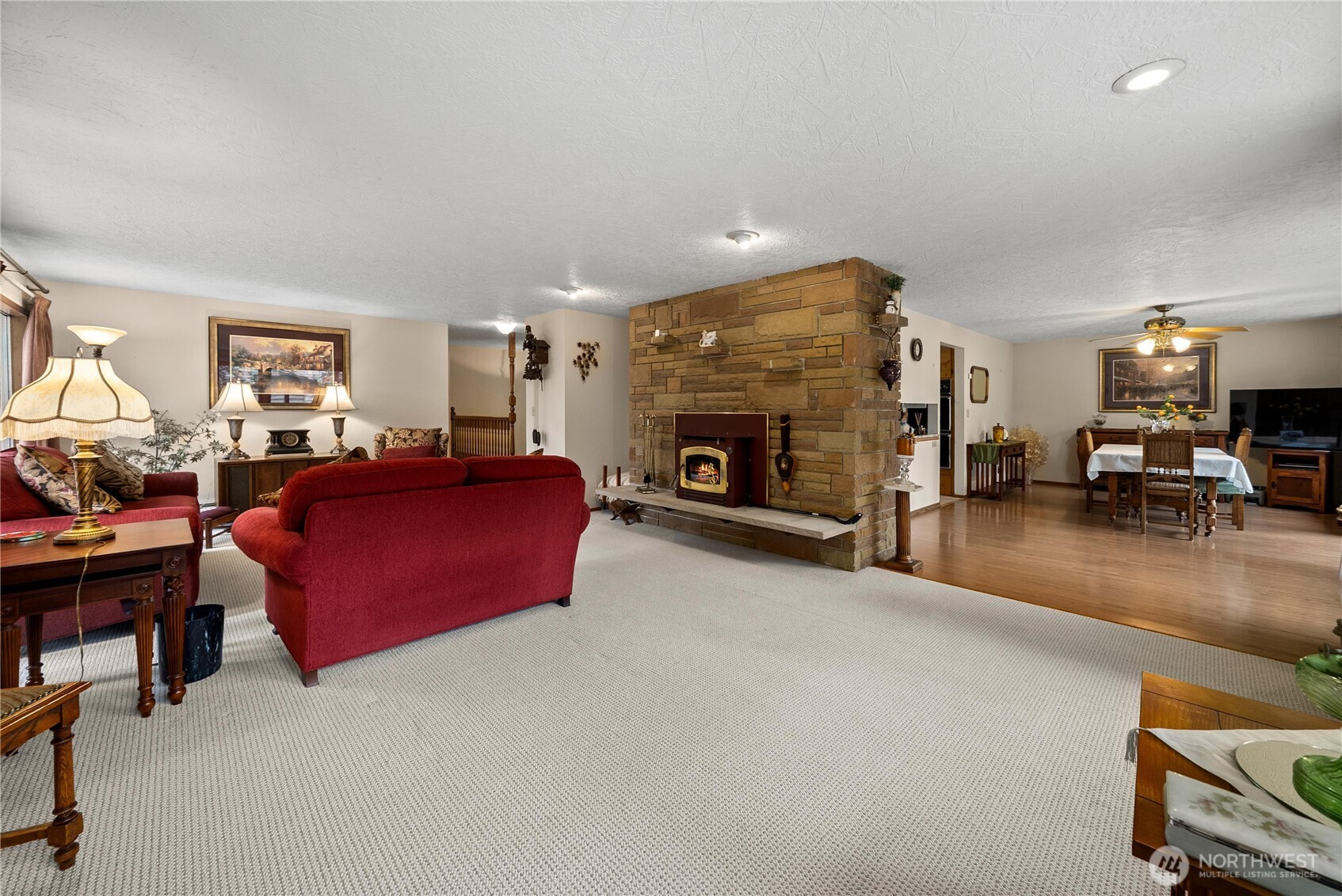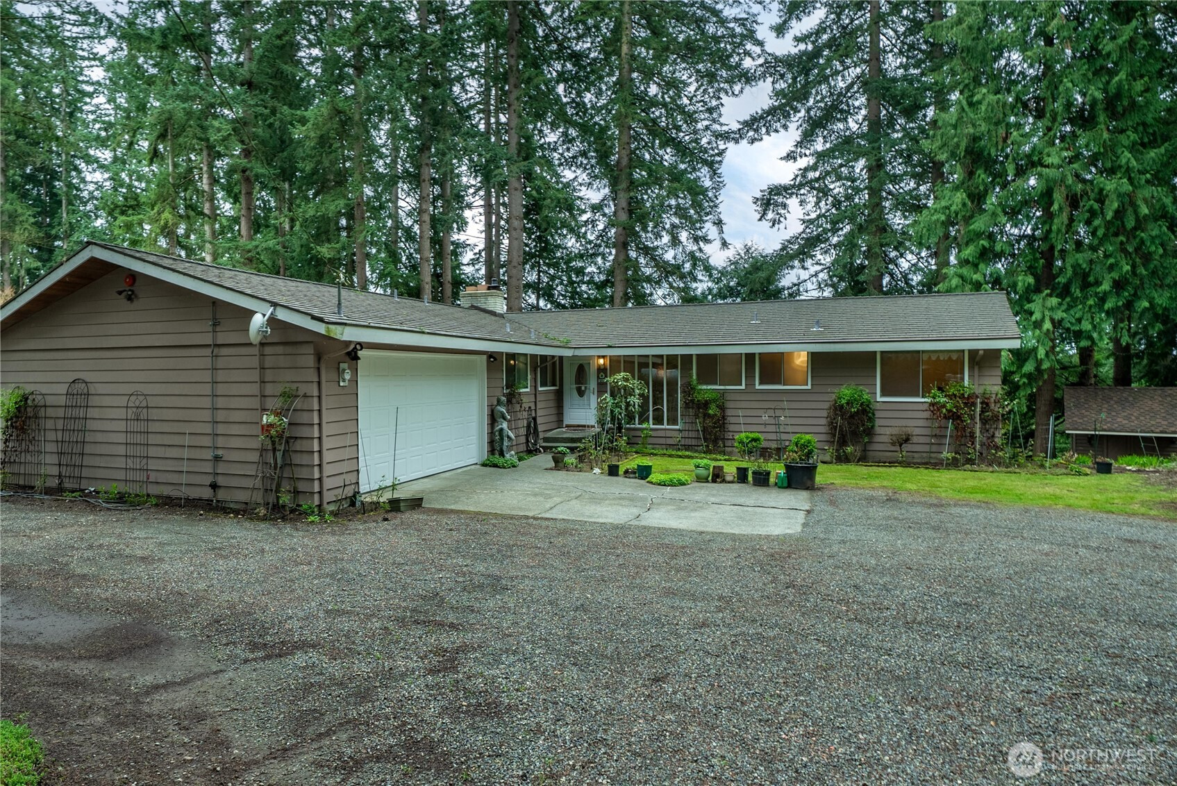 Welcome to this well-built 3,440 sqft, 5 bedroom rambler with a fully furnished daylight basement, ideally located on a quiet dead-end street and set on a shy 1-acre (.96 acre) private retreat. A circular driveway welcomes you to a slate entry, opening into an expansive living and dining area anchored by a cozy wood-burning fireplace. The main level features a well-appointed kitchen with granite countertops, along with 3 bedrooms and 1.5 baths. The lower level offers excellent potential for separate living quarters, complete with a full kitchen with granite counters, new stainless steel appliances and breakfast bar, spacious living room with wood fireplace insert, dining area, full bath, 2 additional bedrooms, and a versatile finished bonus room - perfect for multi-generational living or flexible space. Enjoy brand new propane radiant hot water heat throughout, plus peace of mind with a whole-home generator. The exterior was freshly painted just 3 years ago, enhancing both curb appeal and longevity. Step outside to a wrap-around deck and attached greenhouse for year-round enjoyment. The grounds are truly special, featuring fruit trees, roses, lush gardens, and majestic mature trees. Additional highlights include a 3-stall barn, 24X22 detached shop, utility shed, and a brand new 5-bedroom septic system. A rare combination of space, function, and serene setting--this property has it all.